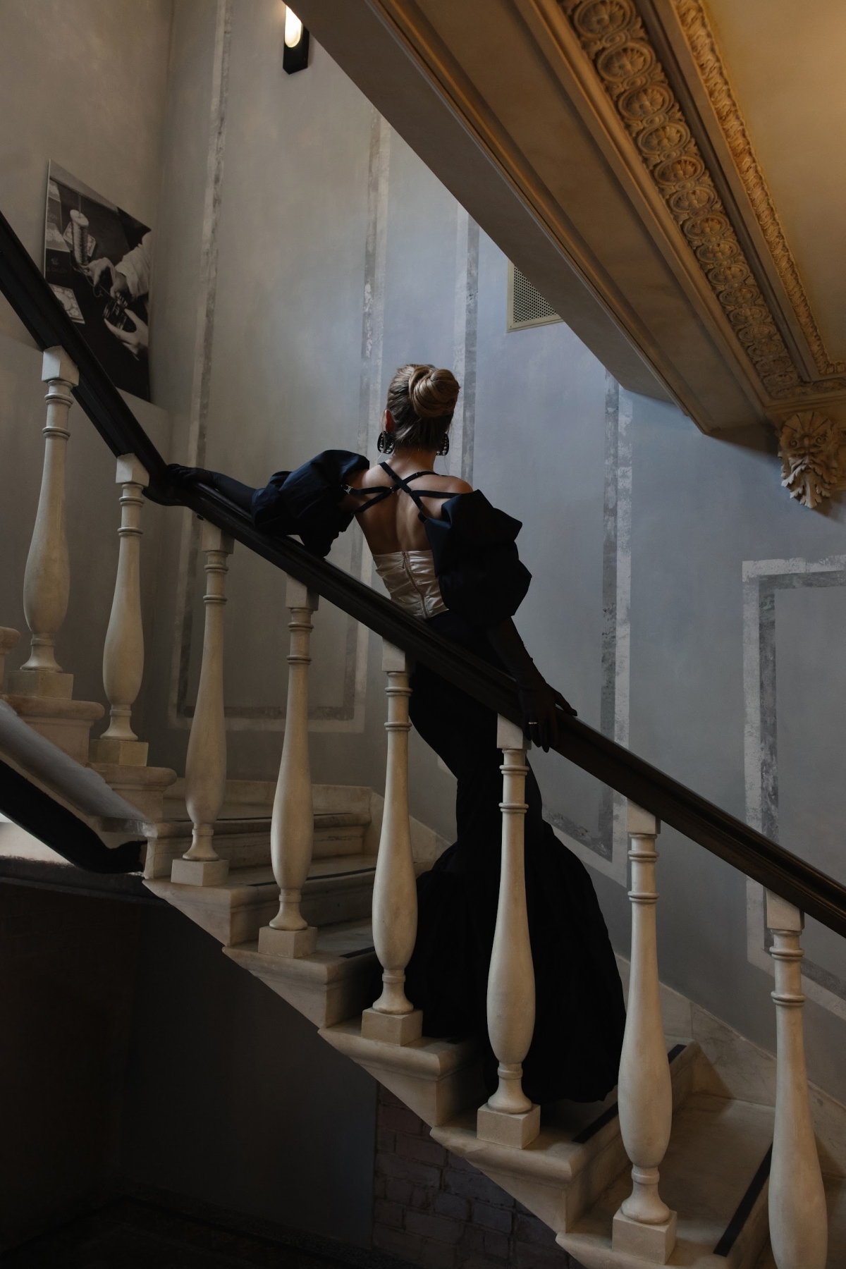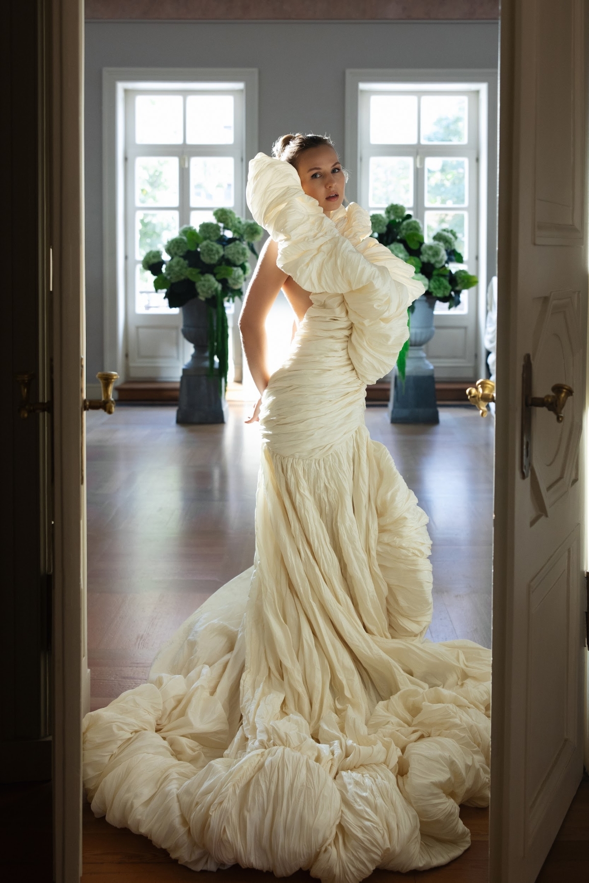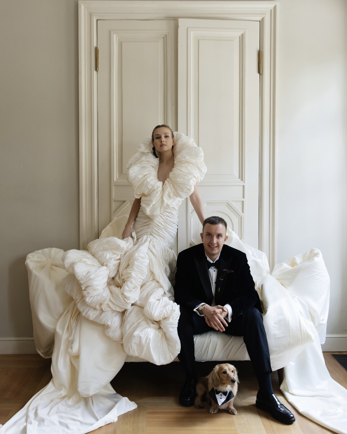 Fashion-бэкграунд повлиял на все — от выбора дресс-кода до декора. И, конечно, мне хотелось особенный образ — актуальный и вне времени, с эффектом «вау». Выбор пал на платье Murashka: помню, как увидела одну из первых съемок с ним, и сердце екнуло. Я настолько была в этом уверена, что после приезда из Японии первым делом записалась на примерку и сразу оплатила пошив, даже не рассматривая другие варианты. Концепцию декора разрабатывали под это платье. Немного переживала из-за его популярности: к тому времени уже было несколько медийных выходов. Тогда бренд предложил сделать его в особом оттенке молочного крема — получилась уникальная вариация, платье действительно смотрелось иначе. Я дополнила его моно-серьгой в виде антуриума из Poison Drop. Нечаянно наткнулась на этот аксессуар и сразу поняла, что он идеально впишется. Черная матовая серьга и кремовое пышное платье создали гармоничный контраст. Дополняли образ черные лаковые мюли Giuseppe Zanotti. Мне не нравится классическая белая свадебная обувь, поэтому контраст с черным добавил образу праздничности и перекликался с выбором жениха: нам нравилась идея, что мы оба в черных лаковых туфлях.