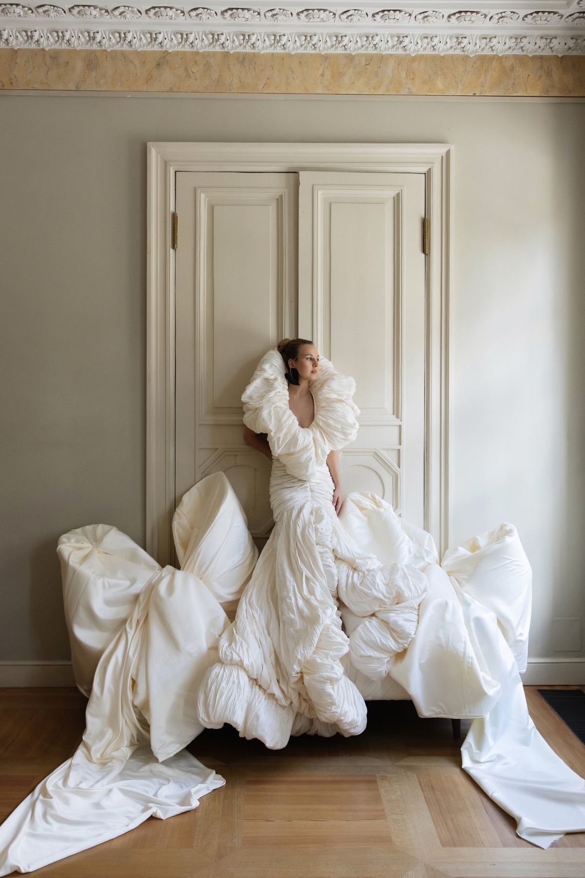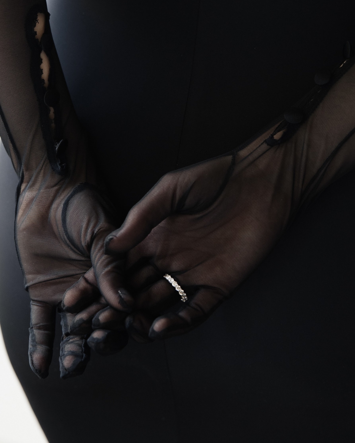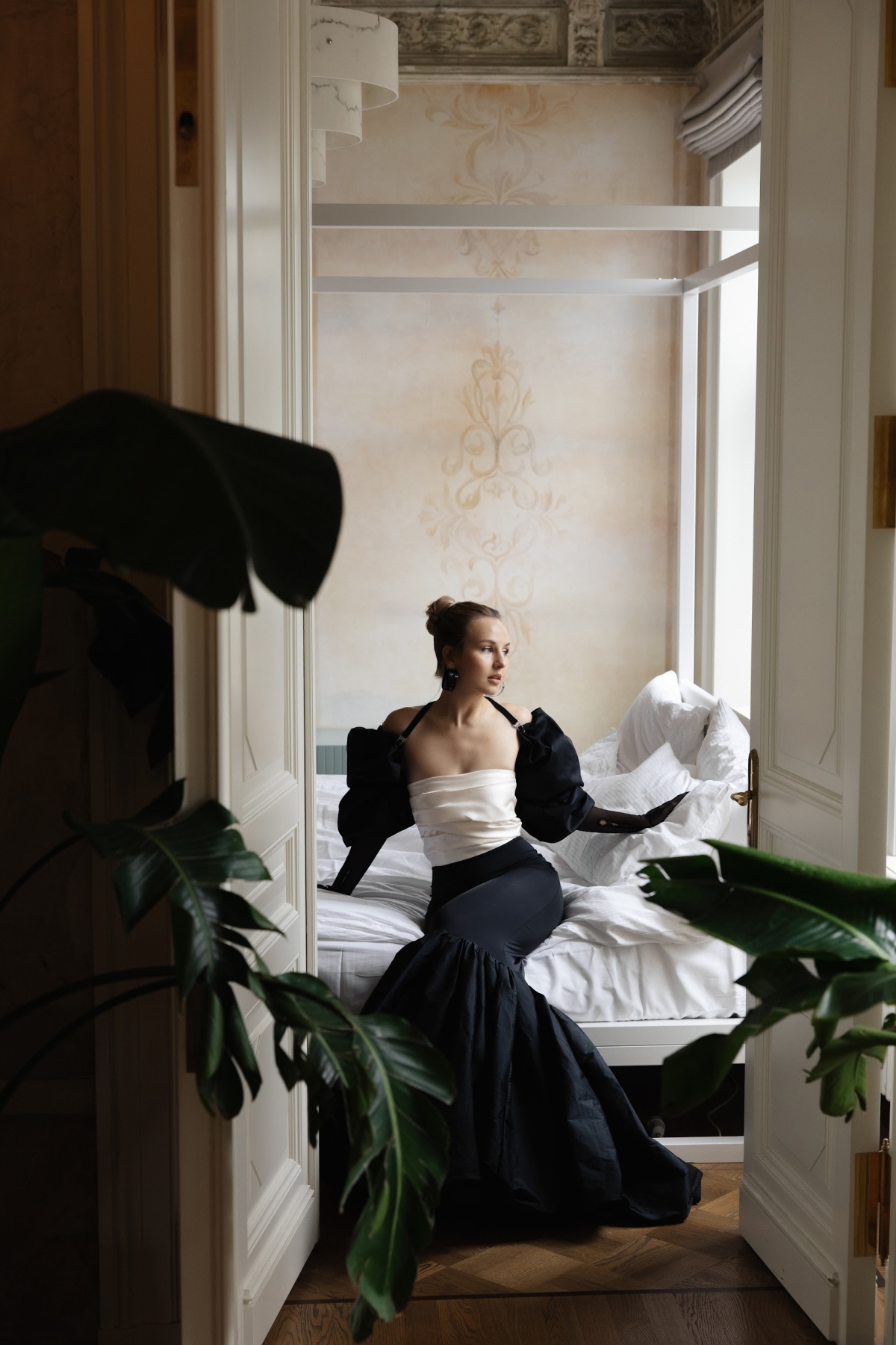 Долго не могла определиться с образом утра невесты. Знала, что не хочу использовать будуарную эстетику, склонялась к нарядному низу и простому верху. В последний момент увидела юбку Munique из черной тафты и поняла, что это то, что нужно. Моя швея сшила к ней топ из молочной тафты. Образ я завершила перчатками из тафты Say No More и серьгами Alaïa.