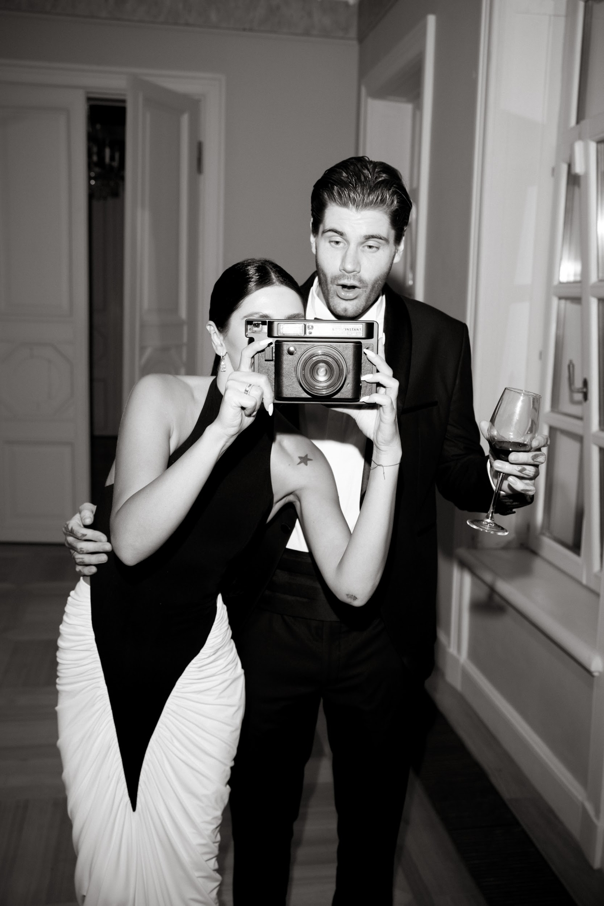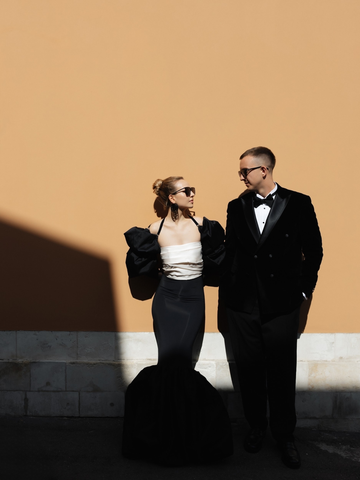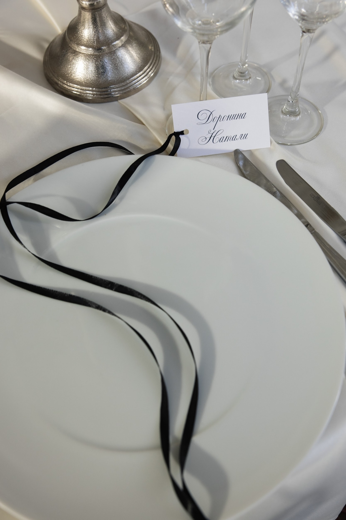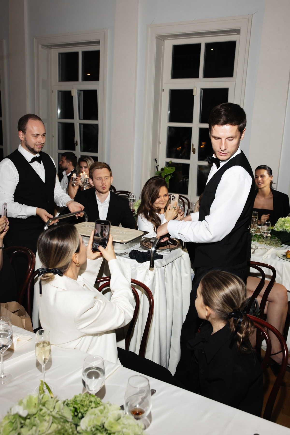 Я разработала дресс-код в черно-белой гамме — универсальной, эффектной на фотографиях и удобной для гостей. Из опыта подготовки клиентов к свадьбам в пастельной палитре знала, как сложно самим найти подходящий наряд: большинство брендов шьют вещи только в базовых тонах. Поэтому выбор оказался очевидным, и все гости выдержали его безупречно. Мужчин попросили прийти в смокингах. Для удобства я подготовила style guide: для дам собрала идеи нарядов на любой бюджет, а для мужчин — список мест, где можно арендовать, купить или заказать костюм.