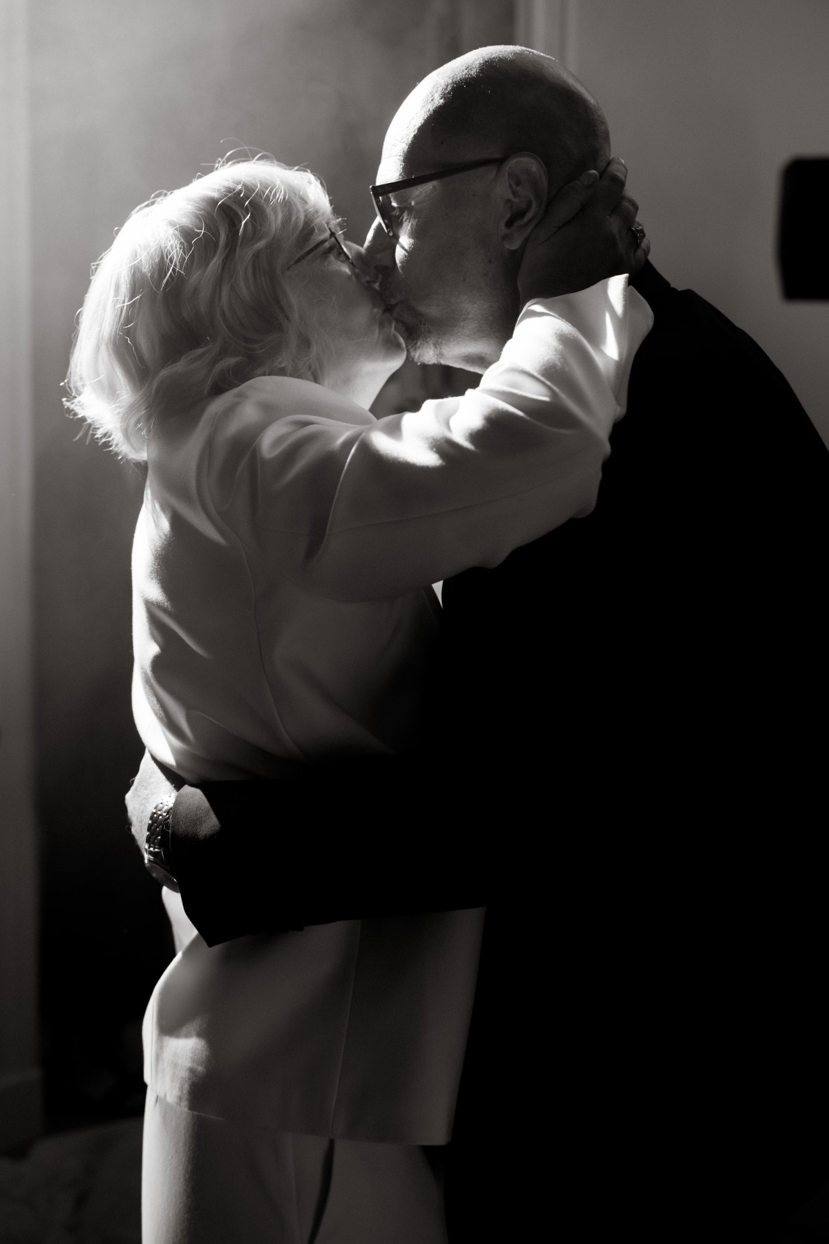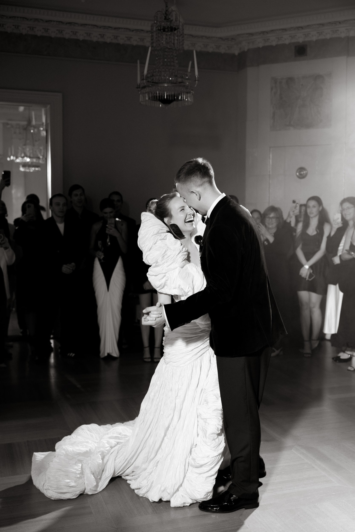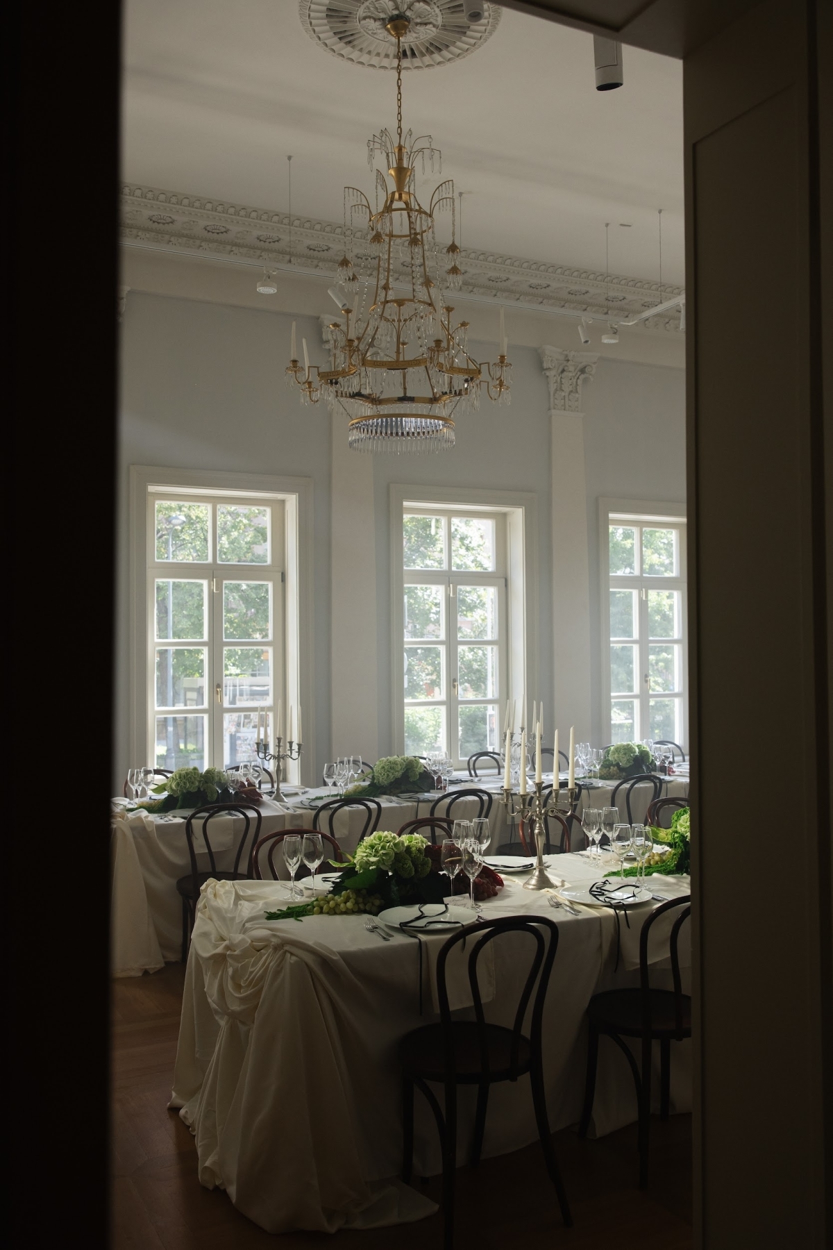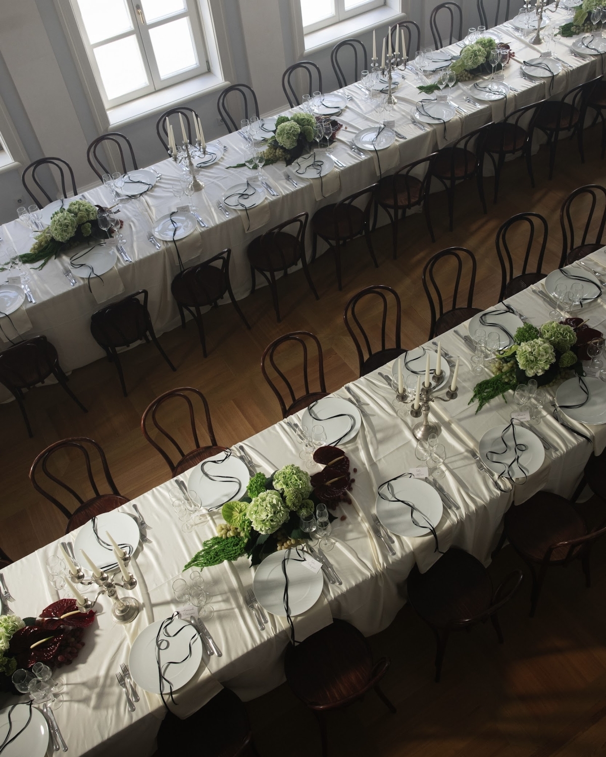 Я разработала дресс-код в черно-белой гамме — универсальной, эффектной на фотографиях и удобной для гостей. Из опыта подготовки клиентов к свадьбам в пастельной палитре знала, как сложно самим найти подходящий наряд: большинство брендов шьют вещи только в базовых тонах. Поэтому выбор оказался очевидным, и все гости выдержали его безупречно. Мужчин попросили прийти в смокингах. Для удобства я подготовила style guide: для дам собрала идеи нарядов на любой бюджет, а для мужчин — список мест, где можно арендовать, купить или заказать костюм.