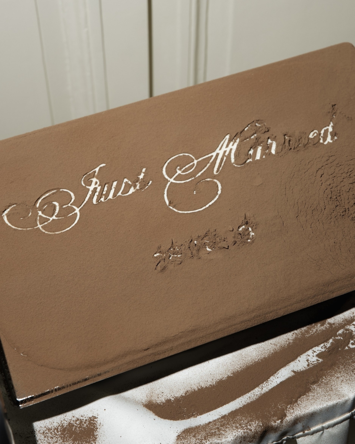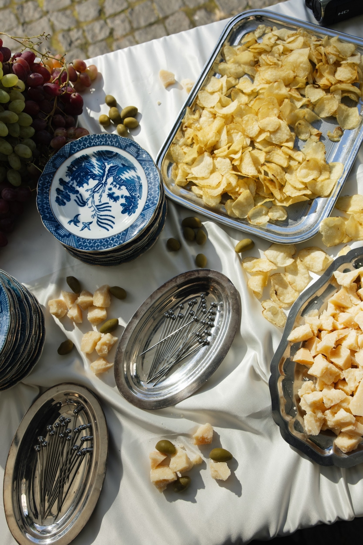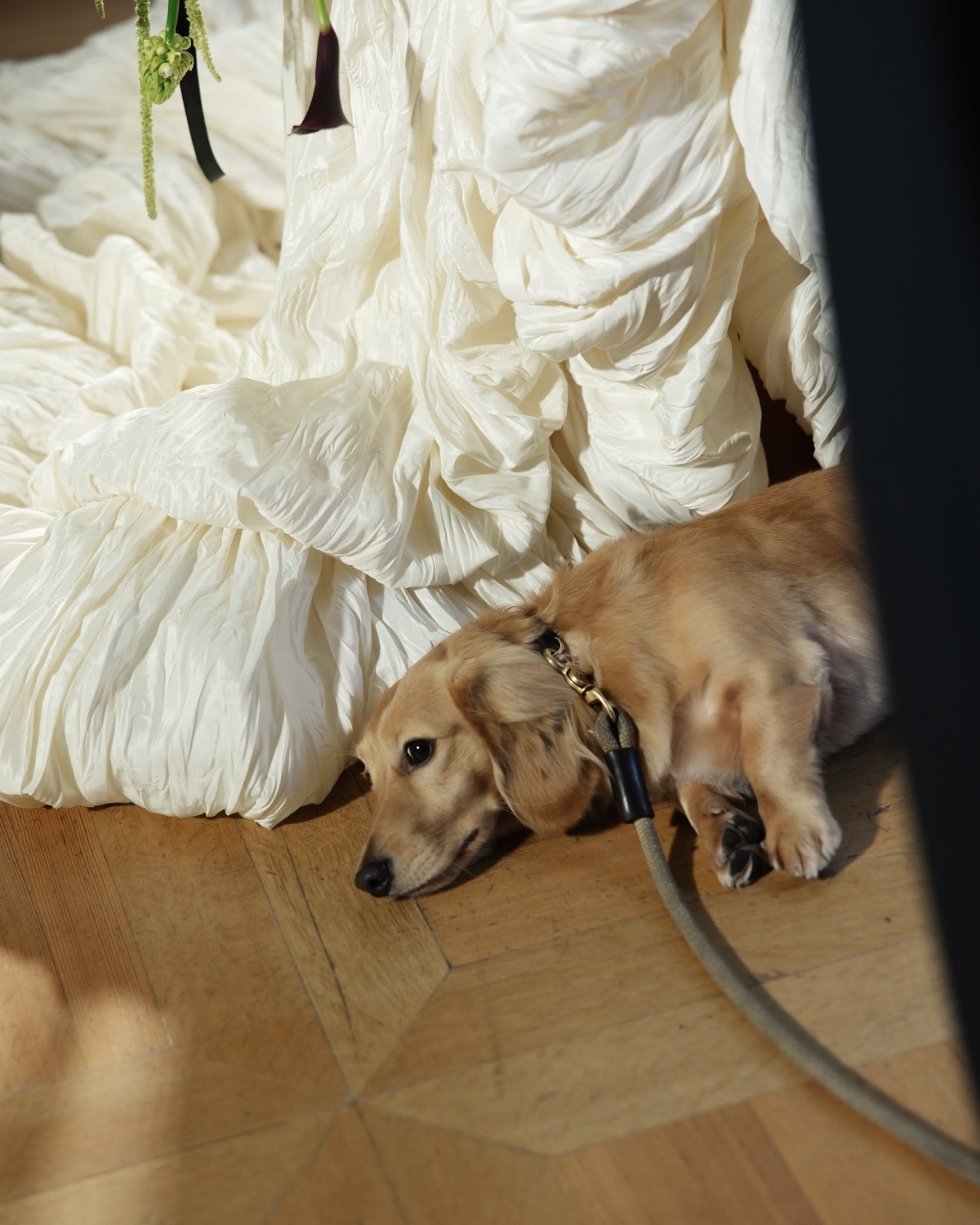 90% декора были винтажными. Я покупала предметы на «Авито», в антикварных лавках, на барахолках в Москве; сестра искала детали в Париже. Была принципиальная установка: никаких маркетплейсов — только винтаж или аренда. Папа отреставрировал антикварный столик для фотозоны, отчим жениха привез из Умбрии несколько килограммов пармезана для вэлкома, с ним — чипсы, оливки и виноград. Мы сделали курительную зону с любимыми сигаретами друзей и итальянскими сигарами, оформили фирменные зажигалки строчкой из нашей свадебной песни, смастерили кушетку с бантами из тафты. Наша кремовая длинношерстная такса — Рафаэль — был шафером в смокинге по дресс-коду.