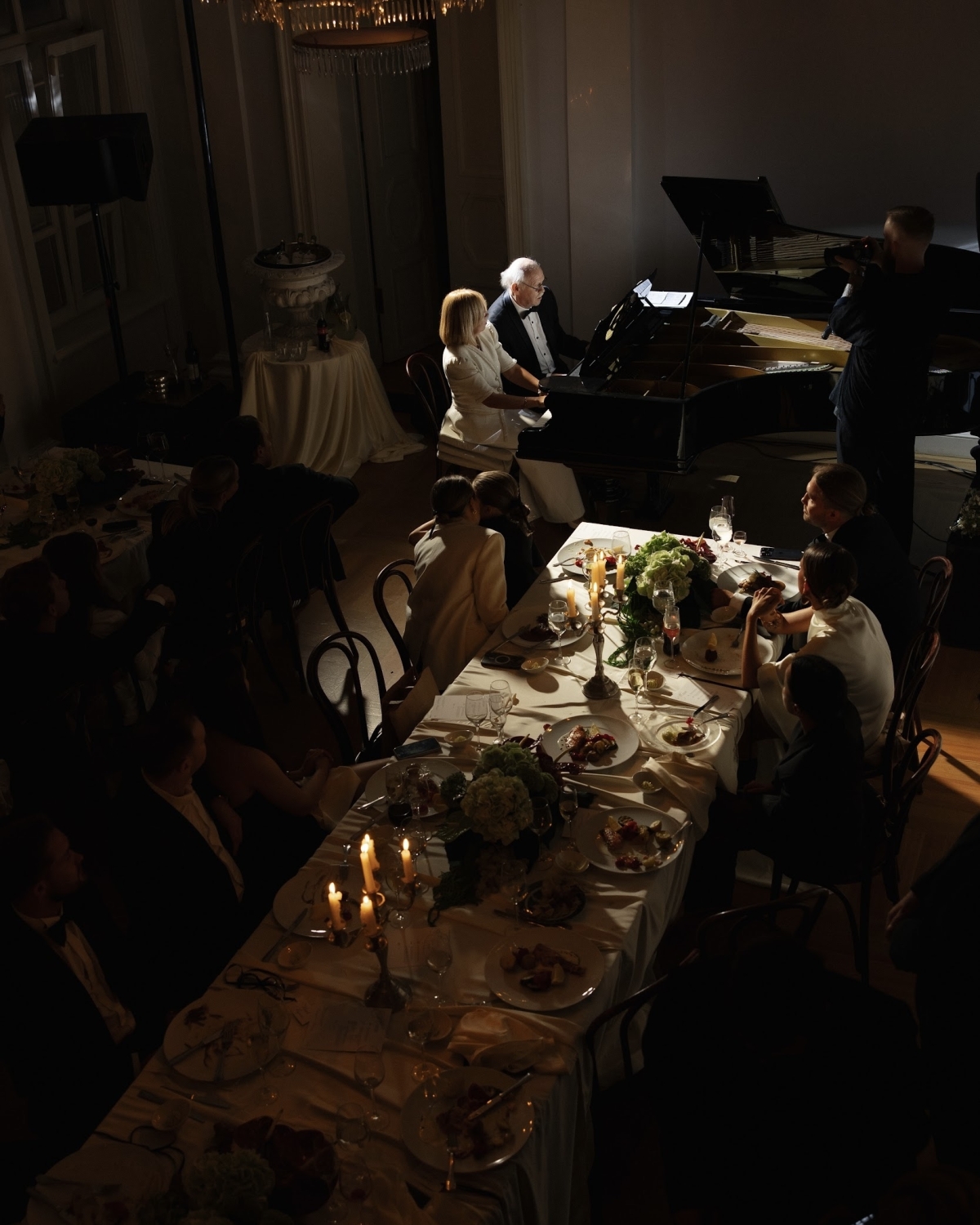 И, конечно, музыка. Это был безумно музыкальный вечер! Играла любимая группа с нашим дорогим другом во главе — ВИА «Пролетарское танго». Ребята исполняют советские песни и не только; мы часто с друзьями бываем на их концертах, поэтому на свадьбе все знали тексты и зажигали под живое исполнение. Моя мама и отчим, профессиональные пианисты, исполнили несколько произведений на рояле и завершили выступление легендарной музыкой из к/ф «Мужчина и женщина». Их игра тронула всех без исключения. Завершили вечер караоке у рояля: все пели, а отчим сел вторым за инструмент, и музыка еще больше заполнила стены усадьбы.