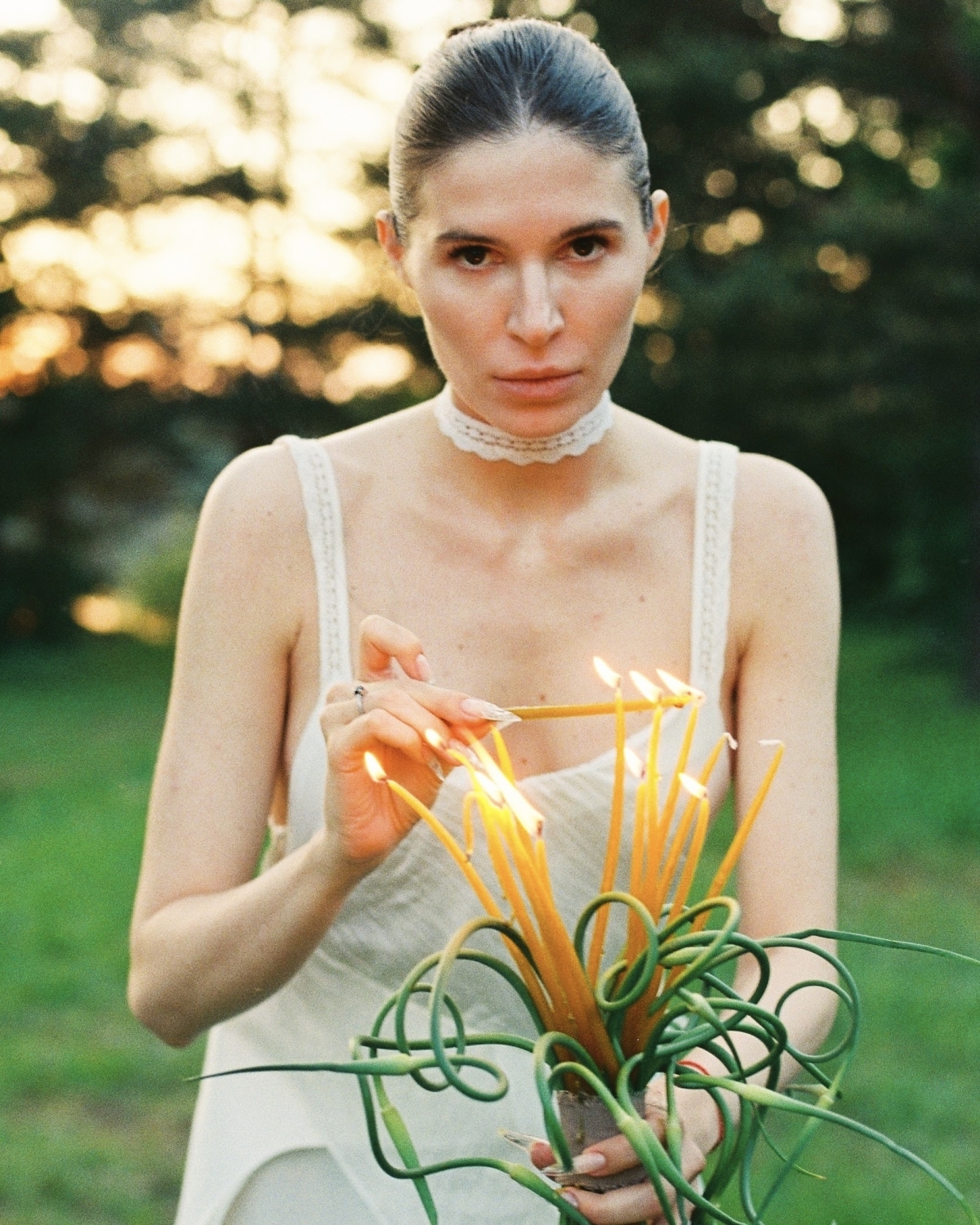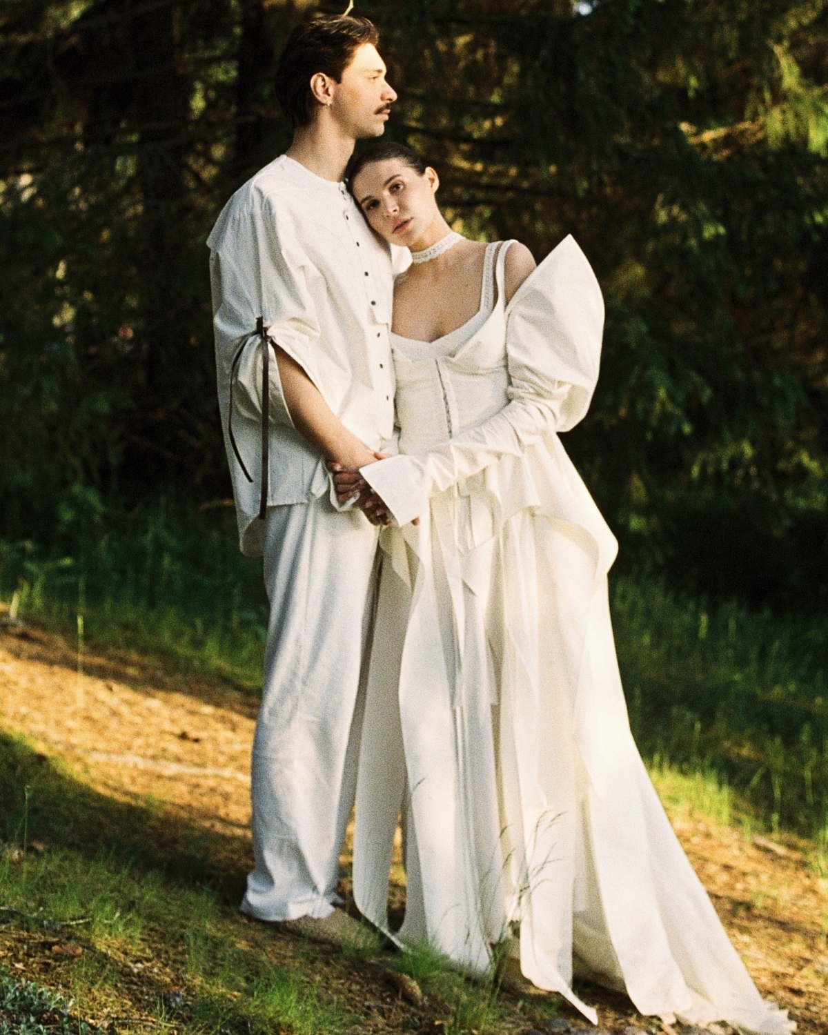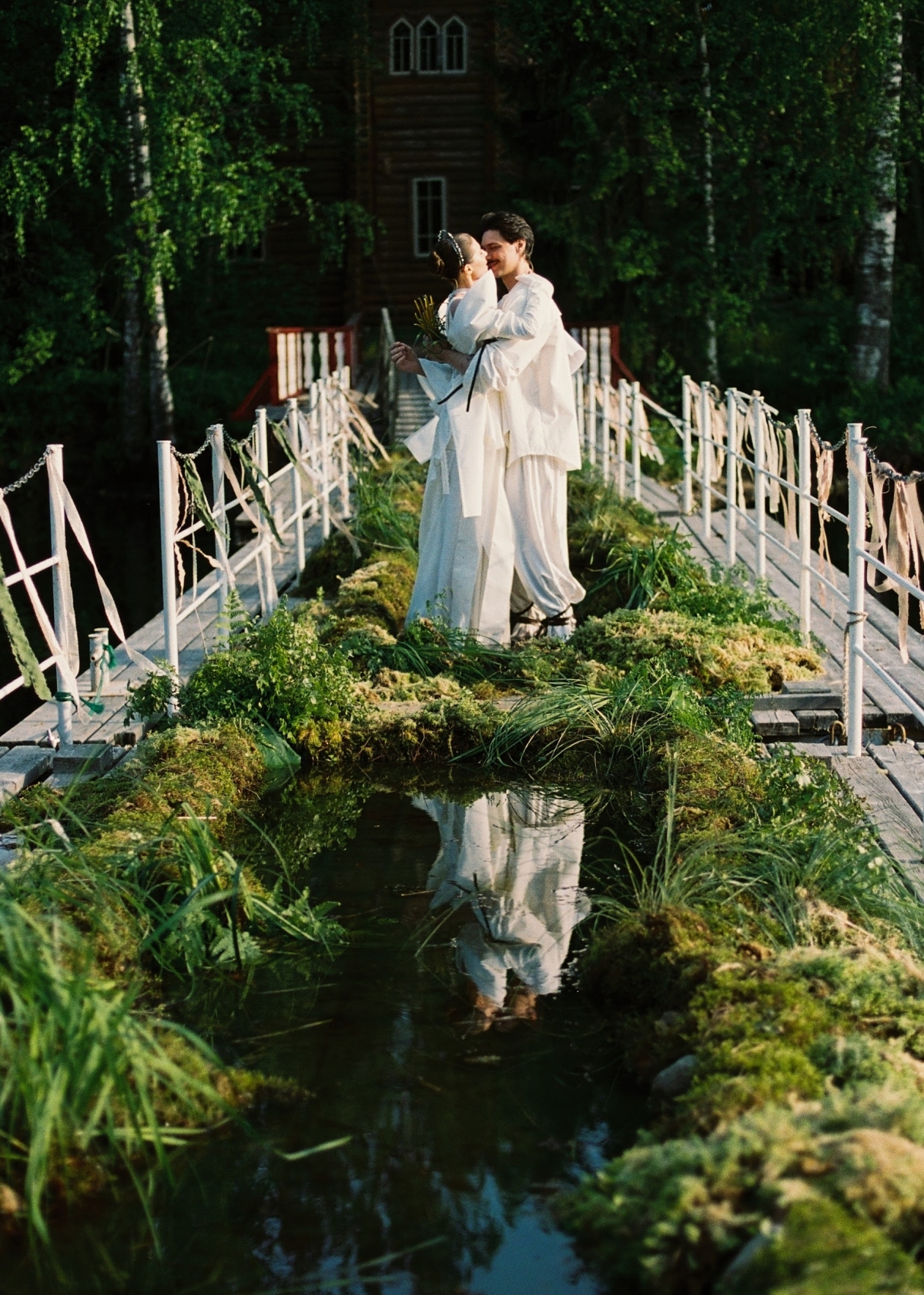Вéдать — значит поведать, рассказать сказку. Мы с Русланом как герои старинных сказаний, поэтому в церемонии были мистические элементы. Мой букет — это свечи с чесночными стрелками. Мы с Русланом шли босиком по воде, навстречу друг другу.