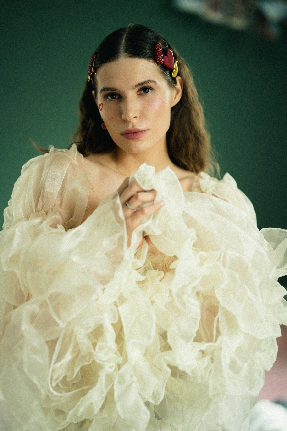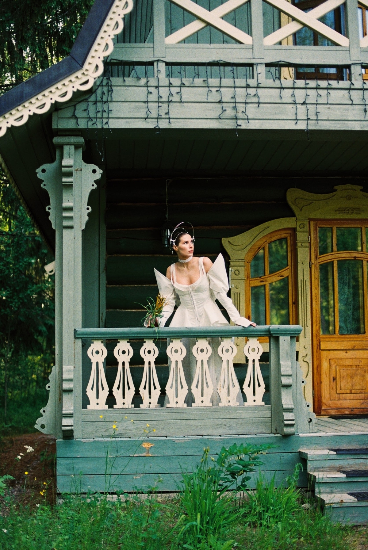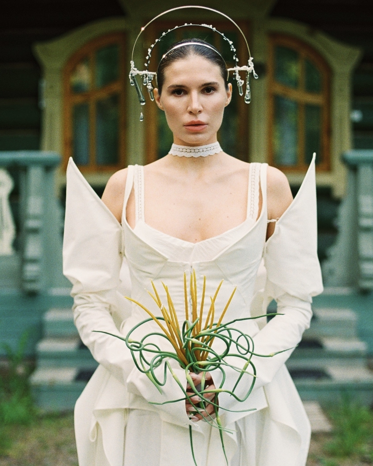 Образом на церемонию стал дизайнерский проект, который мы сделали вместе с Соней Тихоновой и Настей Павлович. Платье назвали «Василиса Премудрая», дочь морского царя. Мне хотелось объединить водную текучесть и силу народного костюма.