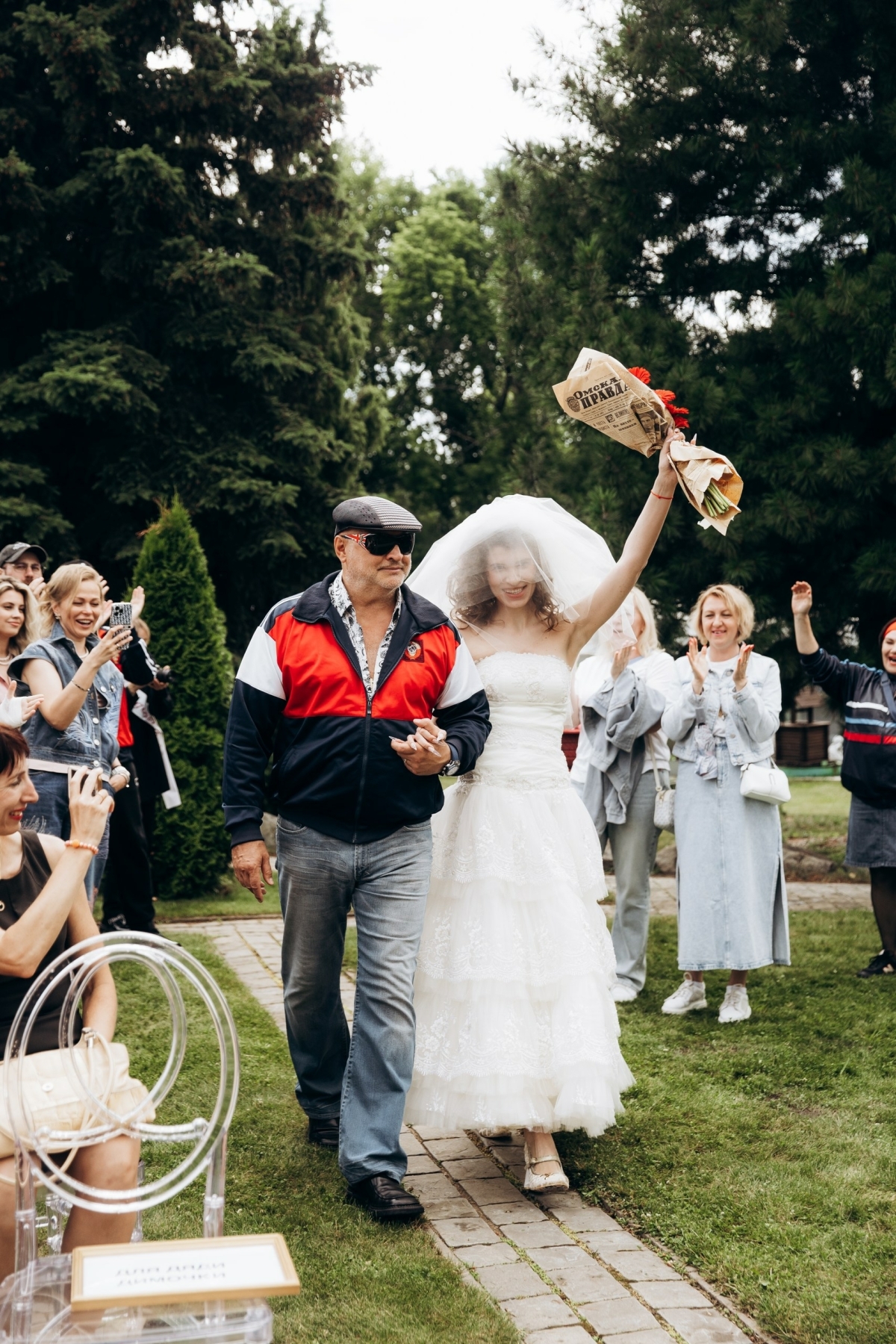 Боги — дань вере. Я верю в Бога, поэтому церемония проходила на фоне церкви. На голове у меня был венец, как ореол на иконах. Звучал колокольный звон. Мы шли навстречу друг другу по мосту: Руслан — из «мирской» части, я — со стороны церкви.