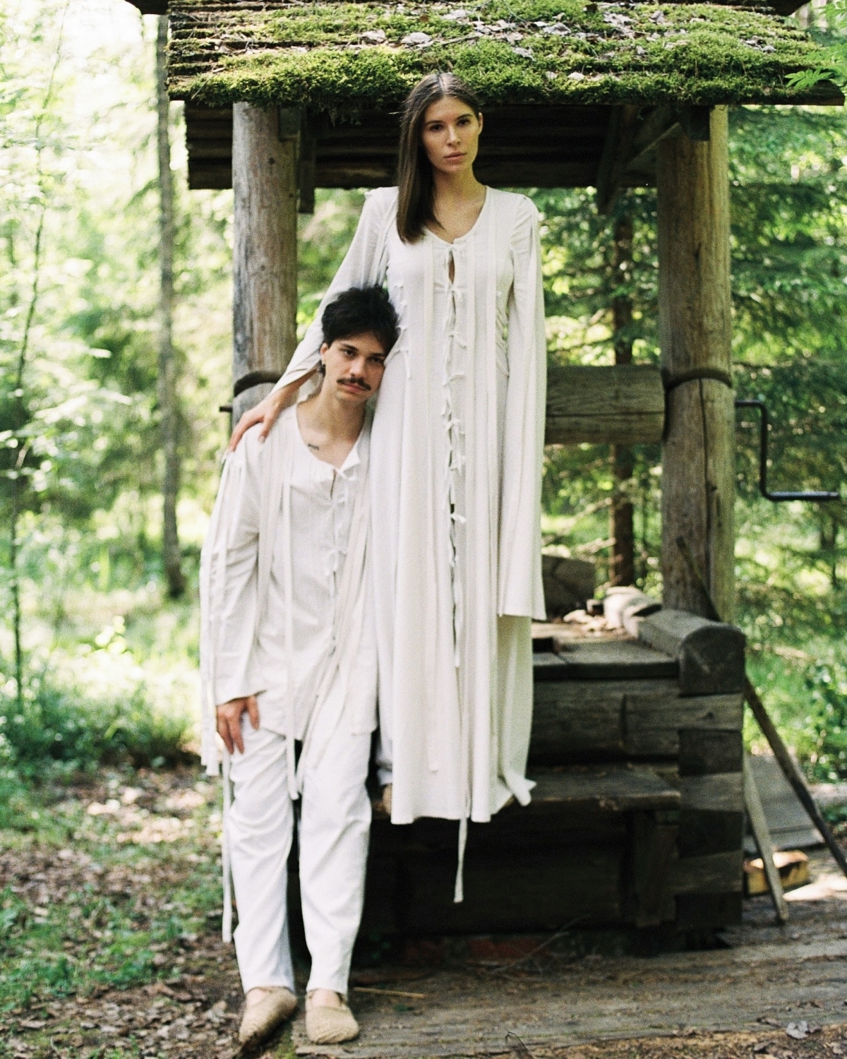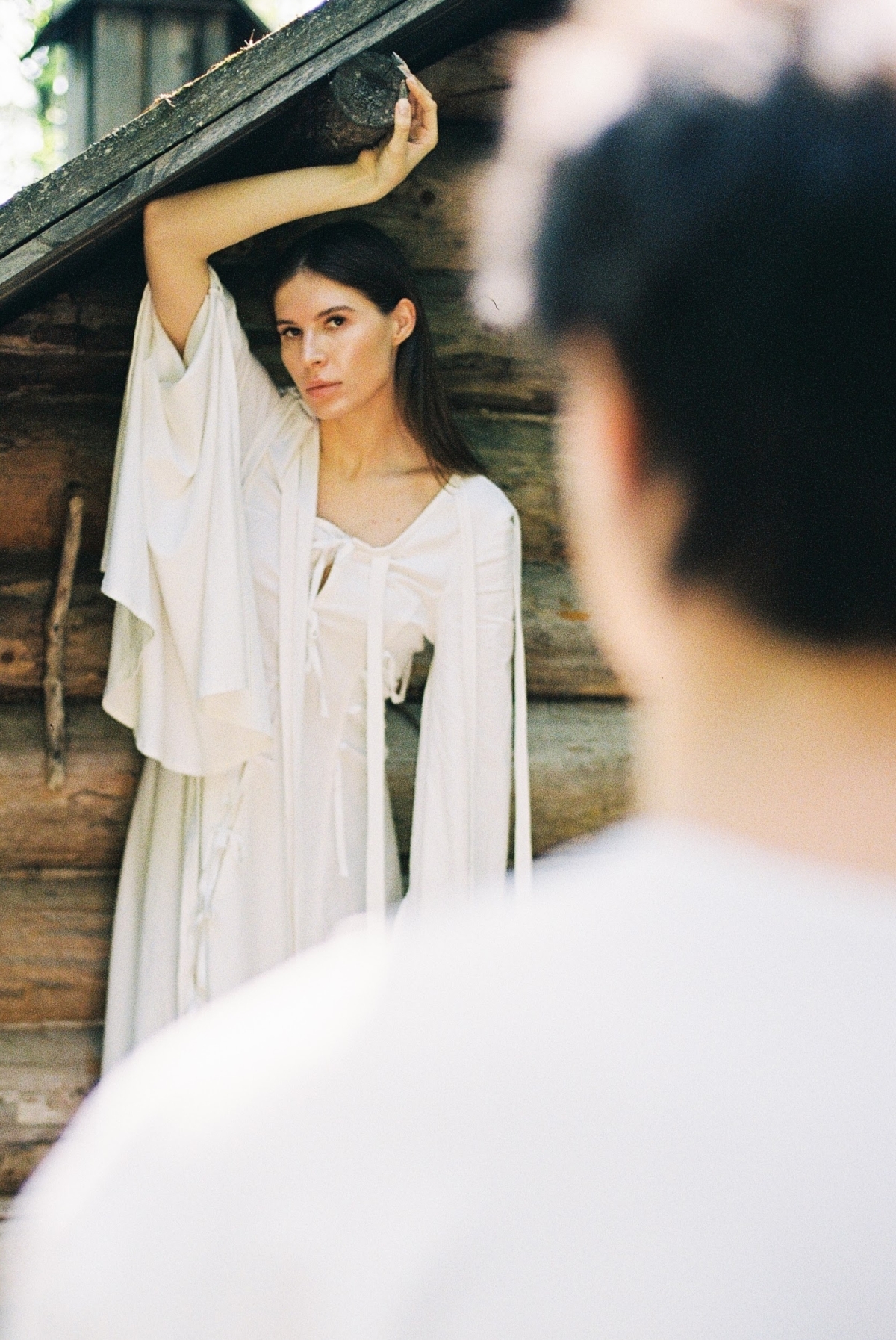 Для утра у меня было длинное льняное платье с завязками спереди и очень длинными рукавами — как у лебедушки. Весь его периметр украшали льняные ленты. У Руслана — льняная рубаха и широкие штаны, тоже с лентами. Мы этими лентами связали друг друга — как символ объединения наших душ и тел.