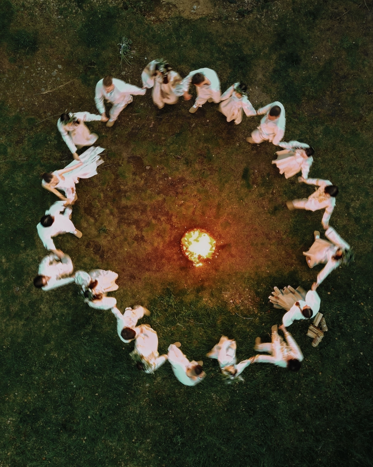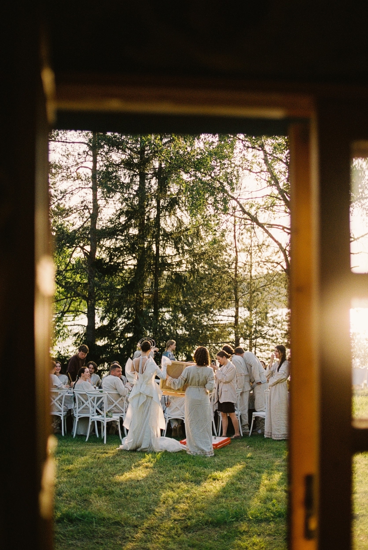 Люди — это душа свадьбы. Это народ, наши гости, каждый из которых был в индивидуально сшитом костюме из 100% льна. Я разработала по 4 дизайна женских сарафанов и мужских рубах со штанами — всего 16 уникальных комплектов. Все были в джутовых лаптях. Девушки заплетали косы с лентами, мужчины надевали вязаные браслеты, массивные кольца, деревянные крестики.