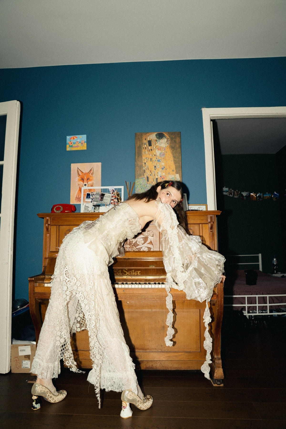 1. Нижний многослойный сарафан с тонкими кружевными бретельками, открытой спиной и длинным шлейфом. В нем использовалось старинное кружево и технологичные ткани. Сарафан — как символ народной одежды, ткань — как вода.