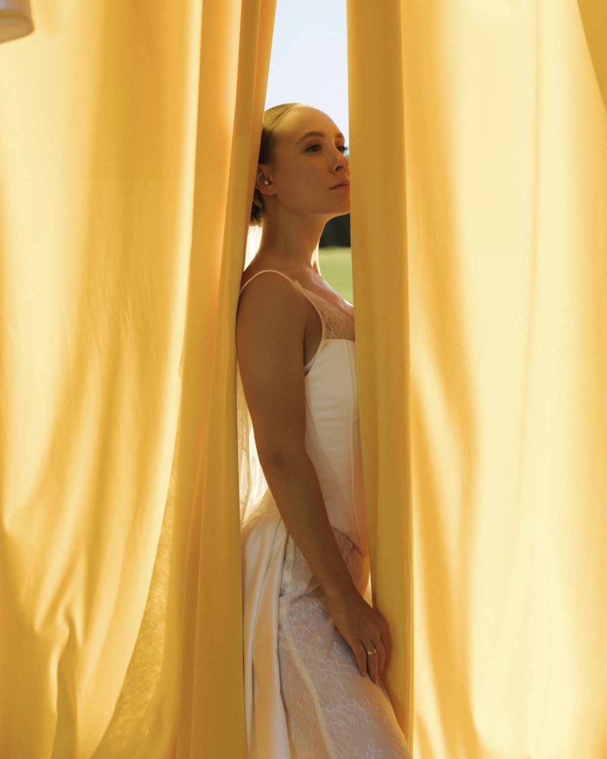 Второй образ — платье Mila Polka. Мне очень понравилась Полина и ее ателье. Обожаю свой основной образ — немного дерзкий, при этом нежный и драматичный: корсет с огромным шлейфом и кружевное платье под ним. На примерке мои подруги окрестили его «ланодельреевским».