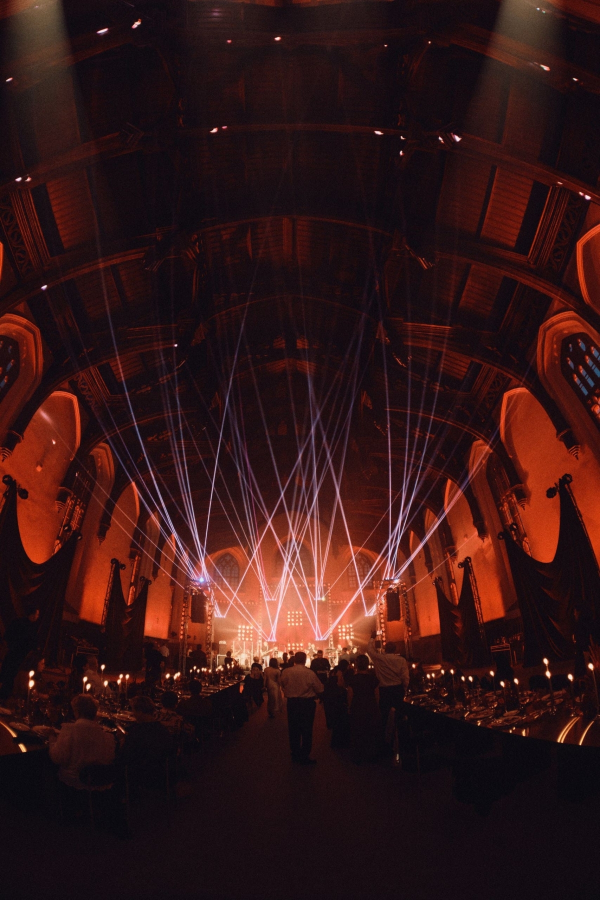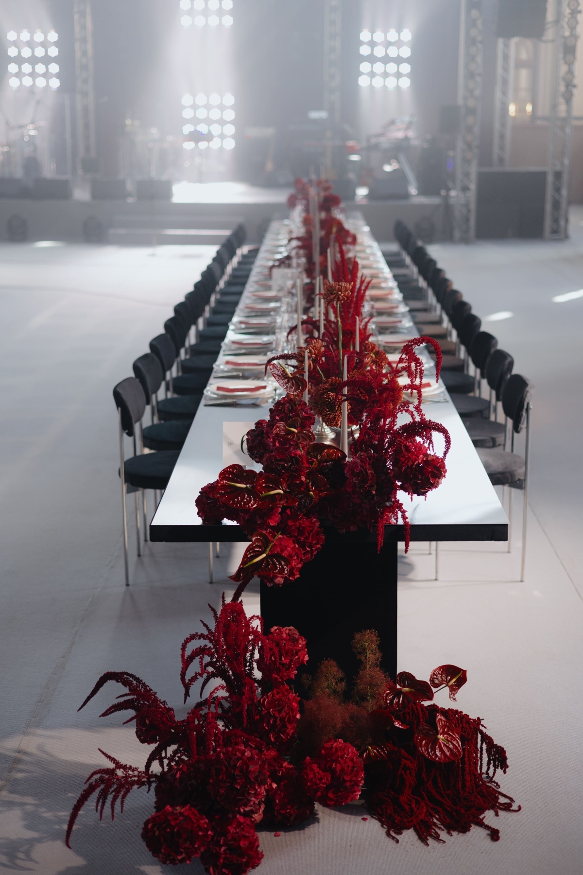 Окончательно все решилось, когда мы увидели будущую площадку — сразу захотелось подчеркнуть декором готические своды главного зала. При этом не было задачи слишком глубоко в готику: важно было добавить более современное звучание. Так и появилась идея длинных металлических столов, сцены с обилием света и десятков метров ткани для драпировок.