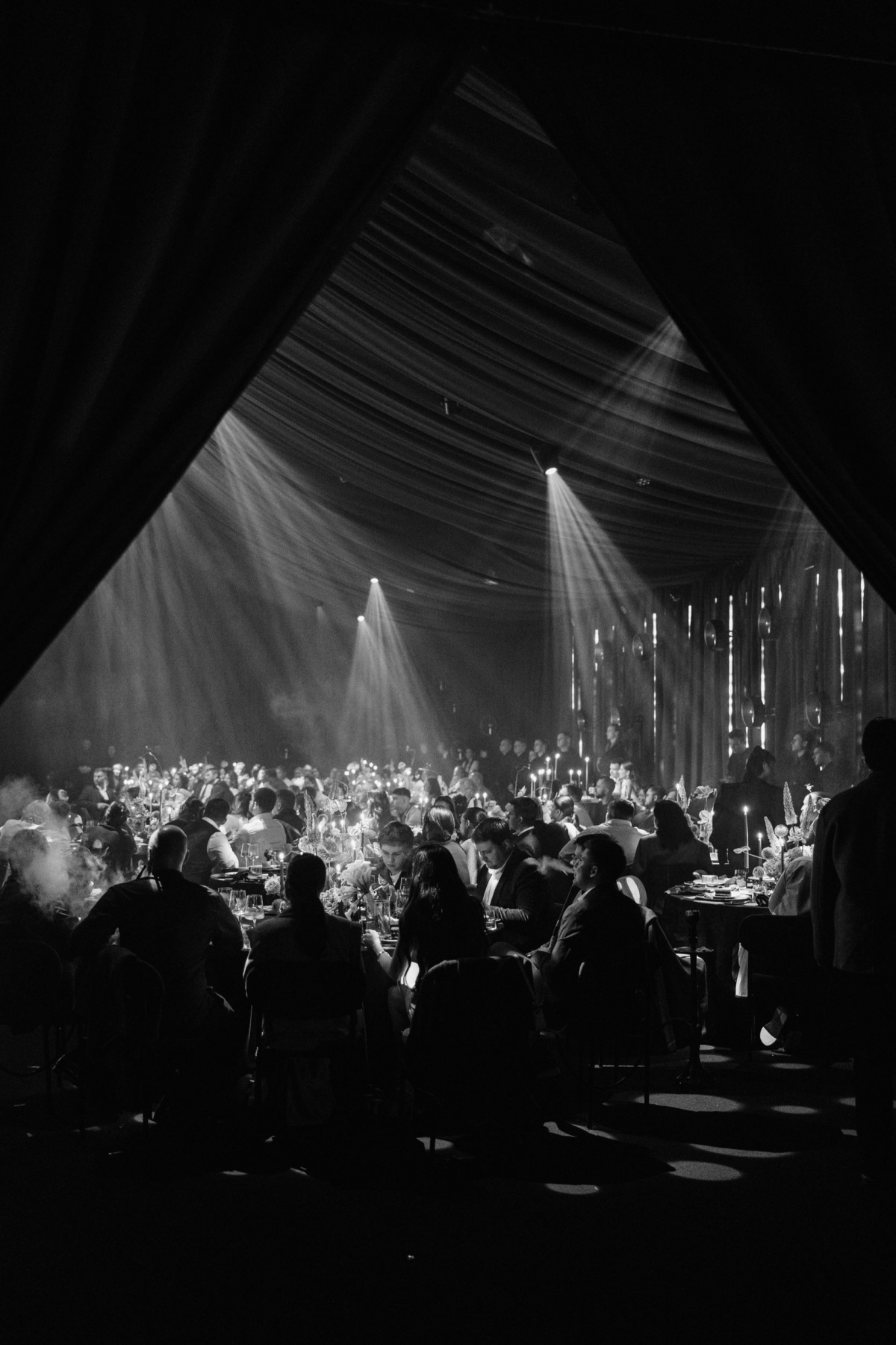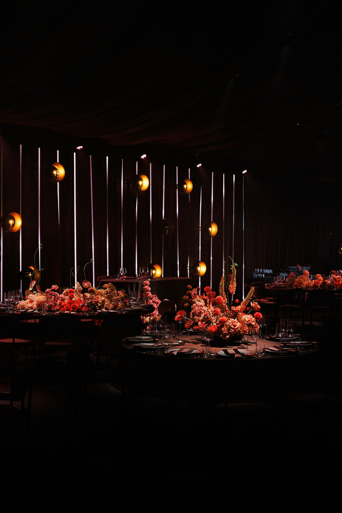 На самом деле нас вдохновила классика. Я очень люблю живую музыку, у меня мурашки от симфонического оркестра, поэтому мы и выбрали театрально-оперную стилистику. Хотела свадьбу, на которую не будет стыдно смотреть через 20–30 лет: классика всегда в моде. Я решила оформить шатер в темной, шоколадной гамме — многие удивились, но мне близка такая атмосфера: приглушенный свет, свечи, ощущение уюта и интимности. Цветы подбирали в природных оттенках: к концу августа все начинает краснеть к осени, и нам хотелось, чтобы декор органично продолжал этот переход.