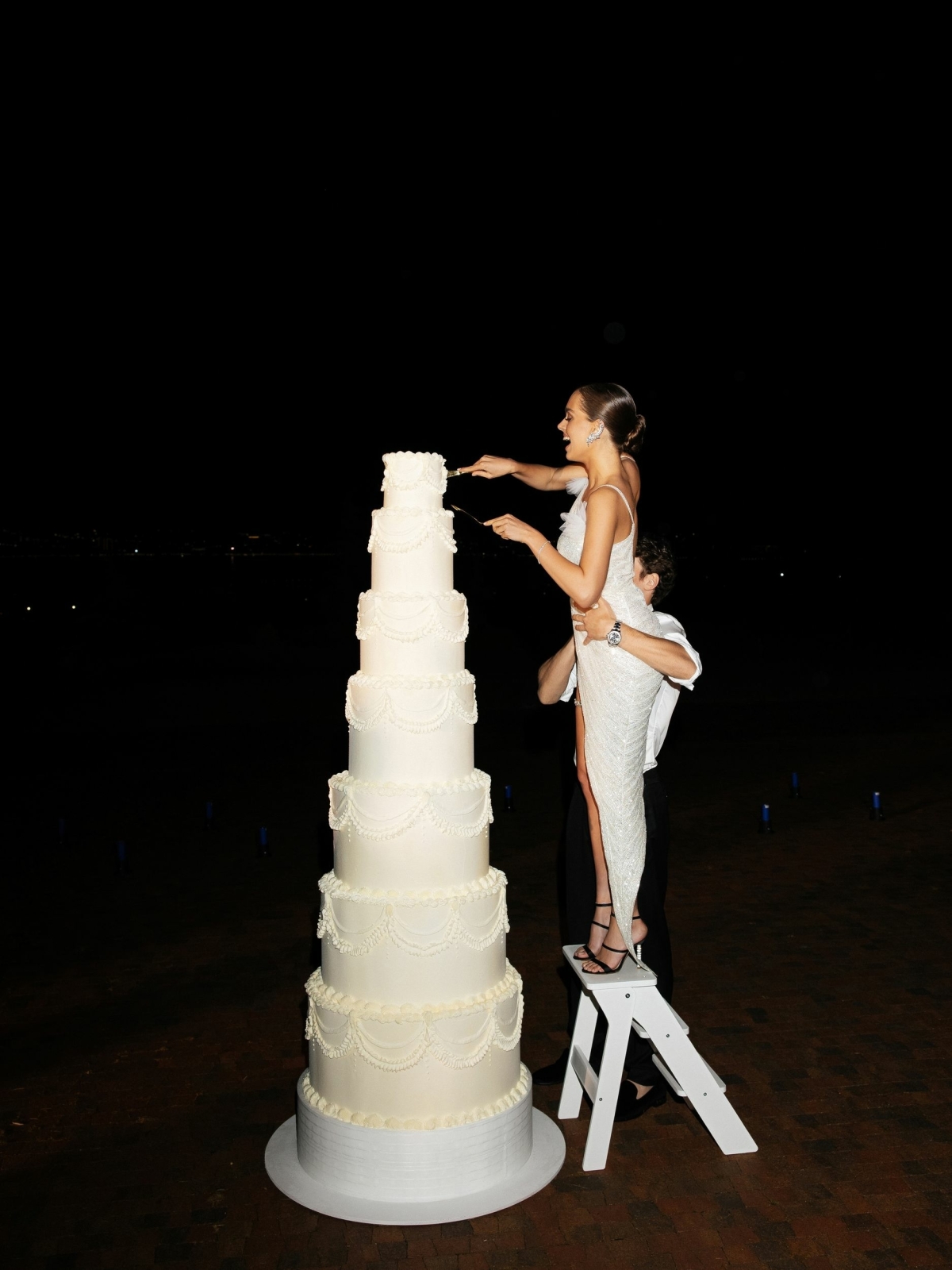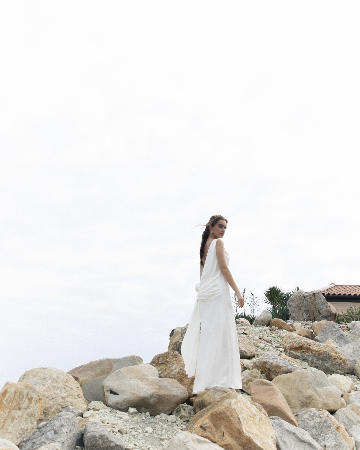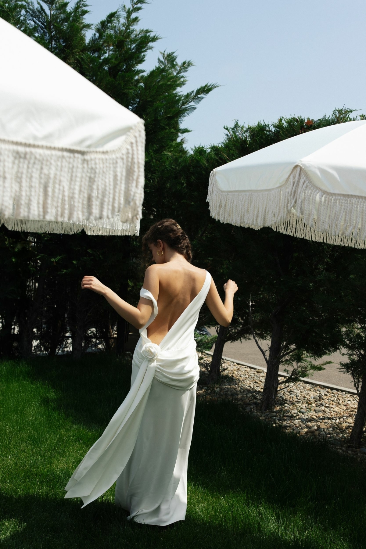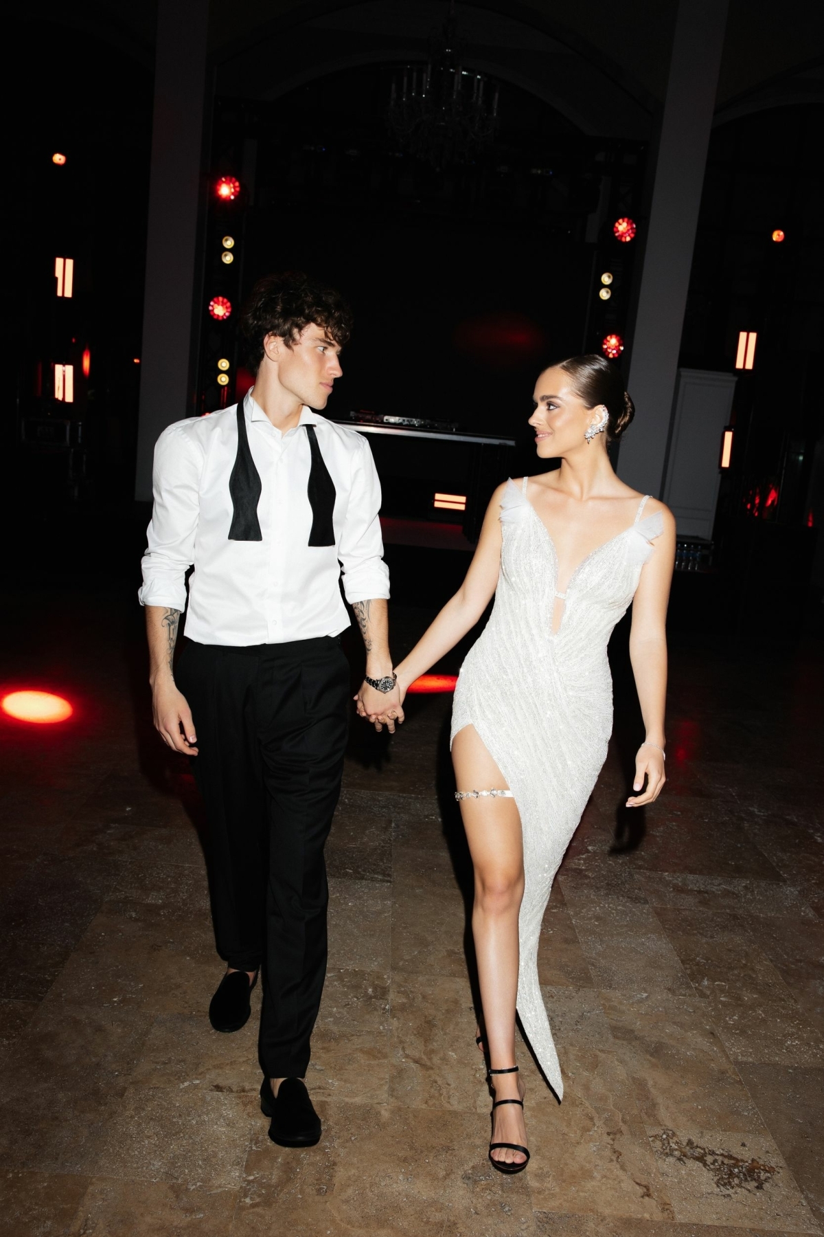 А завершал вечер мой четвертый образ — мерцающее асимметричное платье в пол Murashka. Волосы — гладкий пучок, макияж — темные смоки, аксессуары — подтяжка и крупный кафф. Жениха я оставила без пиджака, с подвернутыми рукавами и развязанной бабочкой — это добавило легкости.