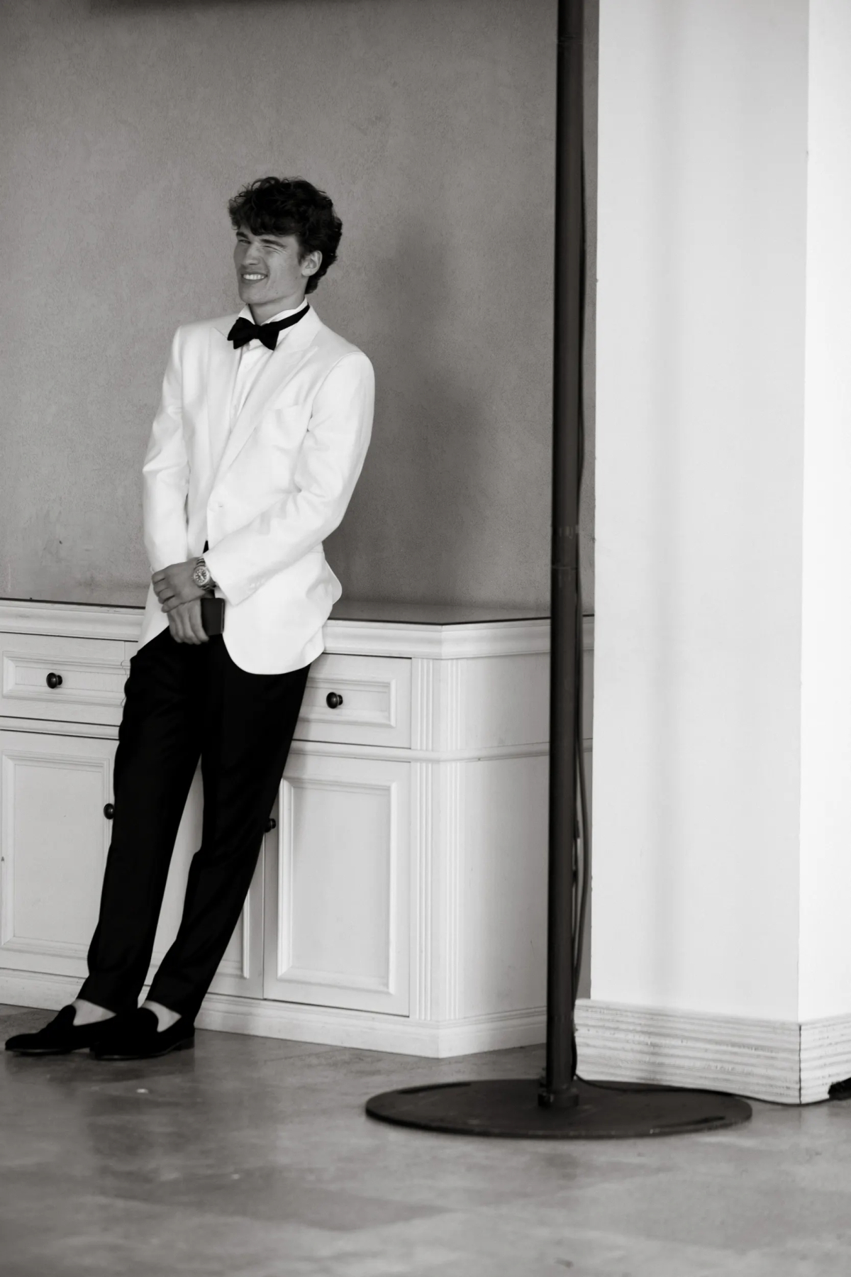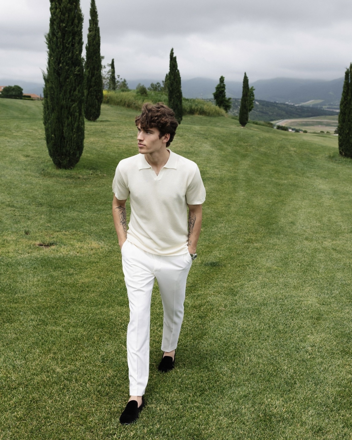 С Андреем все было проще. Мы точно знали, что классический черный костюм — не наша история. Хотелось свежести, и кремовый пиджак подошел идеально. Черные туфли? Мы же в Испании! Конечно, лоферы.