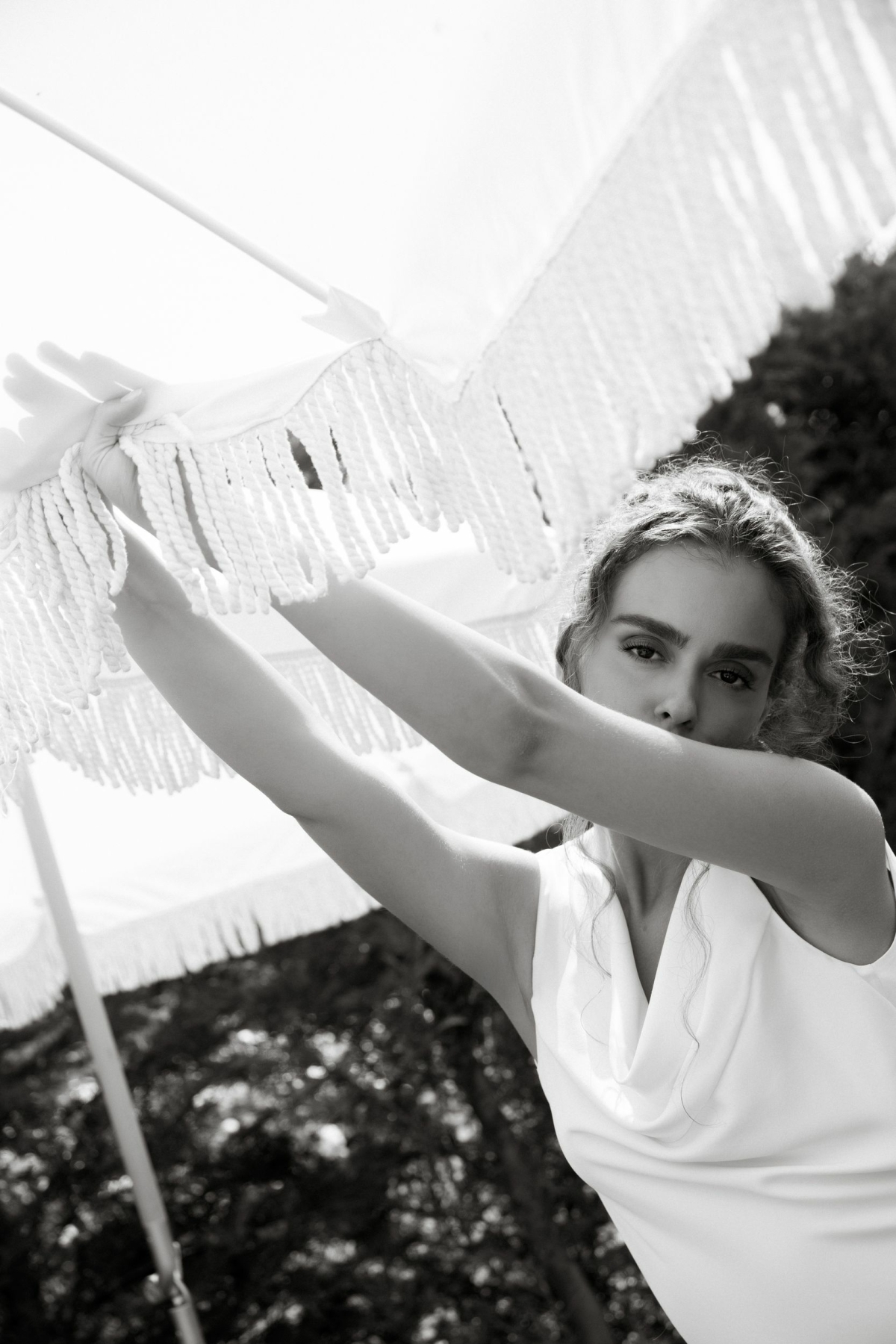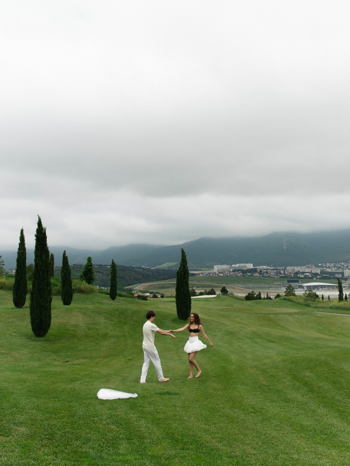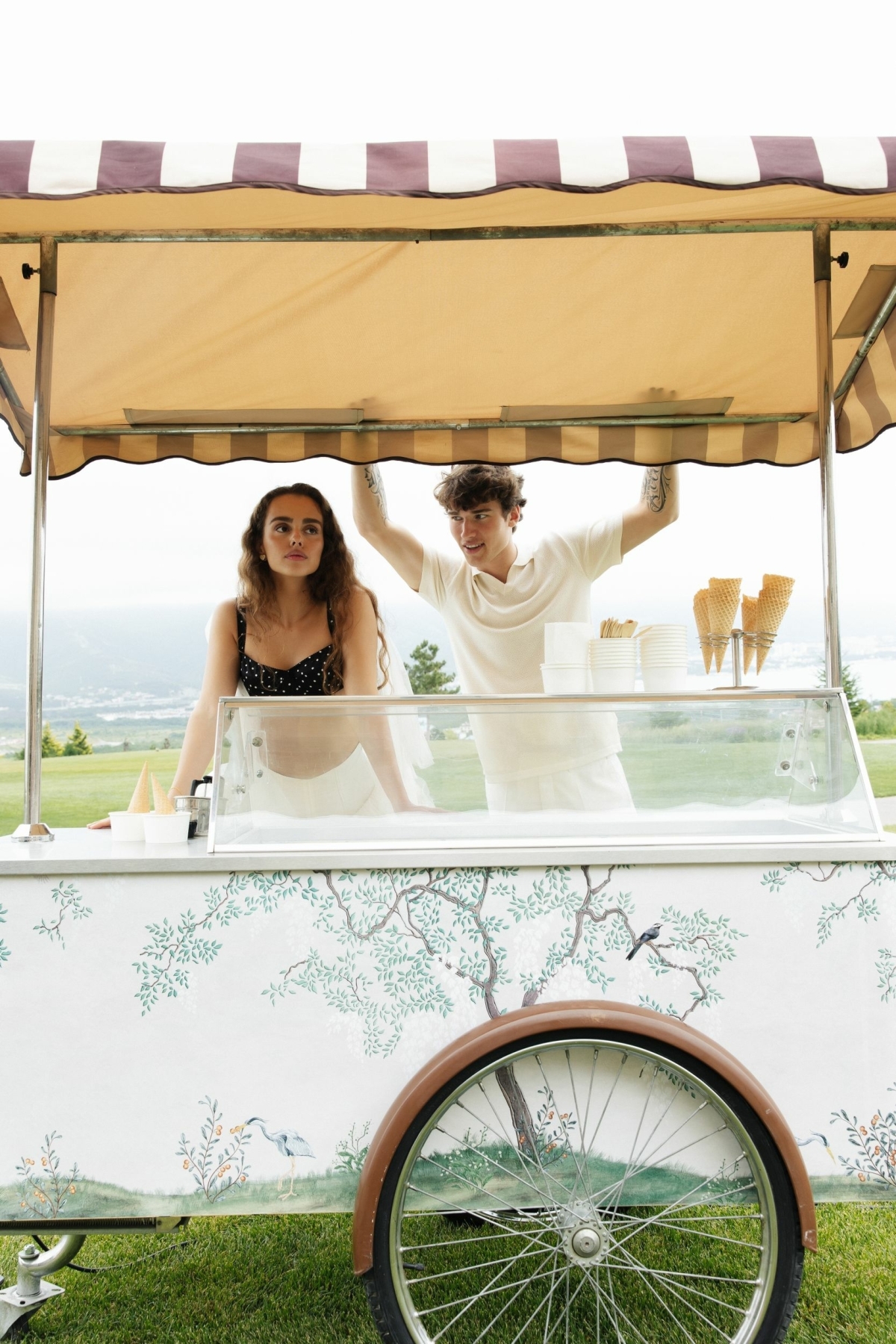 Первый образ — телесное боди, имитирующее голое тело, и множество ярких полотенец. Нетипично для утра невесты, согласны? Для совместной съемки была сшита юбка с панталонами, как в старых фильмах, и трендовый топ в горох Dolce & Gabanna. Андрей был в светлом поло и брюках. Нужно было обыграть эти образы, и первое, что пришло в голову, — мороженое! Много мороженого!