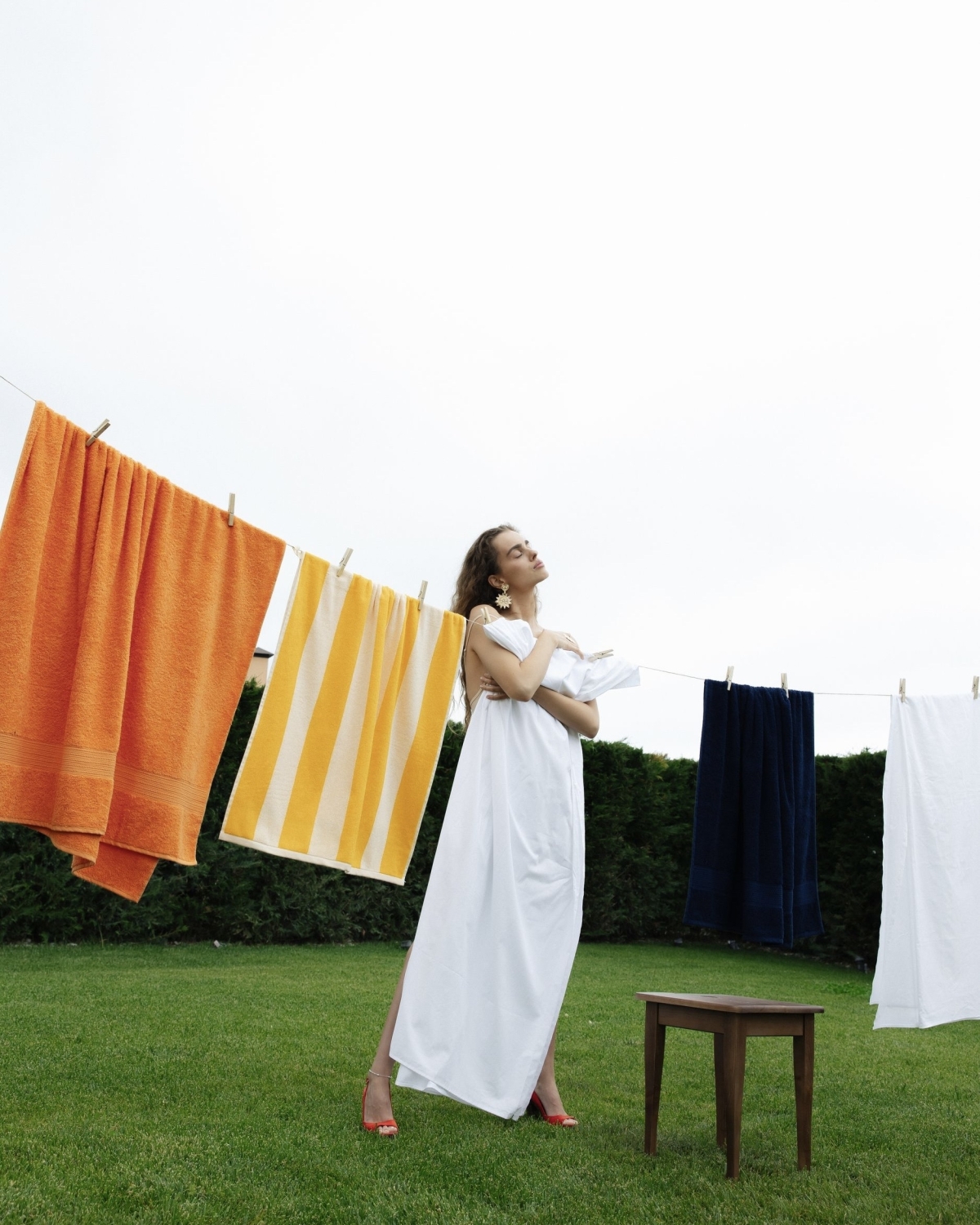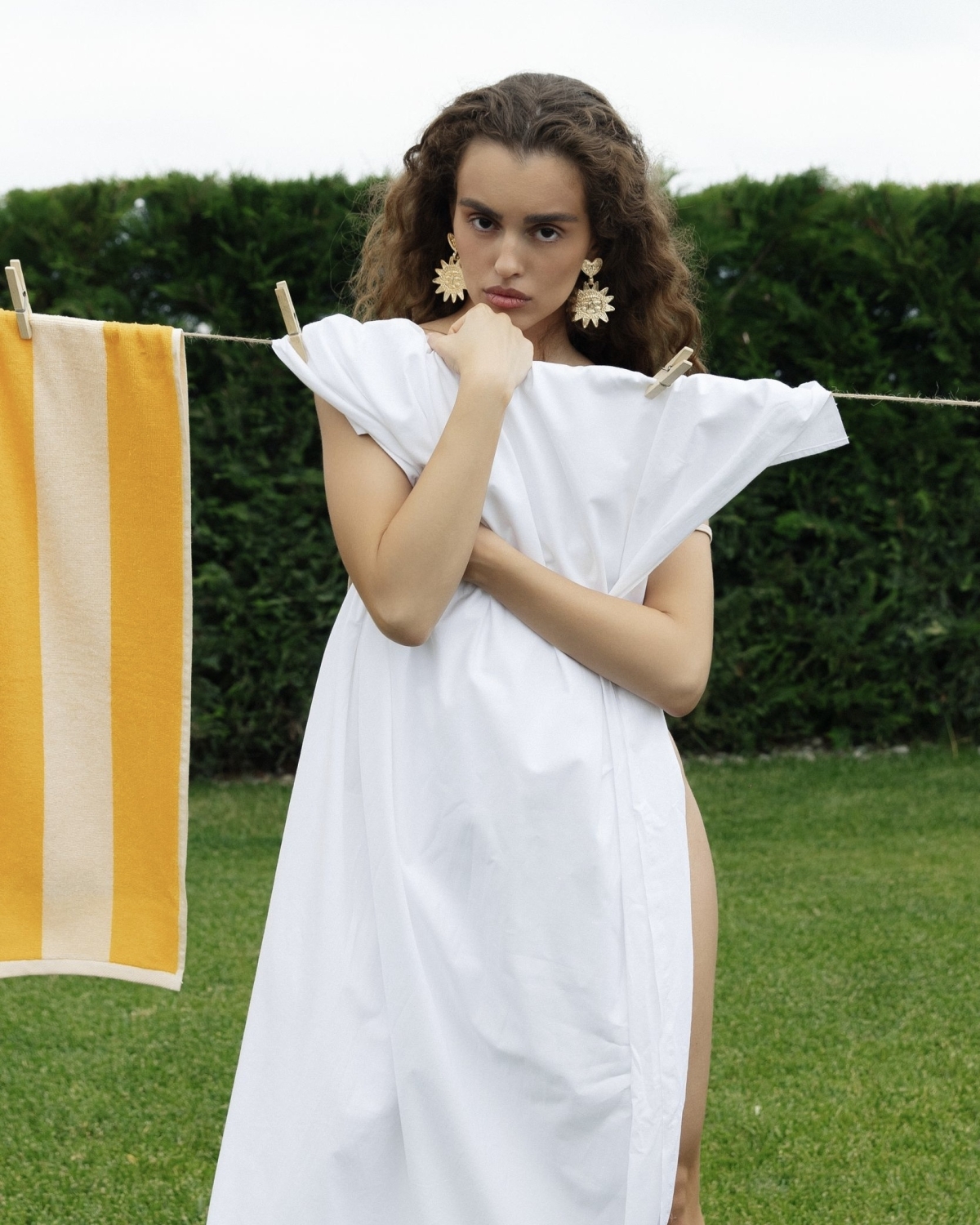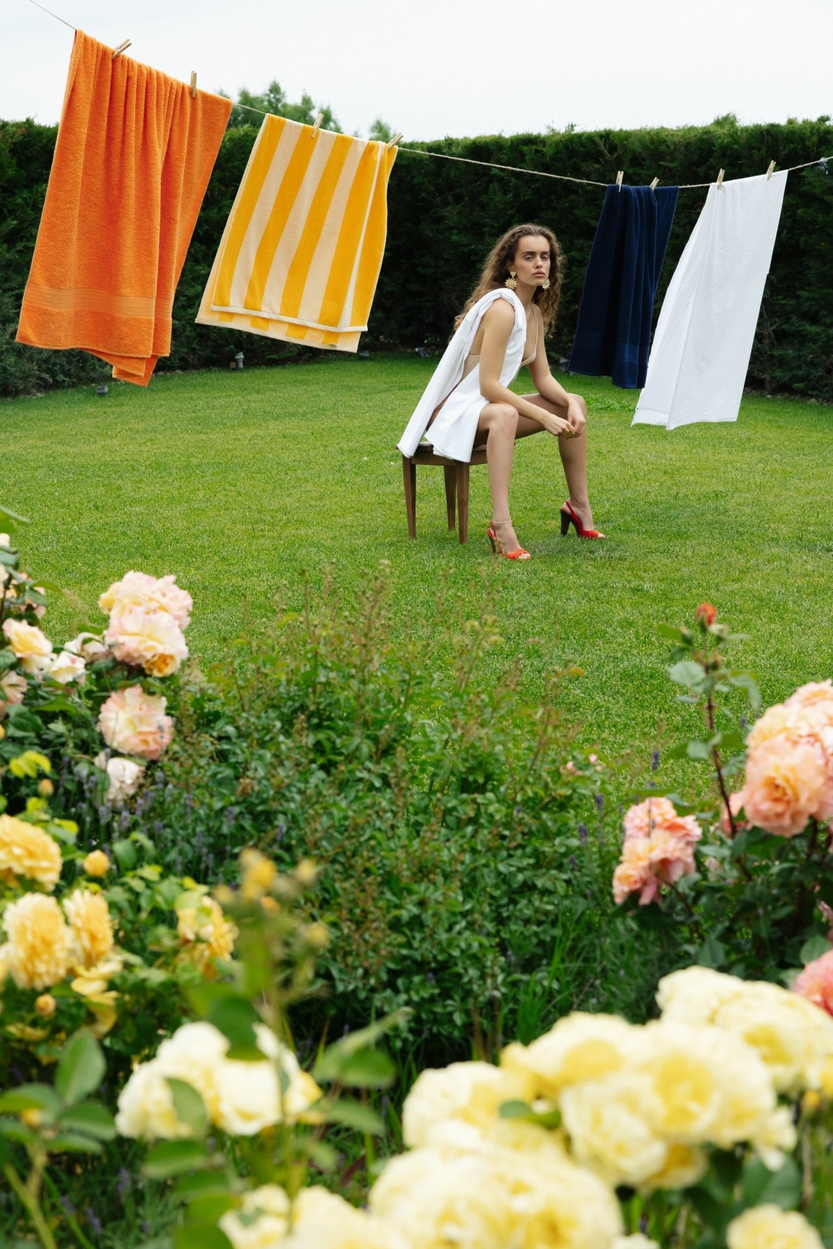 Первый образ — телесное боди, имитирующее голое тело, и множество ярких полотенец. Нетипично для утра невесты, согласны? Для совместной съемки была сшита юбка с панталонами, как в старых фильмах, и трендовый топ в горох Dolce & Gabanna. Андрей был в светлом поло и брюках. Нужно было обыграть эти образы, и первое, что пришло в голову, — мороженое! Много мороженого!