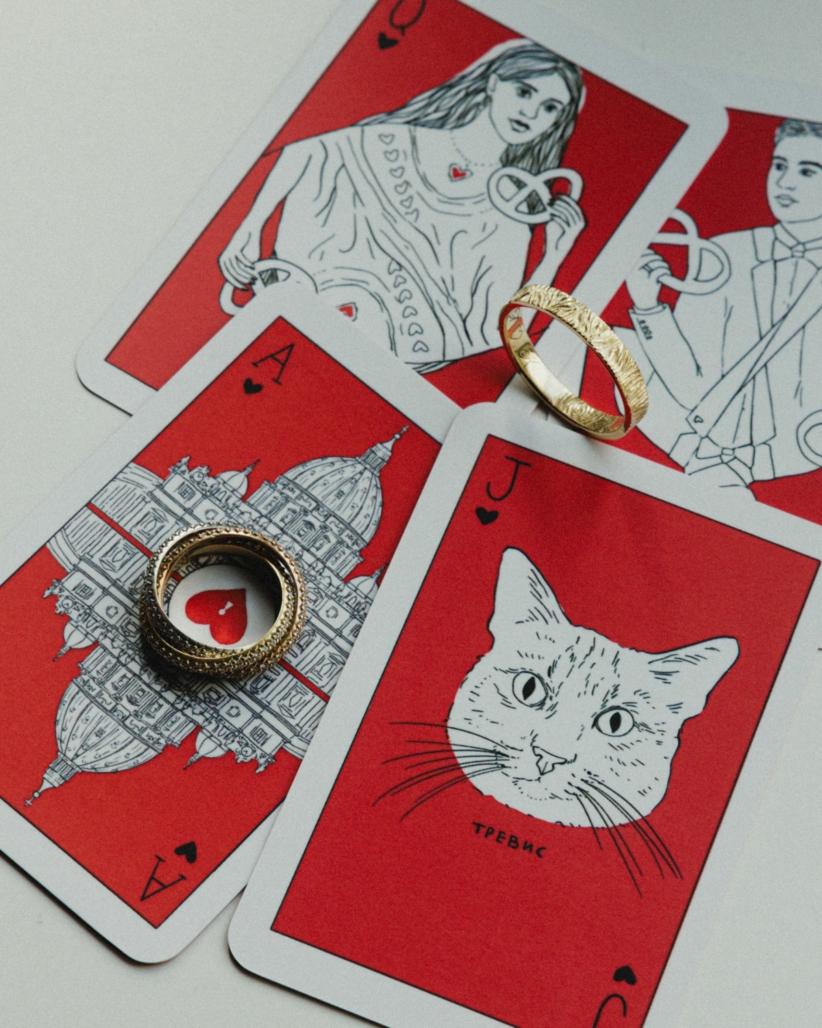 Мы хотели подарить гостям что-то теплое и личное, поэтому сделали свечи с нашими детскими фотографиями и организовали арома-бар. А еще мы оба любим играть в карты, поэтому я сама нарисовала колоду, которую мы разыгрывали на свадьбе. Каждая масть была посвящена одному из наших четырех городов, на которых строилась вся концепция.