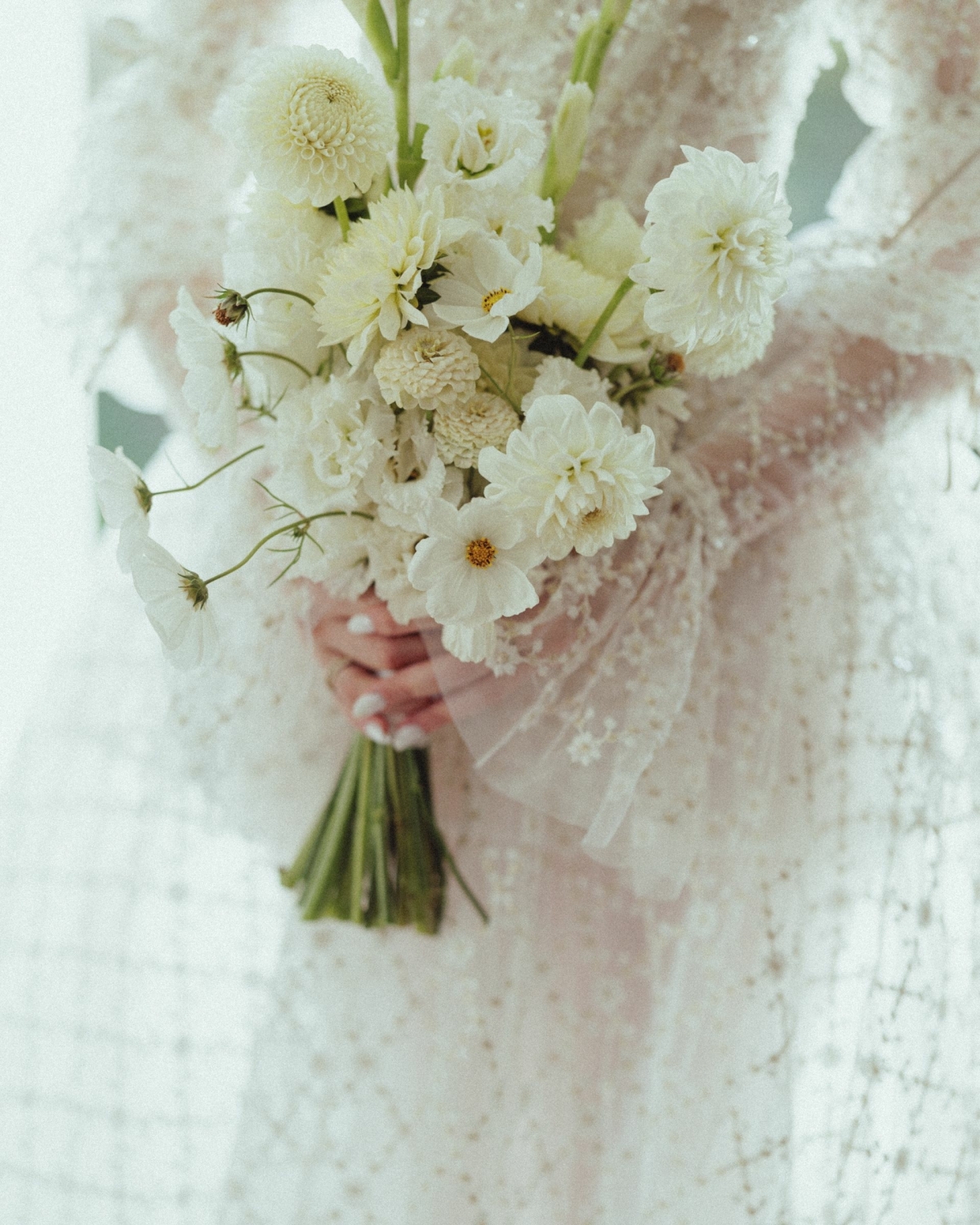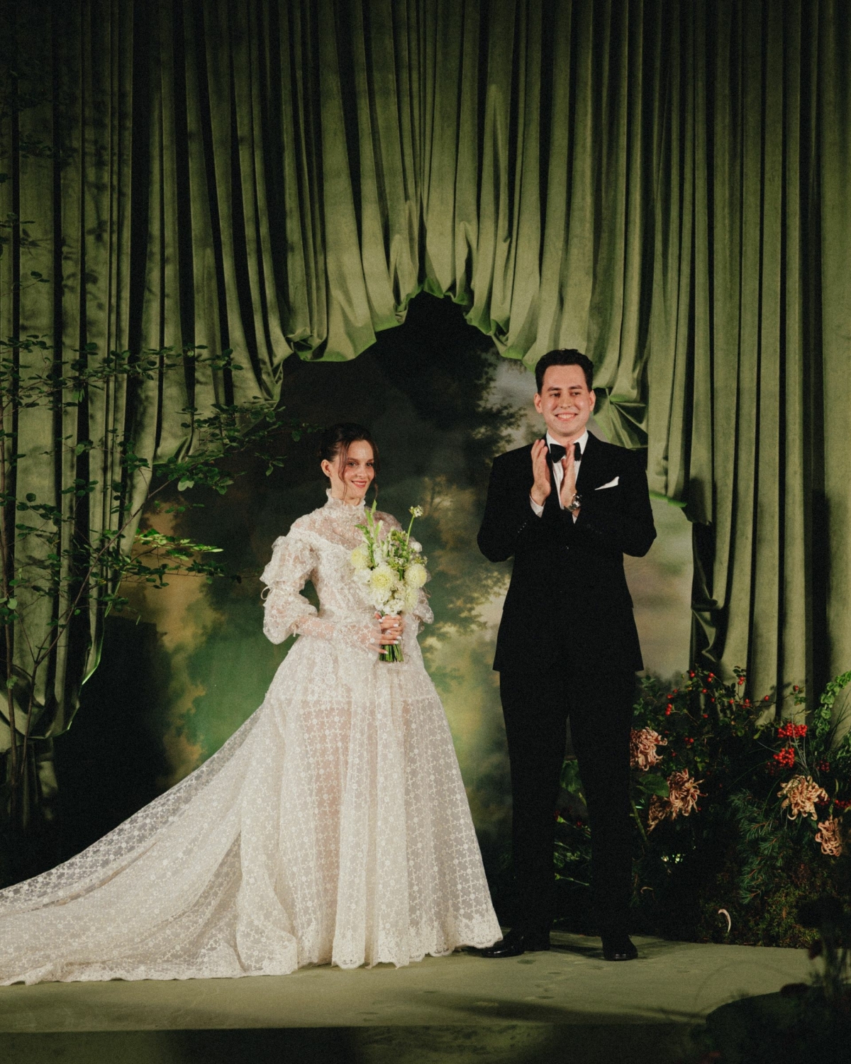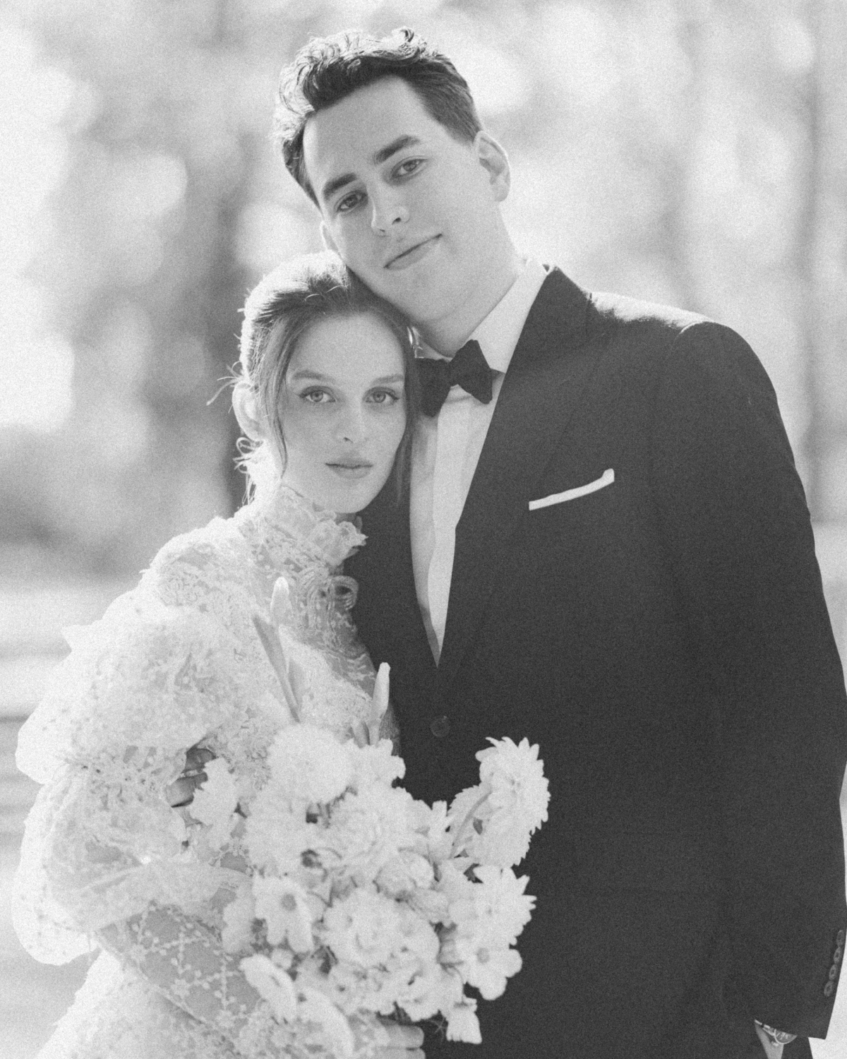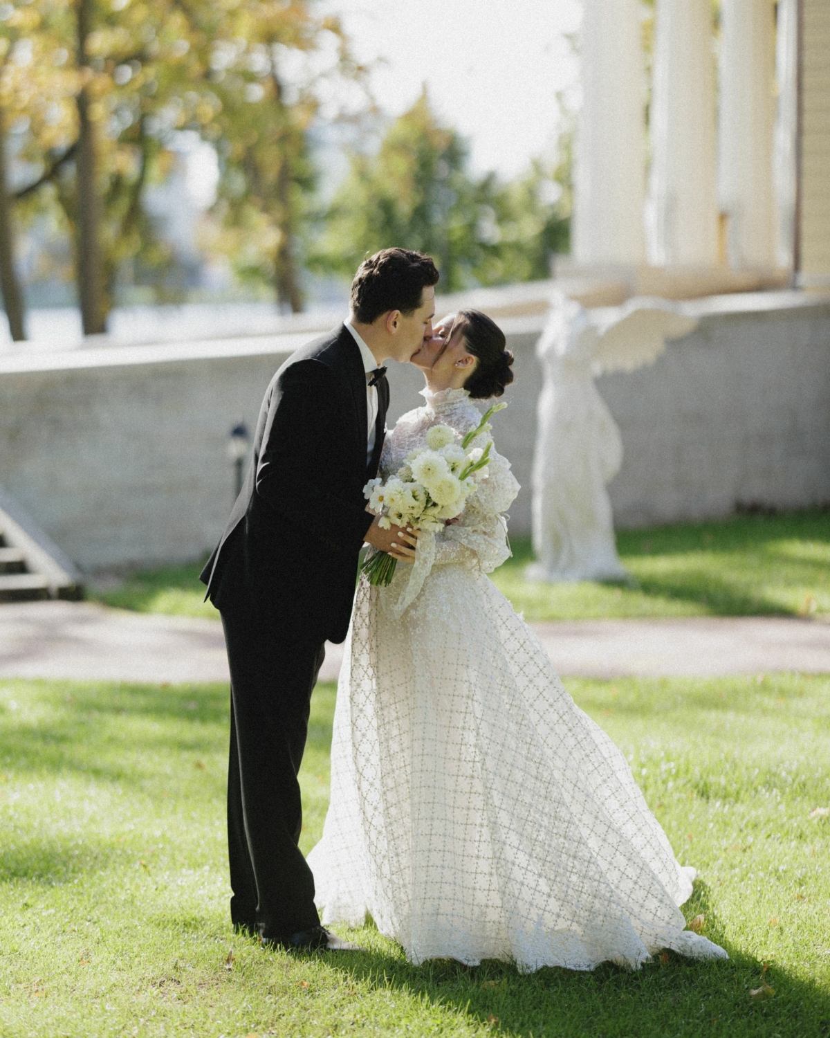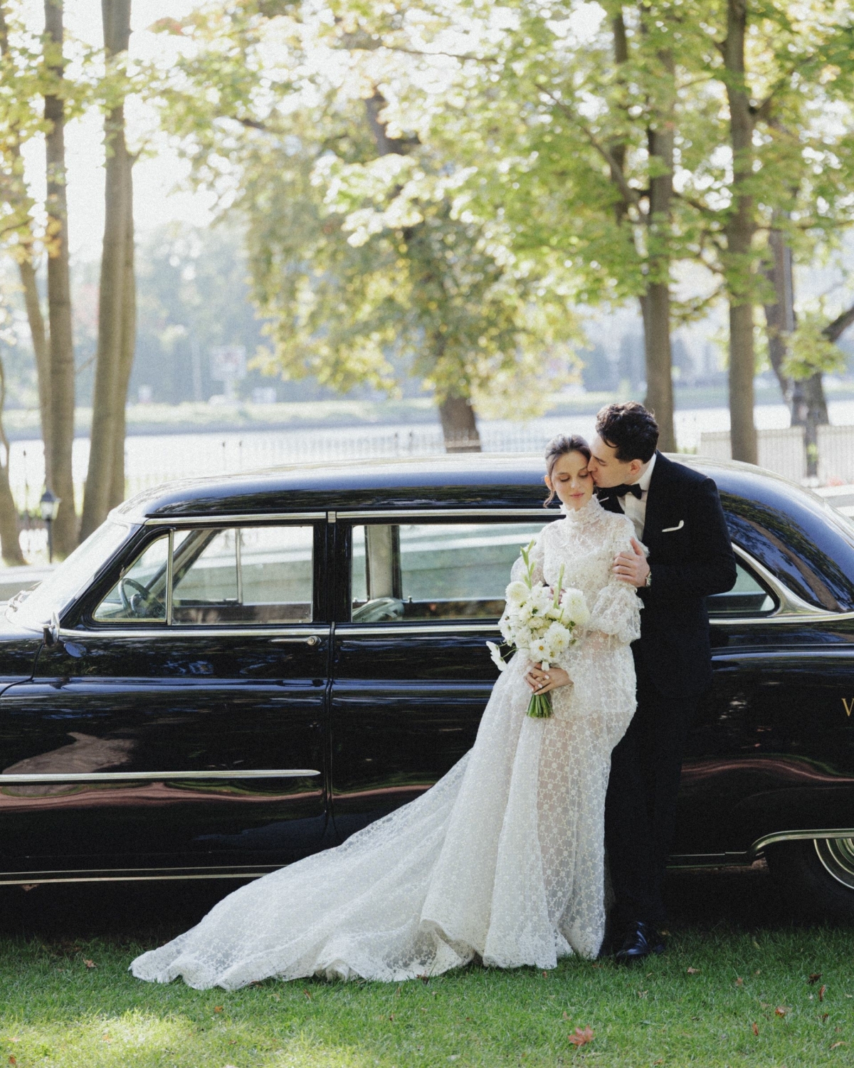 С моим платьем все было довольно просто: я успела примерить много вариантов, но когда надела свое — Rara Couture — сразу все поняла. Остальные варианты отпали, я просто влюбилась в него. Все кружево вышито вручную, и именно это платье я хочу сохранить и показывать детям. Оно идеально подошло к дворцу и концепции свадьбы.