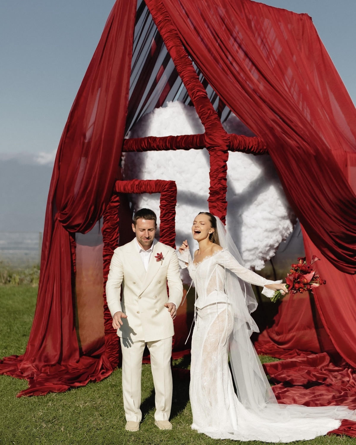 Возвращаемся в лето на свадьбе Стефании и Льва, которую для пары организовало московское агентство Soulmates. Сочный красный в деталях, виды грузинских виноградников и энергия близких, которые прилетели поздравить пару за много километров от дома. О том, как это было, в интервью невесты.