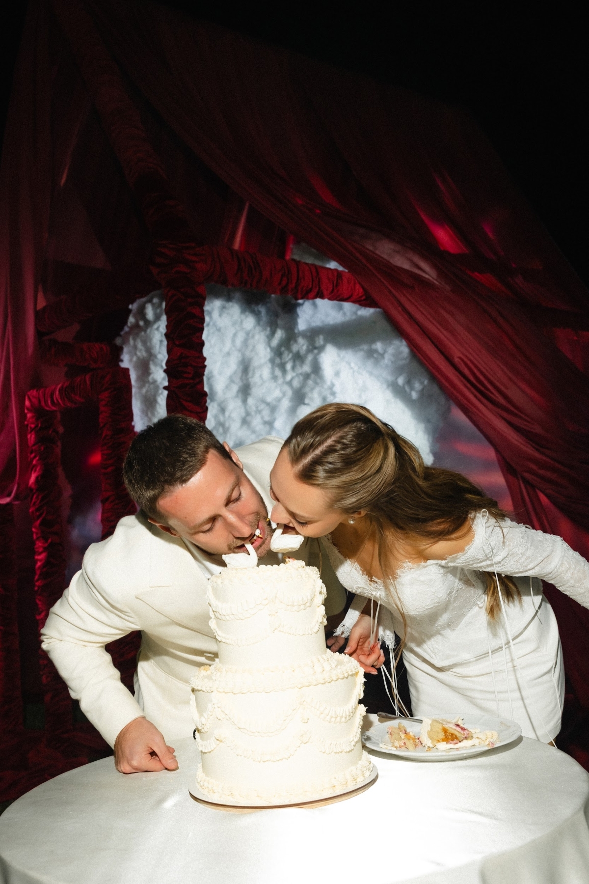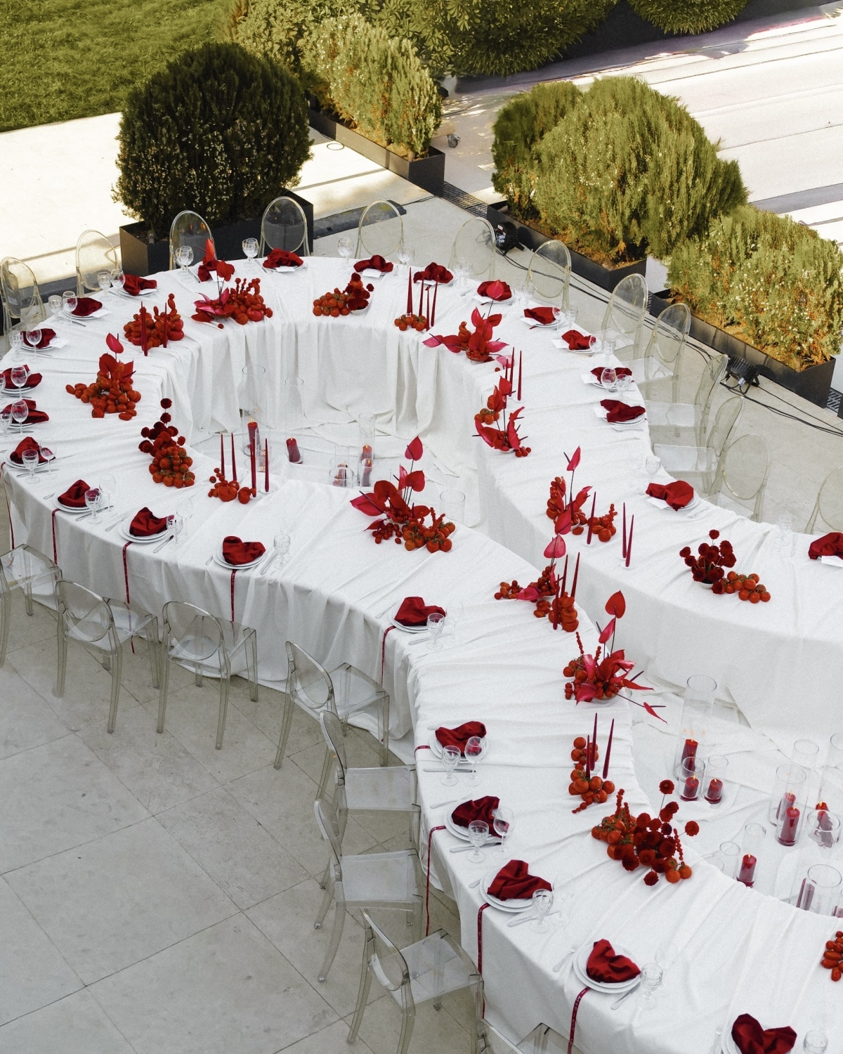Хотелось ярких акцентов — душа лежала к сет-дизайну в оттенках красного. Поэтому на столах появились помидоры, антуриумы и георгины. Сам стол был в форме знака бесконечности — однажды я увидела такую задумку и сразу поняла, что хочу именно ее. А зона церемонии — отдельная любовь. Нам сделали дом с сердцем внутри. Символично: дом, где живет любовь.