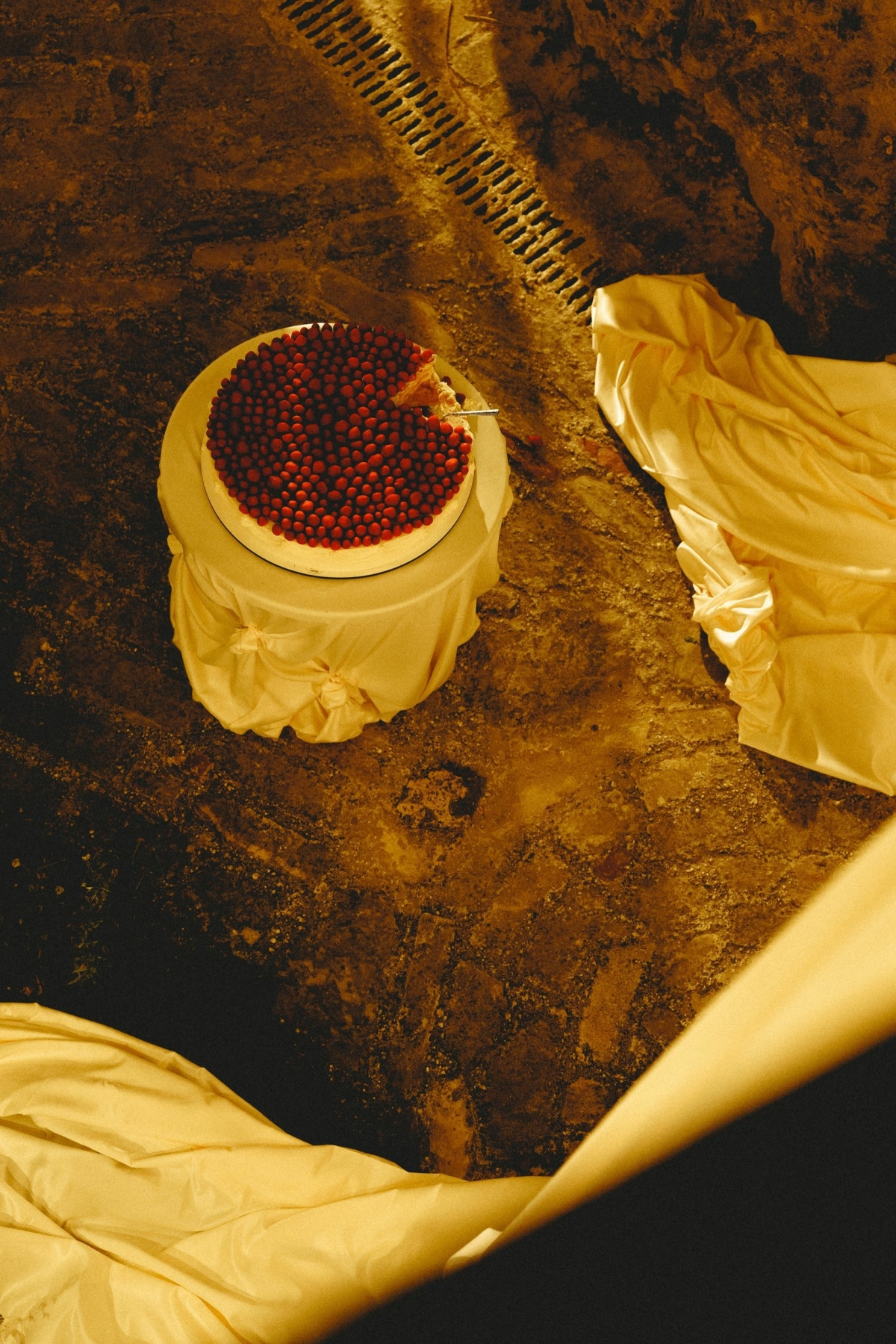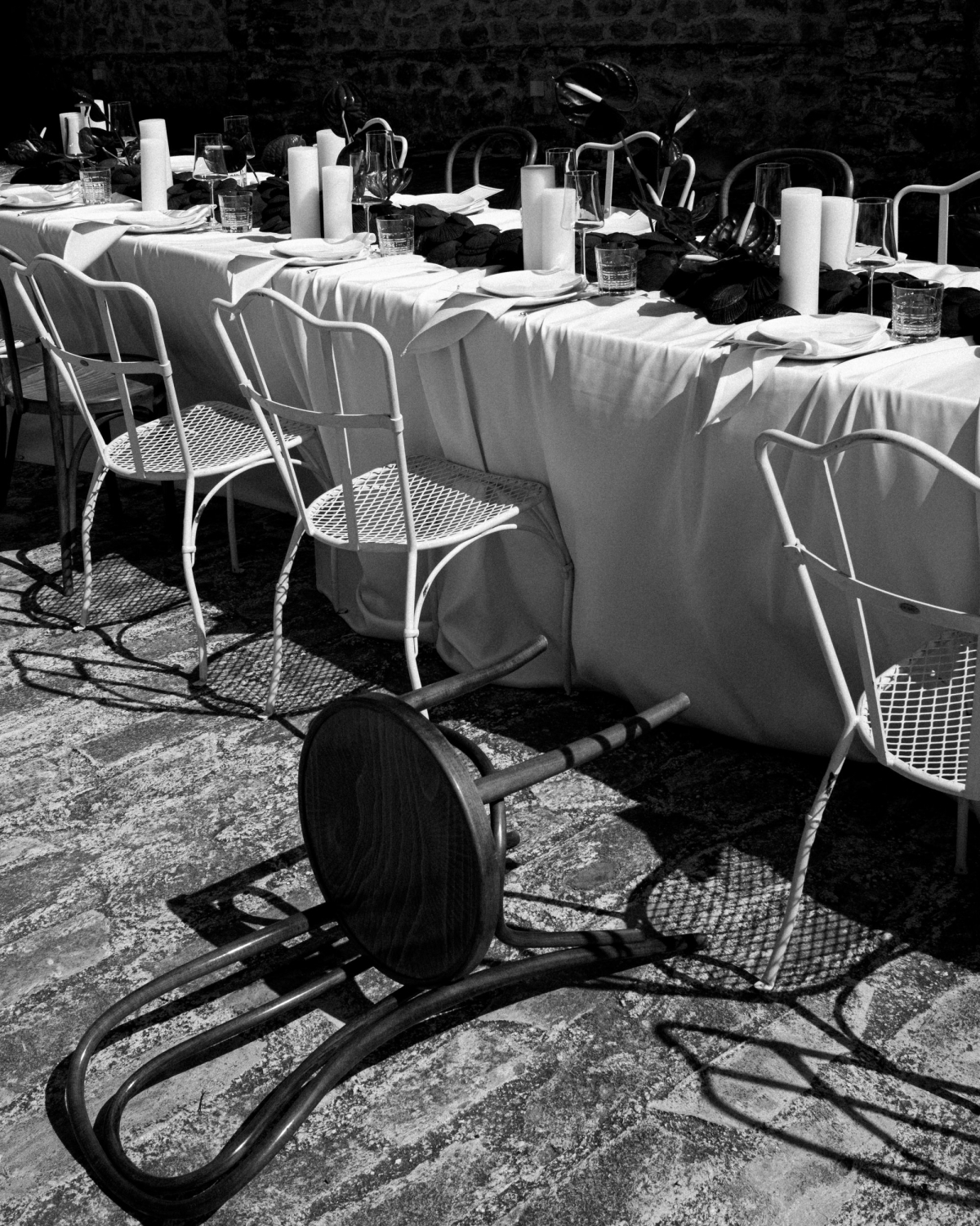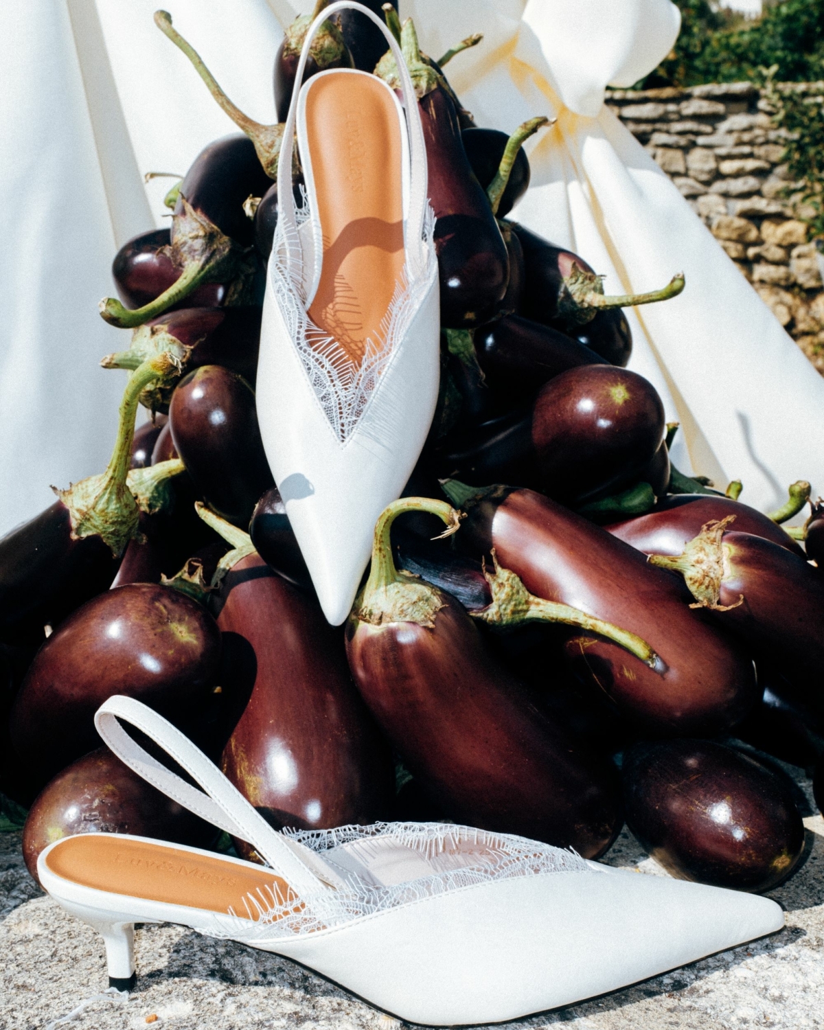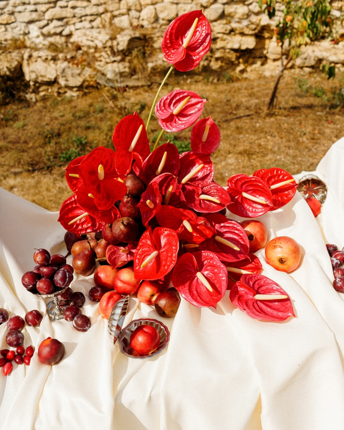 Помимо цветов и ракушек, было много фуд-композиций: баклажаны, инжир, виноград — все на винтажной серебряной посуде. На большом объеме молочной ткани, которая так красиво и немного небрежно спадала со столов, это смотрелось потрясающе.