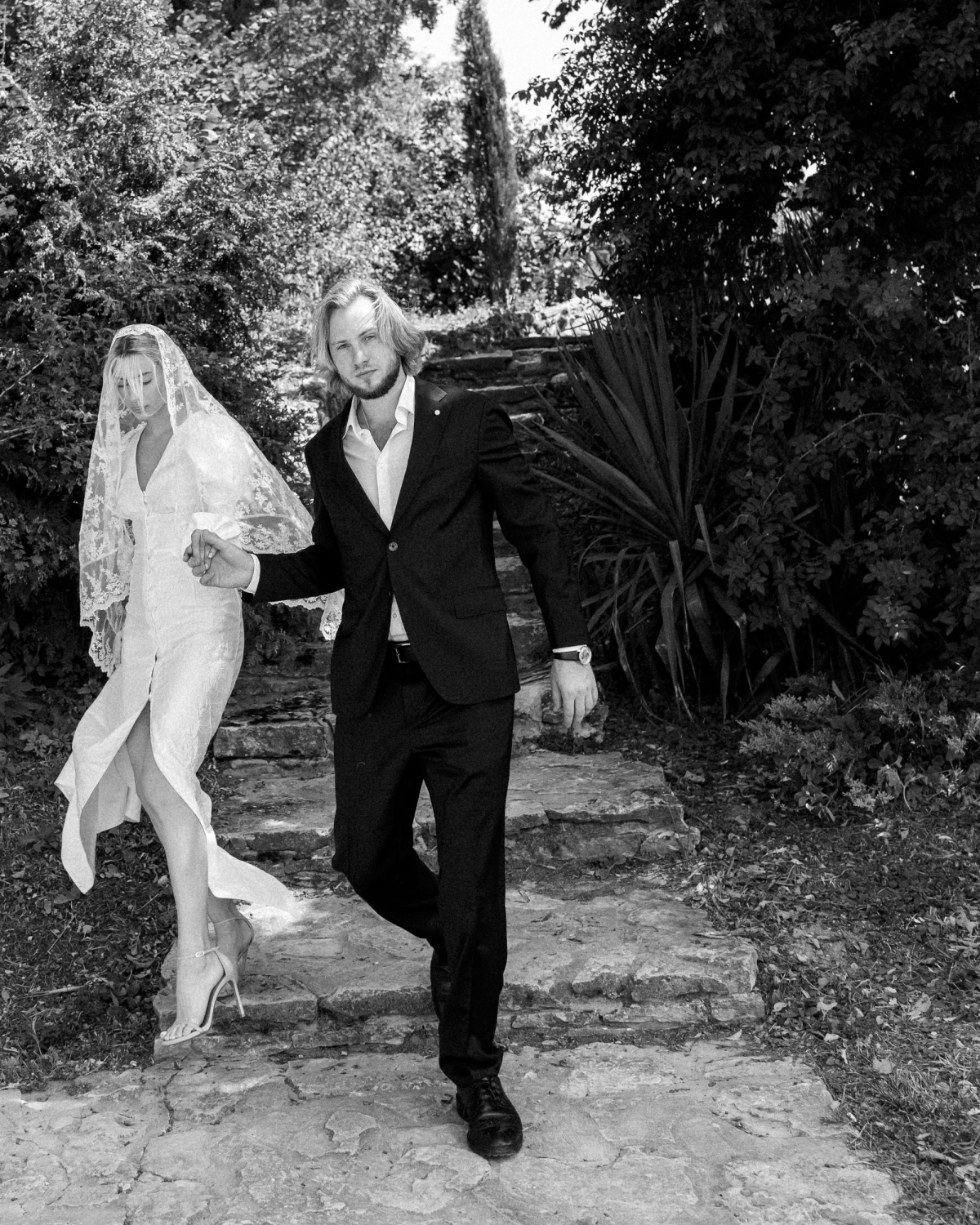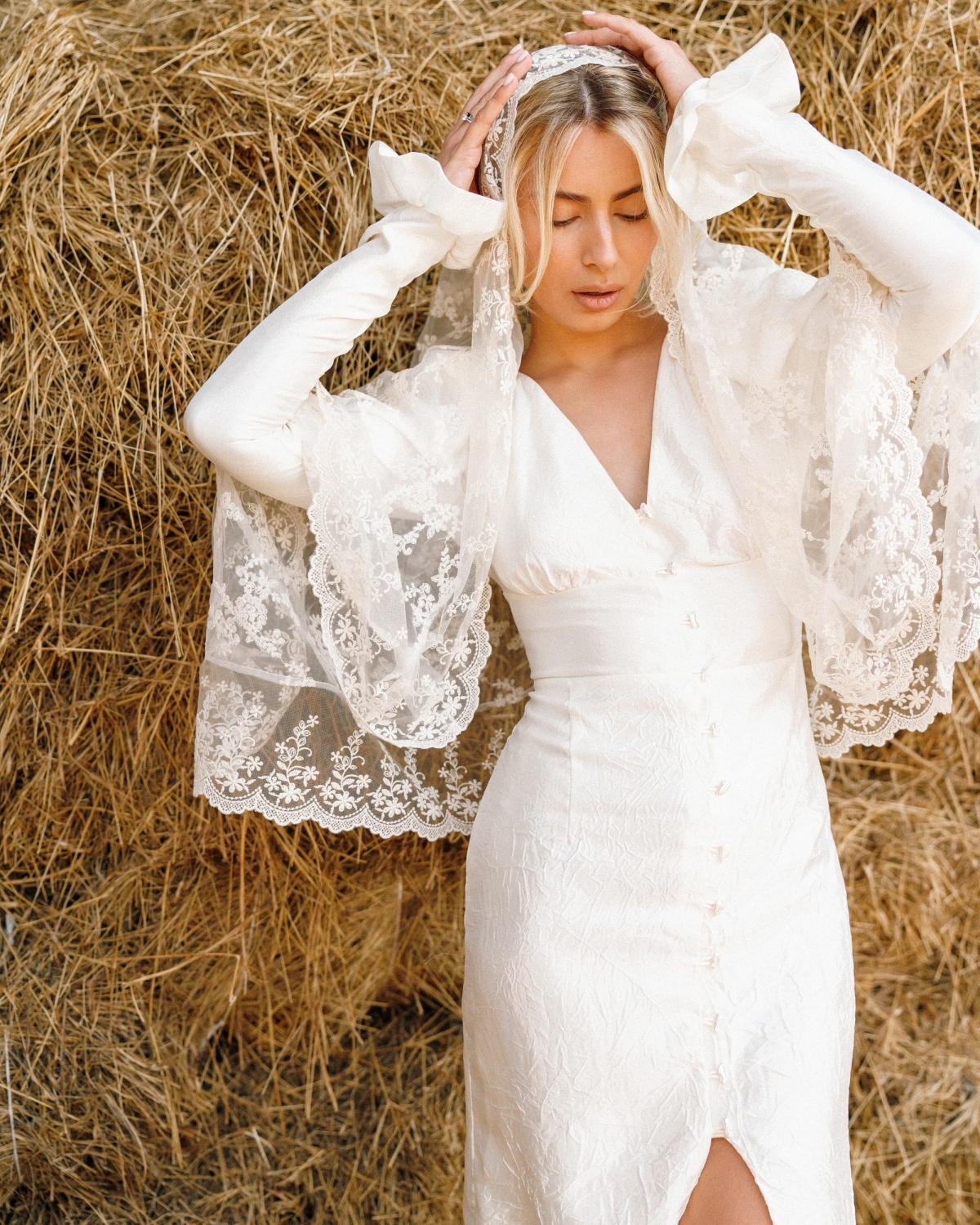Я выбирала его по картинке, что давно жила у меня в голове. Знала, что это не будет ни «рыбка», ни пышный А-силуэт. Хотелось длинный рукав, фактуру, интересную ткань, что-то относительно минималистичное, но при этом по фигуре и очень «мое». В итоге идеальное платье нашлось у Оли Silk and Lace. К нему была фата-испанка с кружевным краем — она добавила образу какой-то спокойной классики.