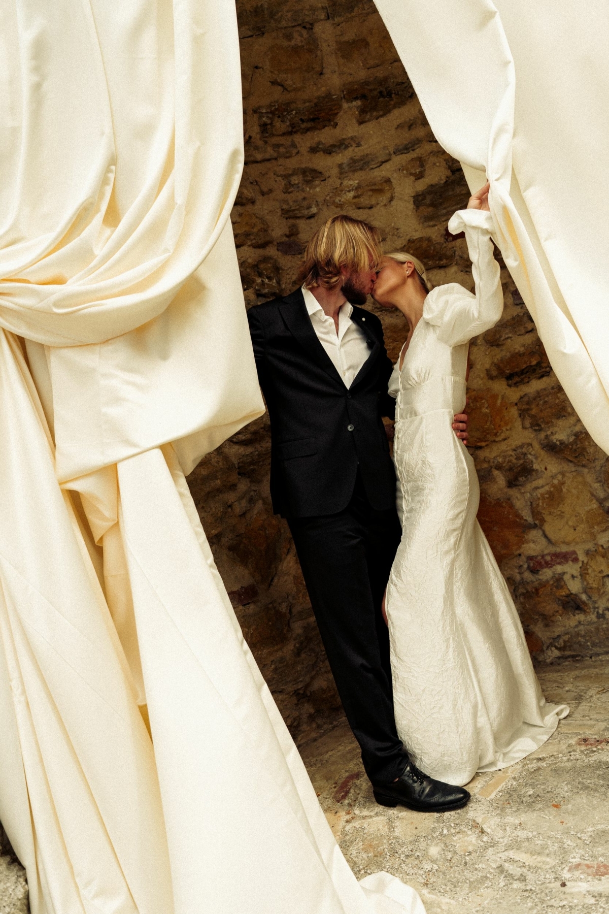 Арка для церемонии тоже минималистичная: просто лоскуты молочной ткани. Но выглядело невероятно свежо, стильно и очень органично для нашей пары. Для меня это было главным — чтобы я посмотрела на декор и удовлетворилась на 100%. И, судя по реакции гостей и по отзывам в интернете, наша стилизация зашла многим. Это, конечно, безумно приятно.