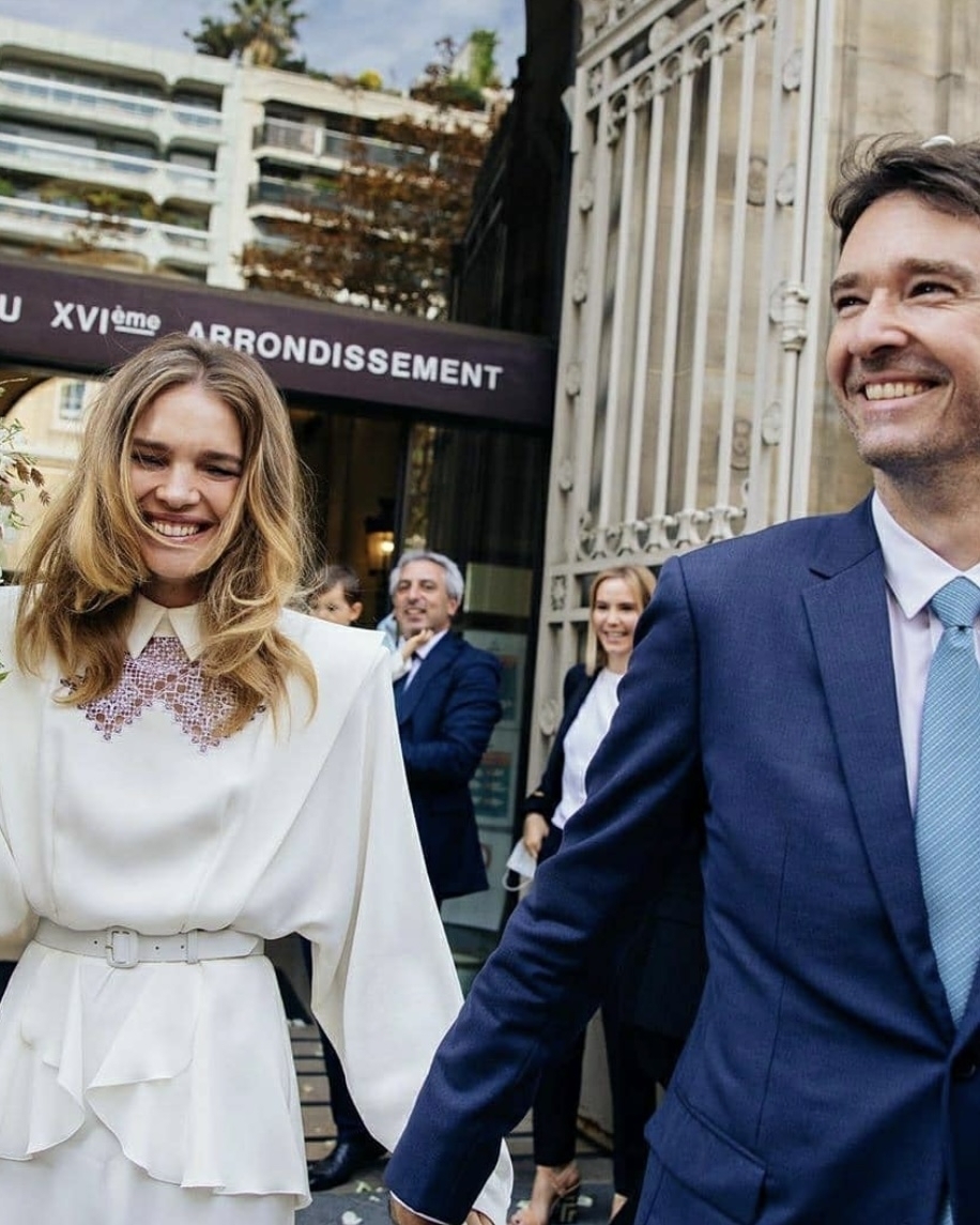 Но COVID‑19 внес свои коррективы в планы пары, и вместо торжества 27 июня в аббатстве Сен-Пьер д'О Антуан и Наталья смогли официально оформить свои отношения лишь 21 сентября в муниципалитете 16-го округа Парижа — и только в кругу самых близких. Для росписи модель выбрала кремовое платье с объемными плечами и вышивкой из кутюрной коллекции российского дизайнера Ульяны Сергеенко.