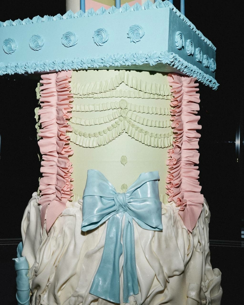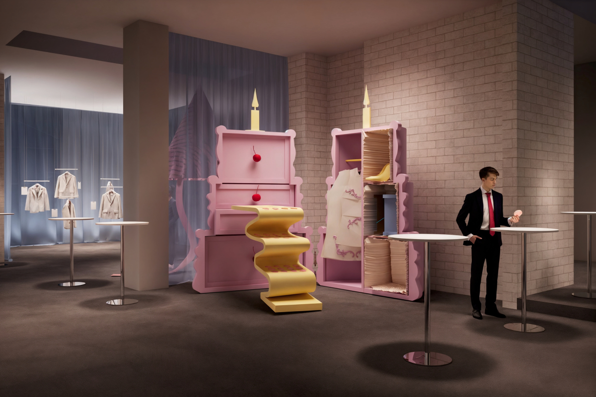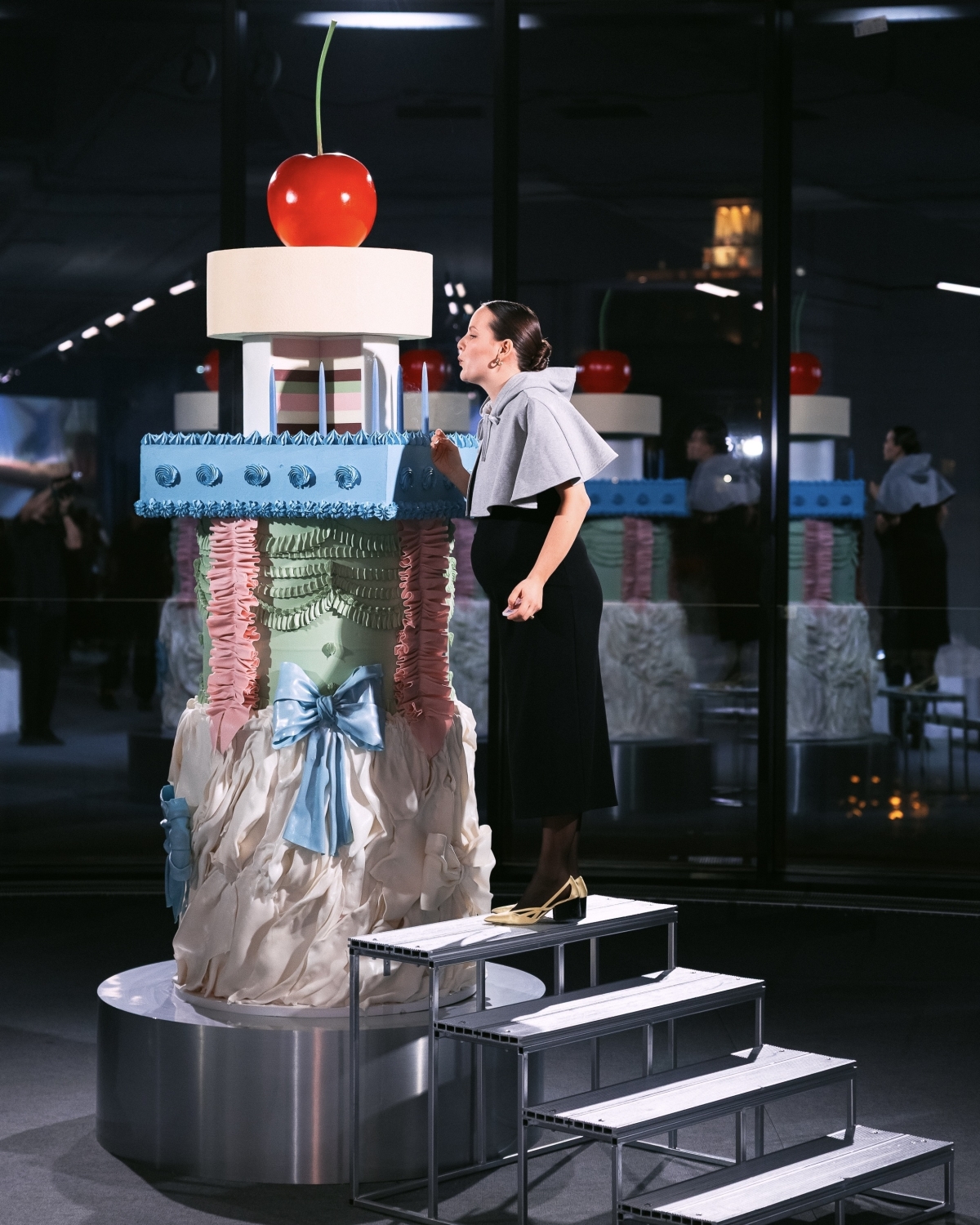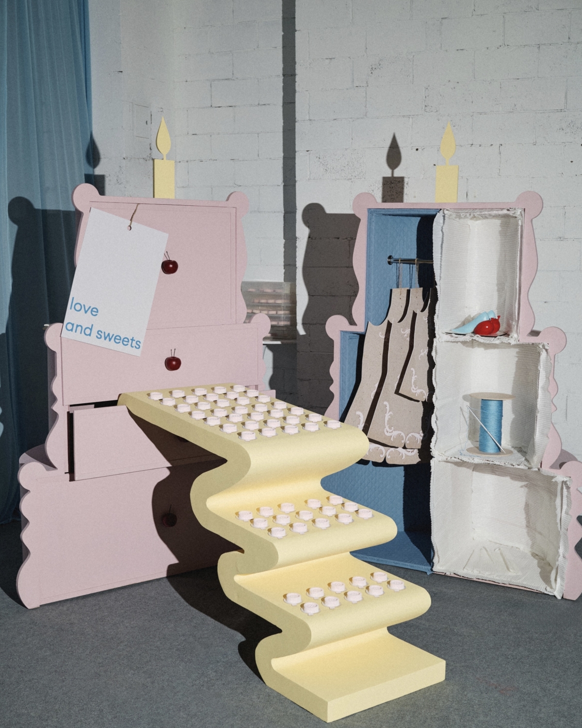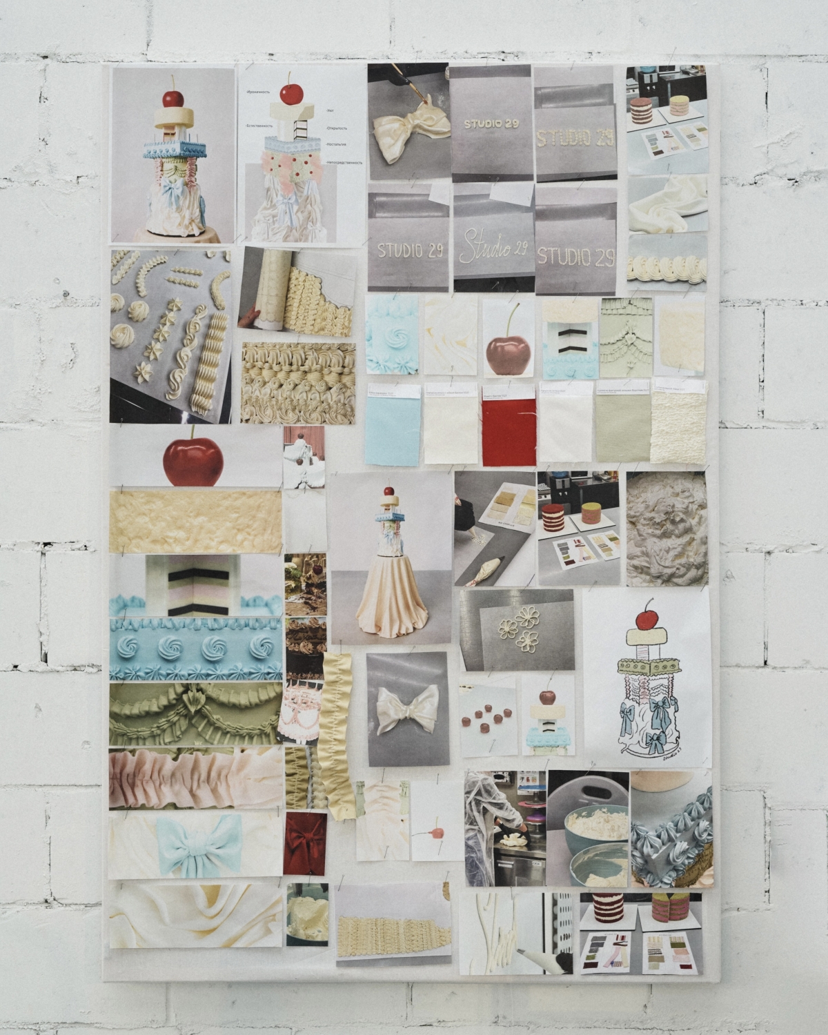 Мы знали, что из-за схожей легкости и эстетики брендов юбилейная коллекция STUDIO 29 планируется совместно с кондитерской "Любовь и сладости". Плюс у девочек было четкое представление о том, какие моменты нужно обязательно отразить на показе, и мы этого придерживались. Сделали дизайнерскую мастерскую, где на компьютере транслировалось зацикленное видео, как создается изделие от эскиза до производства; полотно-манифест, центральную фотозону для гостей, для которой использовали ткань с логотипом. Было также пространство с большим тортом и десертами в форме маленьких пуговиц от "Любовь и сладости".