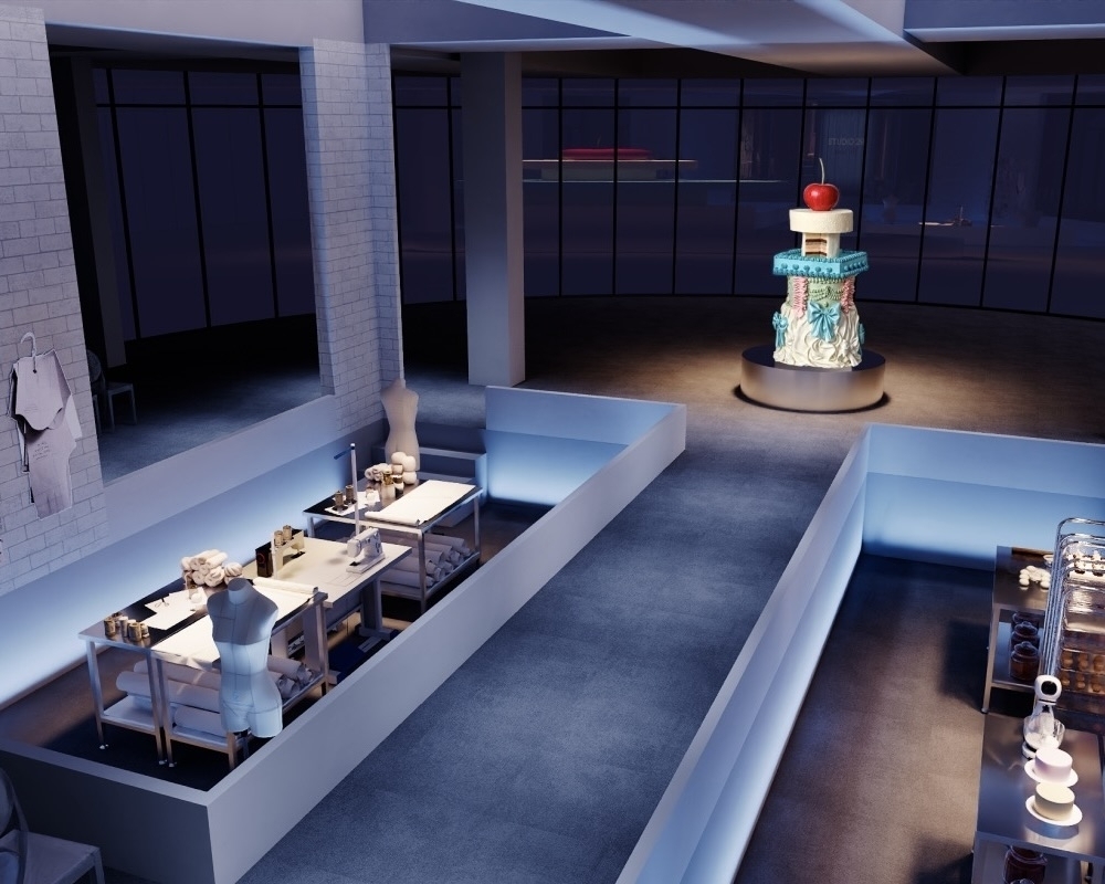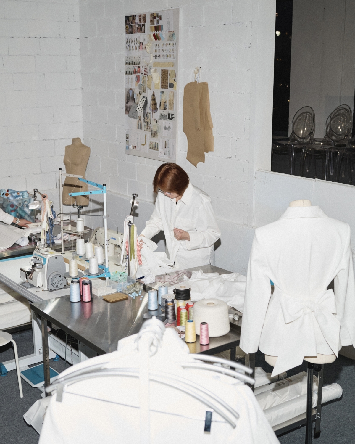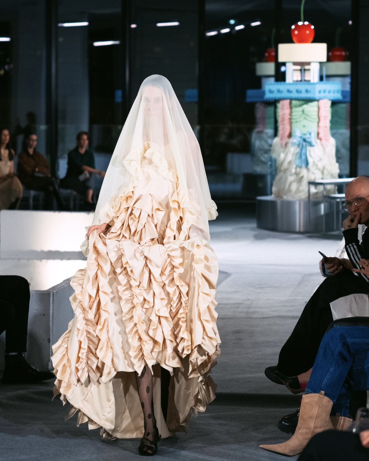 Что касается самого процесса, то изначально была сложность в том, чтобы найти площадку. Перебрали сотни вариантов, пока не наткнулись на Садовническую, 29. Оттуда еще открывается классный вид, — это подкупило сразу. Плюс на площадке мы сразу заметили две ниши вдоль будущего подиума и подумали, что можно добавить шоу иммерсивности — поместить в эти зоны работниц, которые прямо во время показа трудились бы над одеждой, а также кондитеров, которые делали бы десерты. Вся проходка моделей была круговой, как и посадка, поэтому эти ниши гости видели хорошо из любой точки. Нашей задачей было не только отразить, но и показать новую коллекцию из 41 образа для более двухсот человек.