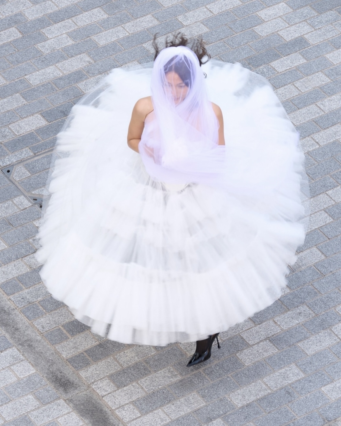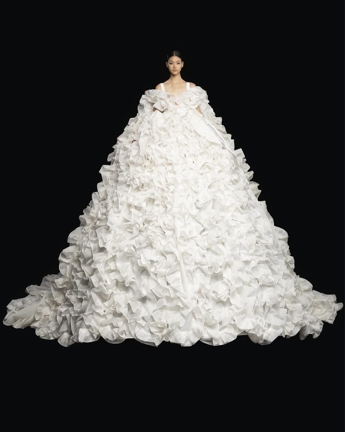 Даже идеально подобранная длина юбки может не сработать, если дизайн включает детали, искажающие пропорции. В их числе — слишком тонкая ткань, блестки, крупная отделка в виде бантов и неуместные разрезы. Все это визуально добавляет несуществующего объема и подчеркивают неровности, акцентируя внимание на том, что хотелось бы скрыть. Так что если вы невеста с женственной фигурой, как у Рири, — с округлыми бедрами и немаленькой грудью, — старайтесь балансировать пропорции тела уместным объемом, чтобы все выглядело пропорционально. Здесь подойдут силуэтные юбки в пол и платья-«рыбки».