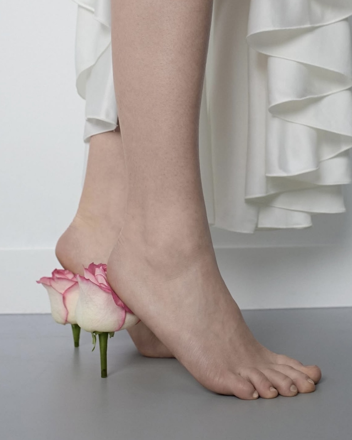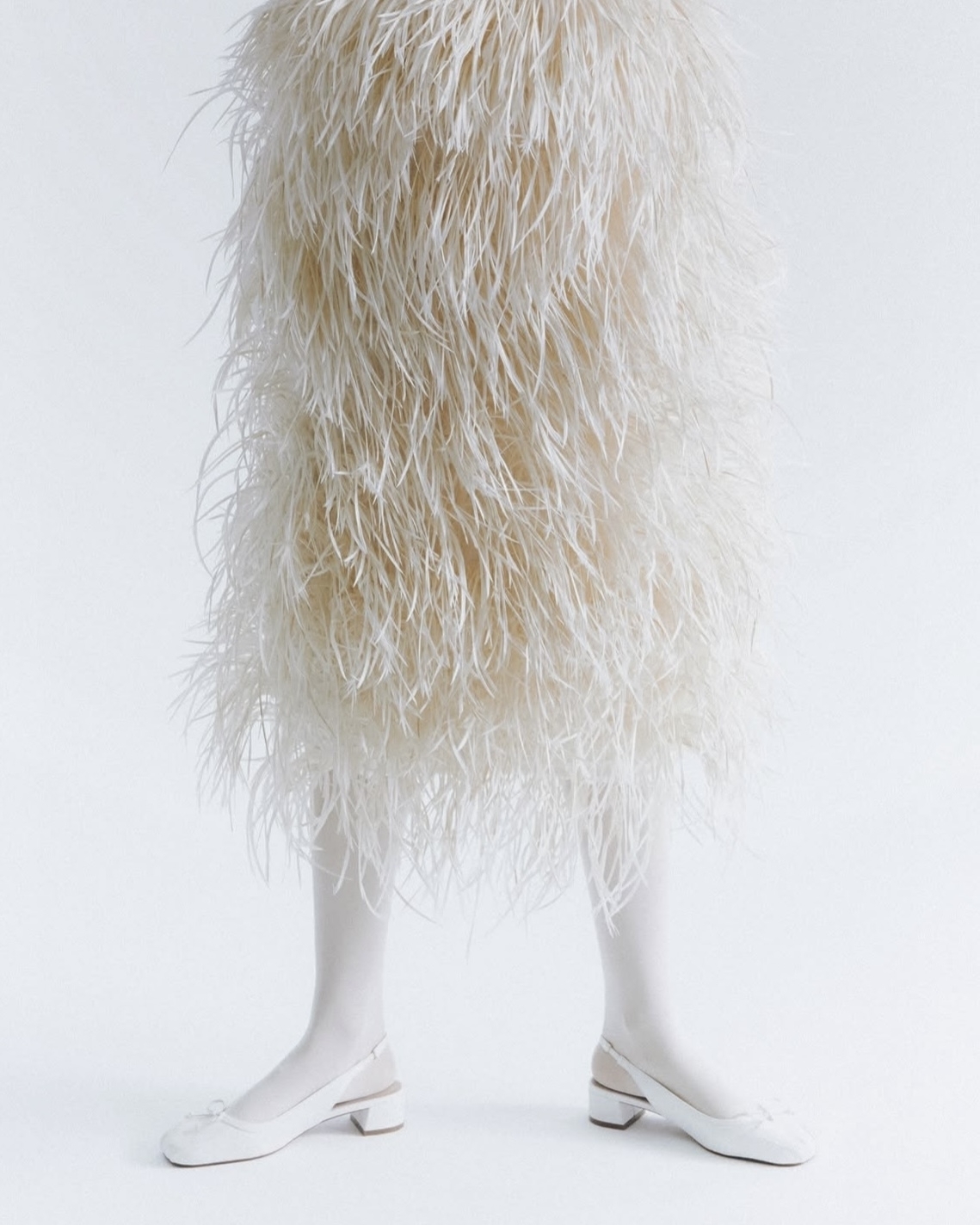 Длина юбки невесты зависит не только от фигуры, но и от предполагаемой обуви (ну или наоборот). И так как одно без другого существовать не может, советуем пойти от простого, — подбирать туфли к уже купленному платью. Так вам будет проще соблюдать пропорции и не «порезать» ноги акцентной отделкой. Миниатюрным девушкам лучше избегать сочетания мини и туфель завязками на щиколотках. Визуально это может укоротить ноги и сделать фигуру несуразной. Вместо этого лучше выбирать обувь, которая визуально удлиняет ноги: мюли на каблуке, минималистичные босоножки с тонкими ремешками и лодочки с острым мысом.