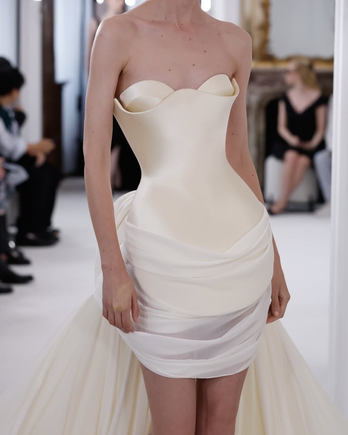 Архитектурные свадебные платья тоже имеют вес, но без перегиба в драматизм и сюрреализм. По мнению сильного пола, всегда уместно выглядят длинные рукава, фактурные сборки и драпировки, а также фасоны-рыбки с акцентным подолом. Обтекаемые формы, кстати, тоже нравятся мужчинам! Поэтому легкая утяжка в талии, небольшие кринолины и подплечники, которые визуально делают силуэт более пропорциональным, тоже хорошая идея для свадьбы.