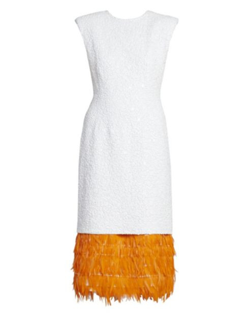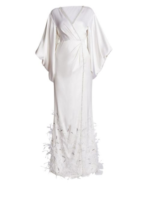 На фото видно, что грузчик в одной руке держит вечерний женский наряд, а в другой — мужской, который вполне может оказаться праздничным смокингом Трэвиса Скотта. К сожалению, деталей на снимке рассмотреть нельзя, но видно, что подол платья Кайли украшен развевающимися на ветру перьями. Кроме того, мы точно знаем, что купили его в знаменитом нью-йоркском универмаге Saks Fifth Avenue: его логотип хорошо виден на чехле наряда. Вряд ли, конечно, девушка с состоянием в миллиард долларов приобрела уже готовое платье, но мы решили немного пофантазировать и нашли несколько образцов в универмаге, которые могли бы стать основой для ее индивидуального дизайна.