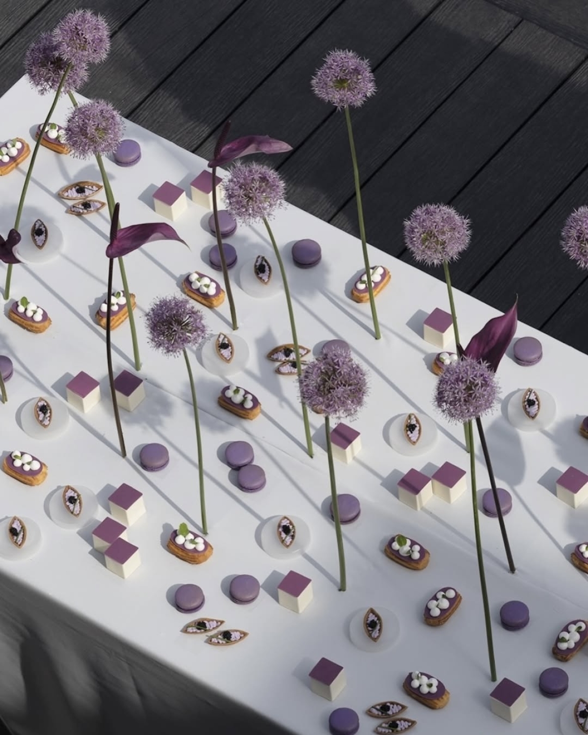 Канапе, выложенные в ряд, по кругу или в шахматном порядке, вполне могут заменить любой другой концептуальный декор. Для большего масштаба выбирайте акцентные поверхности, играйте с длиной сеттинга и направляйте точечный свет на каждую из закусок. Так подача еды будет выглядеть как арт-объект.