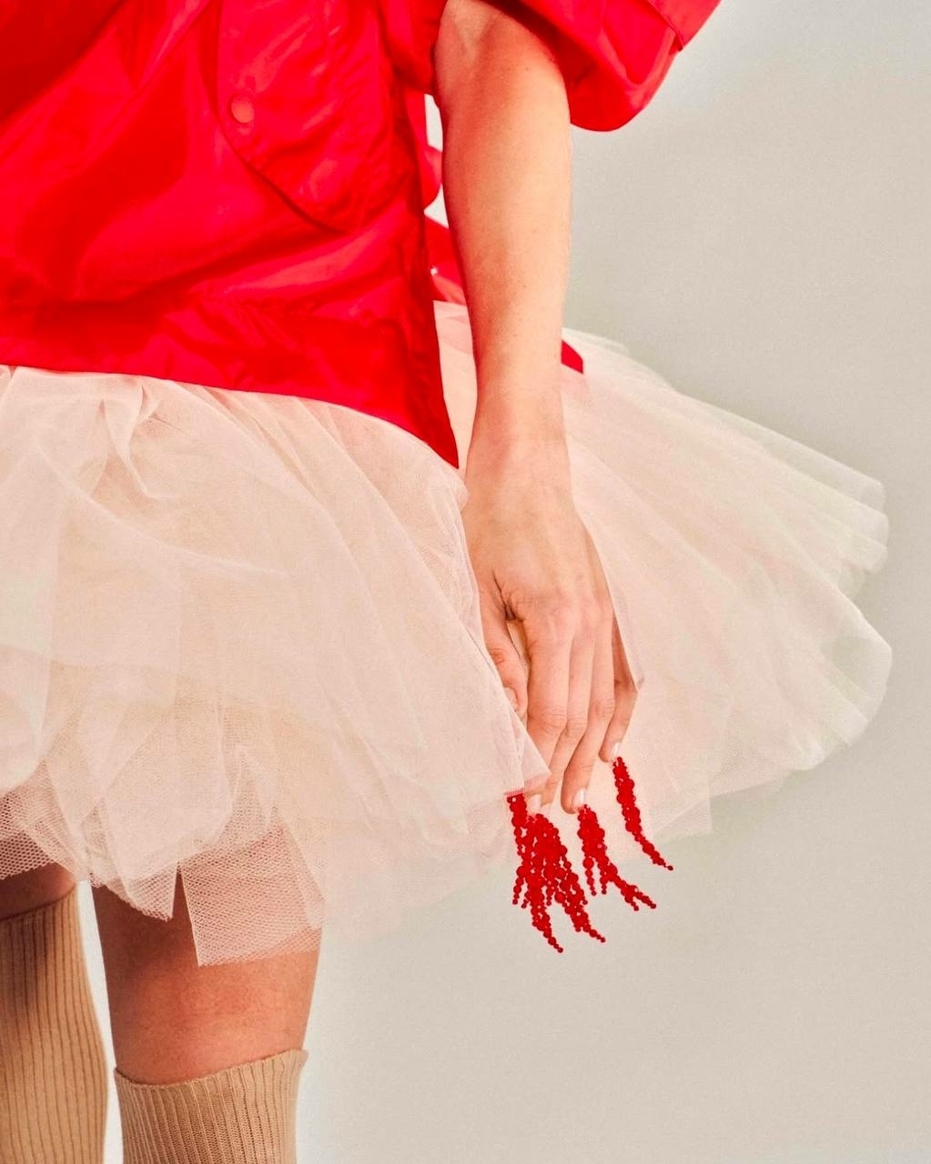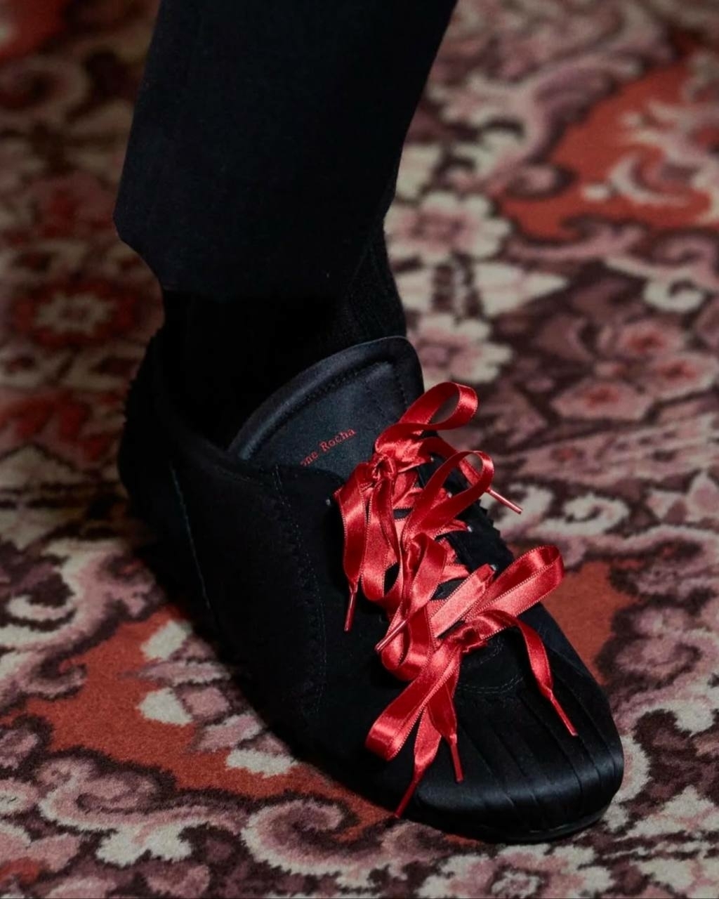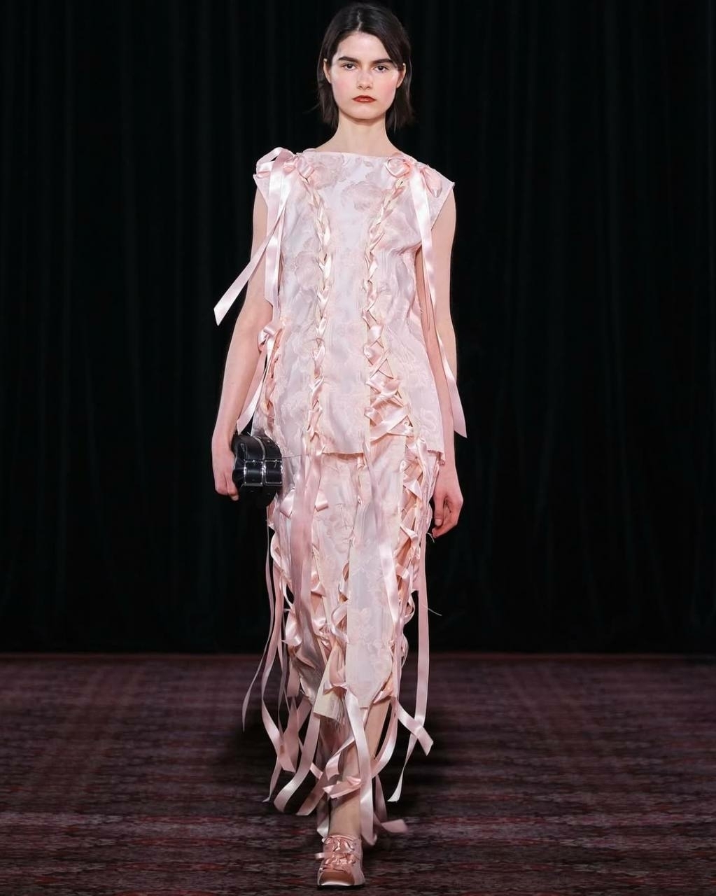 Оригинальную идею невестам подсказала Симона Роша, которая в этом сезоне сделала длинные ленты полноценной частью образа и мастерски соединяла ими отдельные части топа или юбки. Этот же прием, но на контрасте цветов она обыграла с красным атласом, который пронизывал черное (а почему бы не белое?) платье, и как дополнение заменял шнурки на обуви.