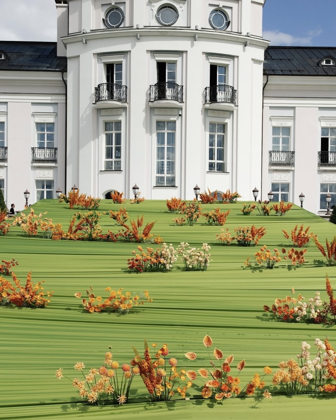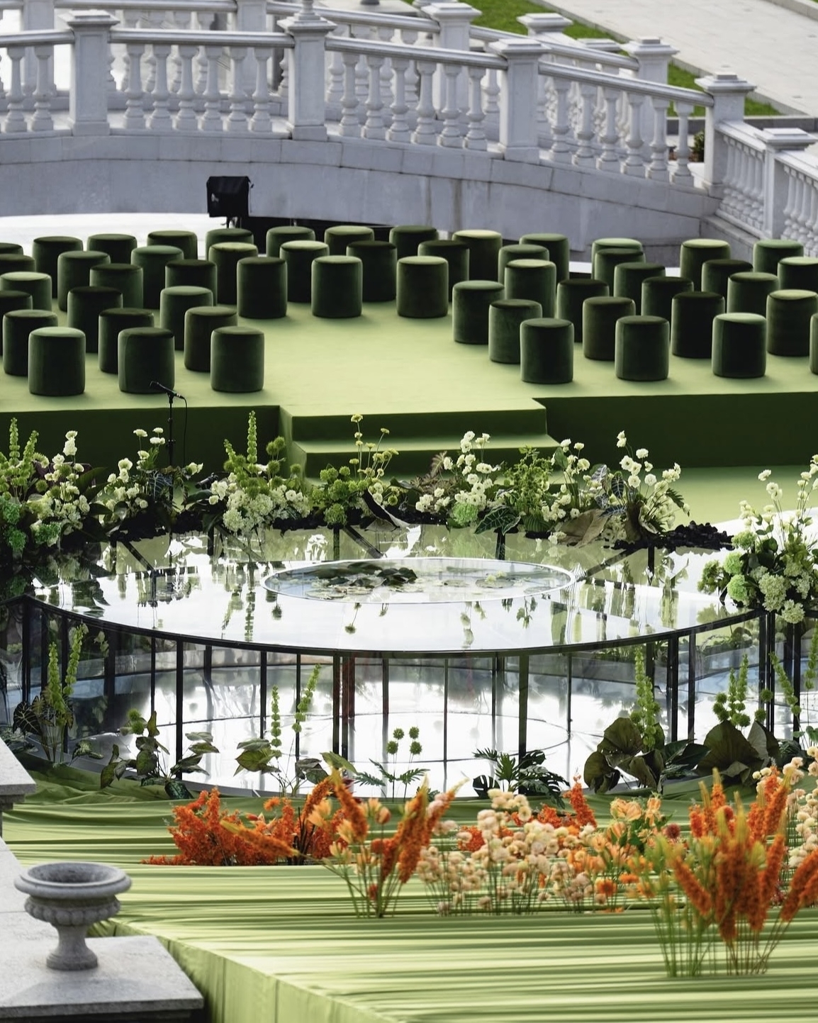 Цветочное оформление тоже может выглядеть нереально. В проекте декоратора Alania это стало возможным за счет асимметричных форм, масштабов и световых акцентов, которые на контрасте с историческими интерьерами визуально приближали декор к AI-генерациям. Так, входную зону украшала стена из гортензий, будто тающих в пространстве, ужин — графичный стол-кольцо. Отсутствие яркого света тоже добавляло атмосферы. При этом все ключевые элементы в оформлении были отдельно подсвечены и не терялись в темноте. А сюрреалистичности добавляла еще и легкая дымка на горке шампанского.