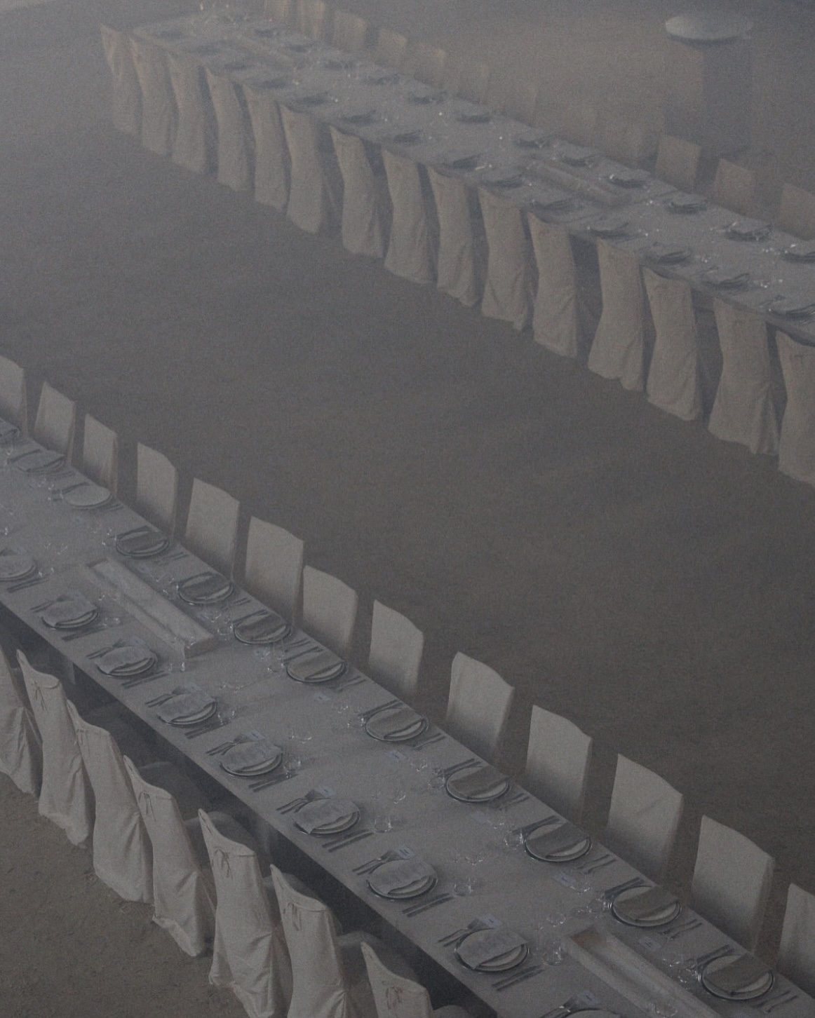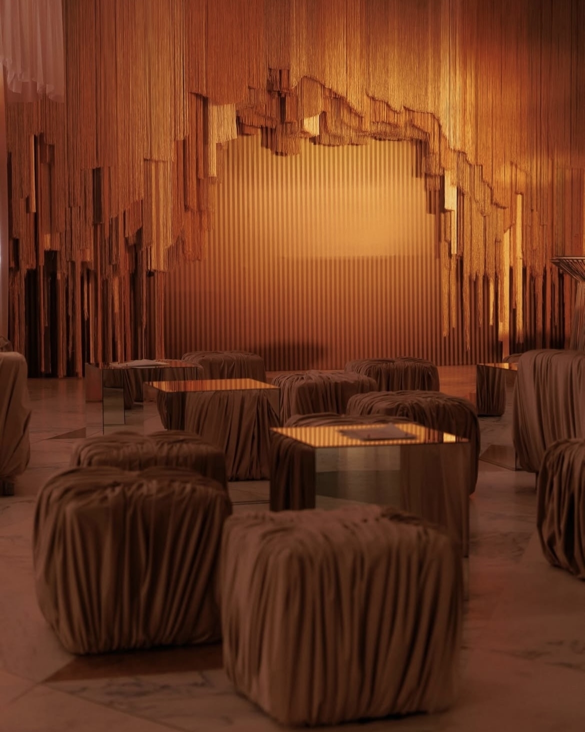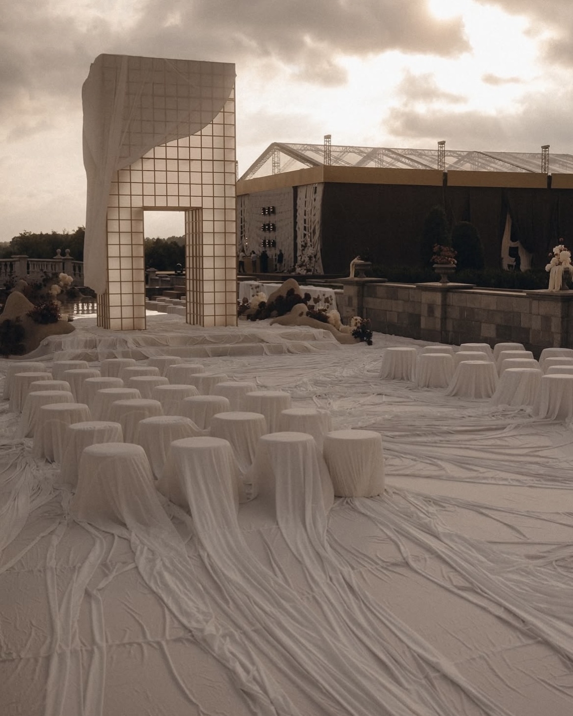 На полу — песок, стены оставлены нетронутыми тканями и глобальными конструкциями, а продуманная игра света и тени позволила сохранить аутентику пространства и подчеркнуть архитектуру без лишних вмешательств. Единственная доработка команды — каменный барельеф с античными фигурами, будто существовавший здесь всегда, и белые столы в тон инсталляции.