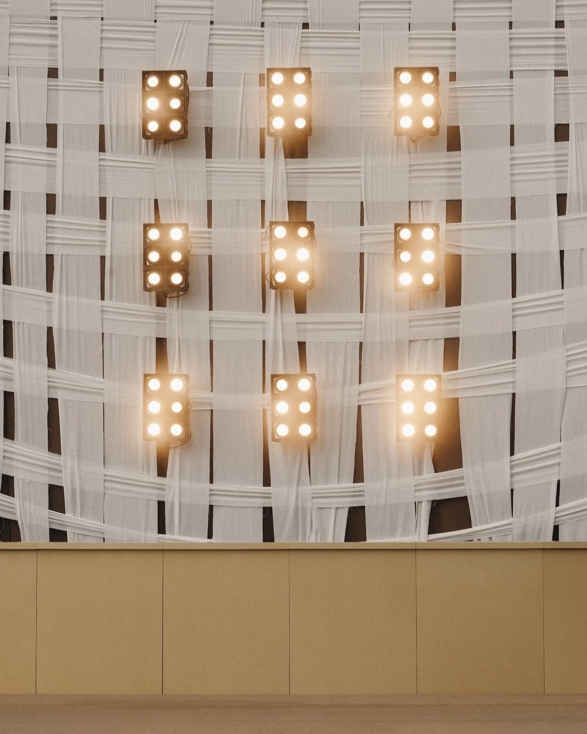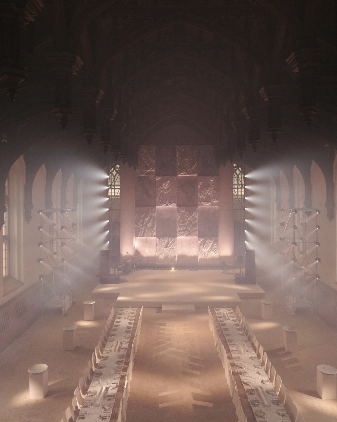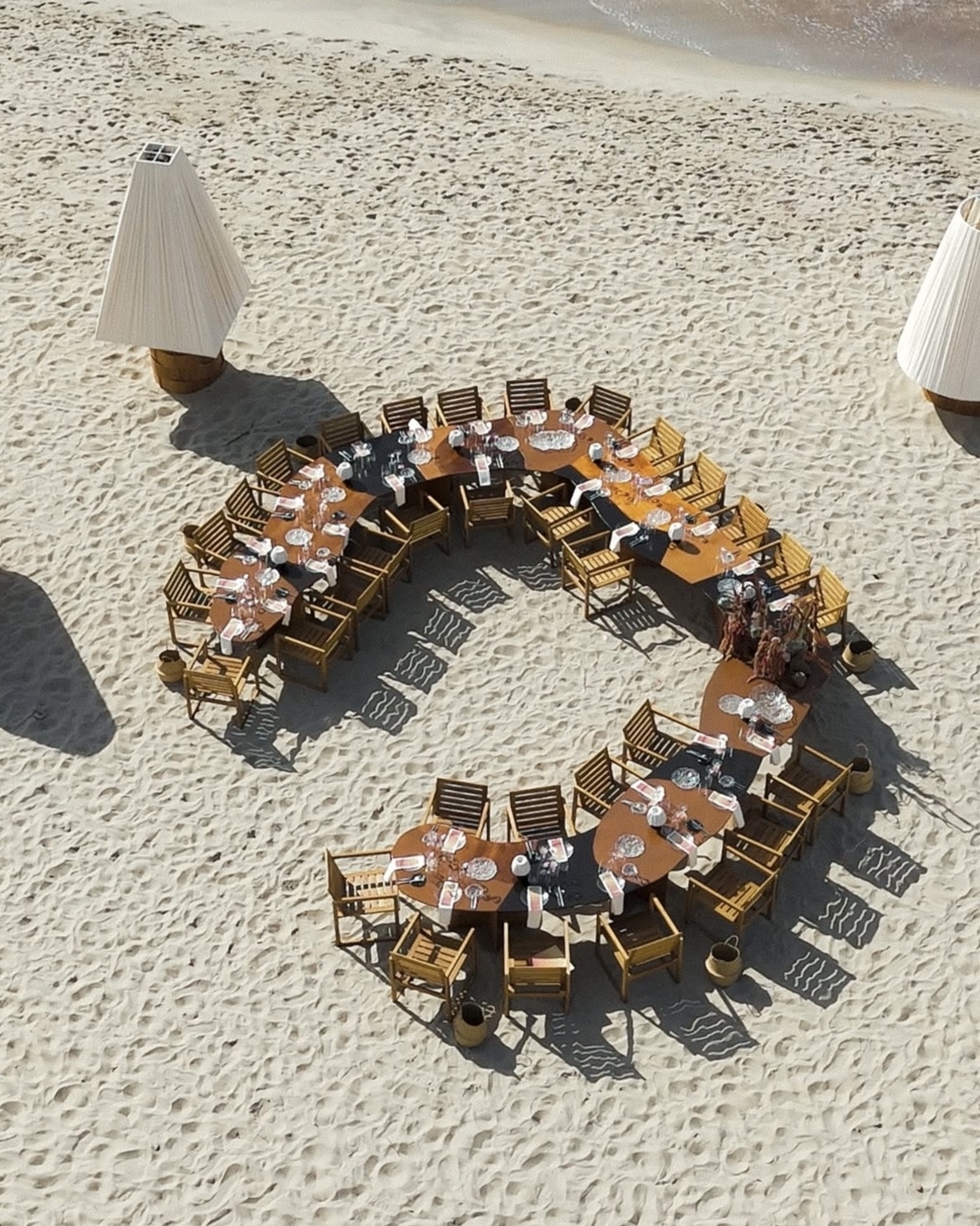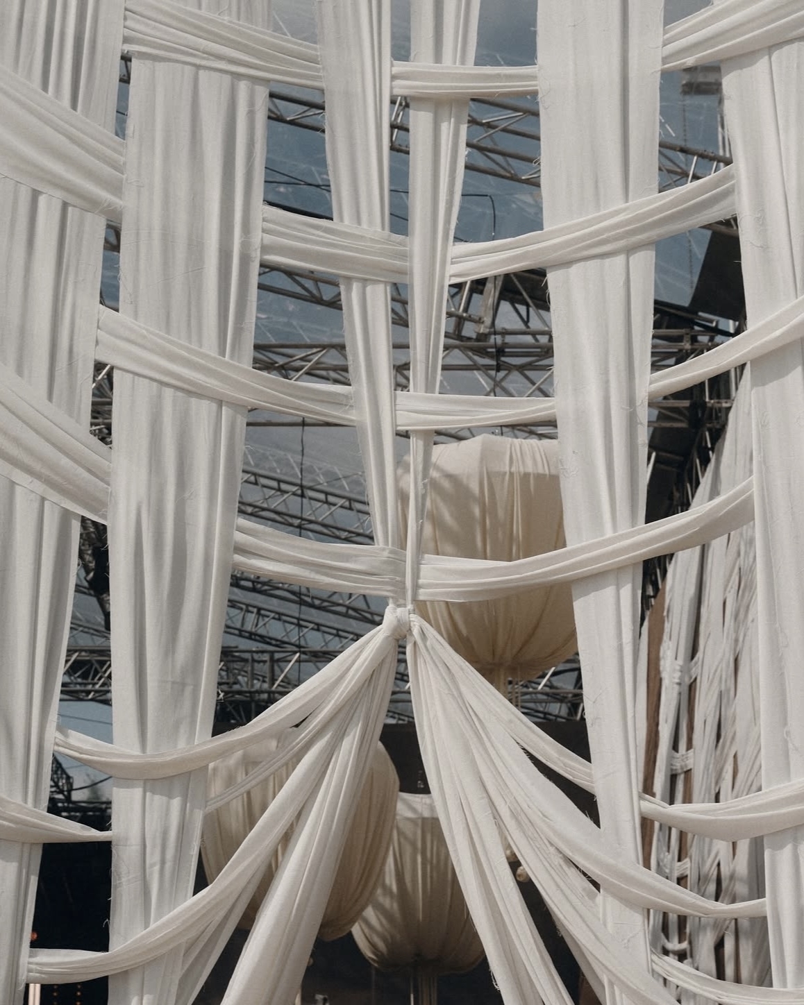 На полу — песок, стены оставлены нетронутыми тканями и глобальными конструкциями, а продуманная игра света и тени позволила сохранить аутентику пространства и подчеркнуть архитектуру без лишних вмешательств. Единственная доработка команды — каменный барельеф с античными фигурами, будто существовавший здесь всегда, и белые столы в тон инсталляции.