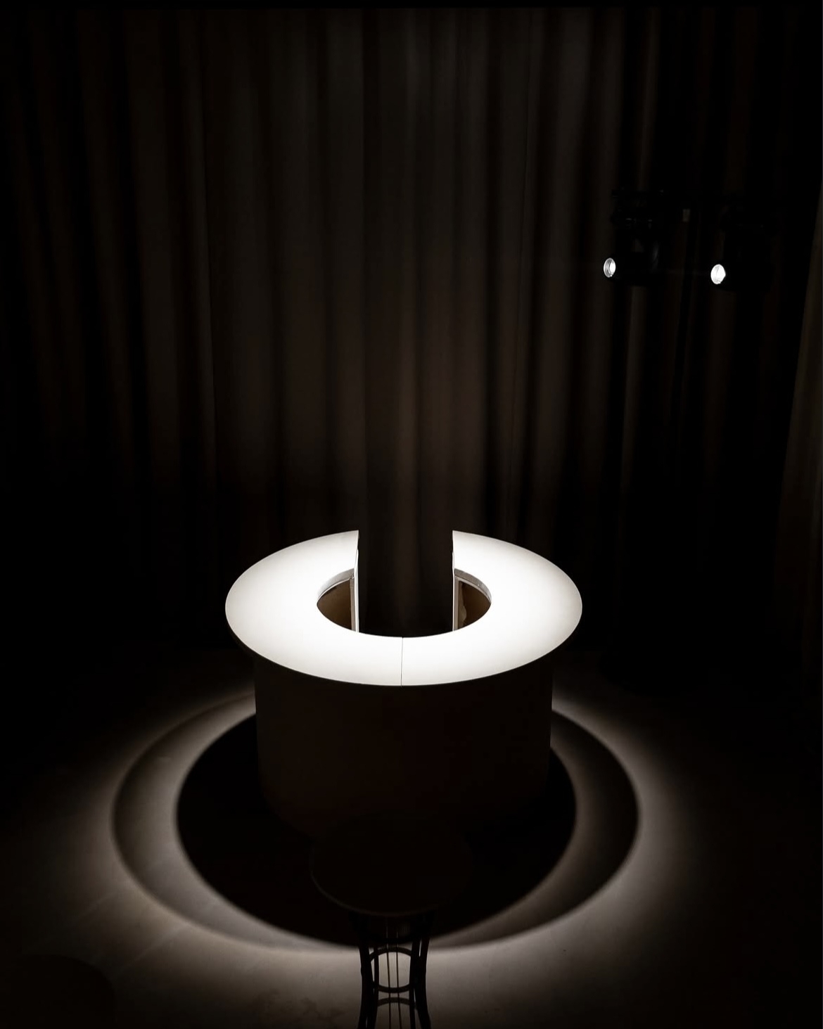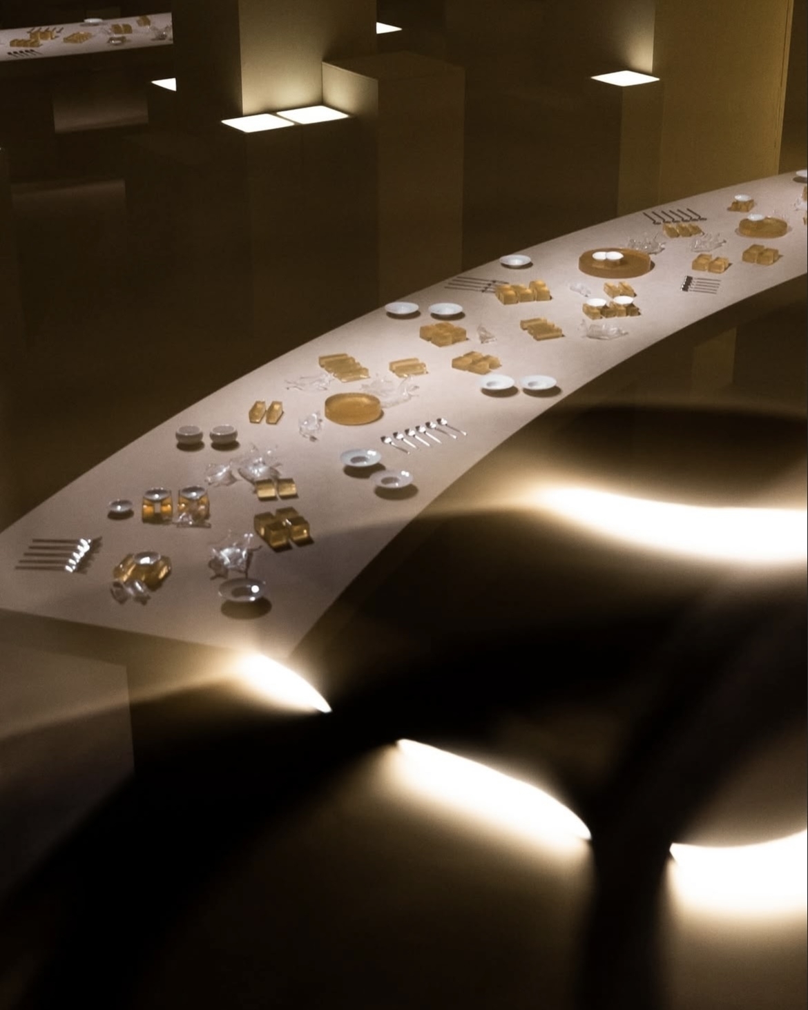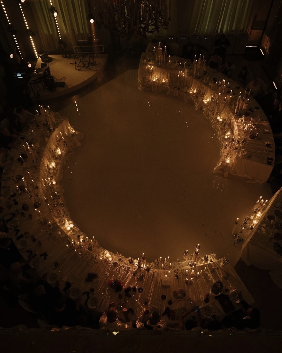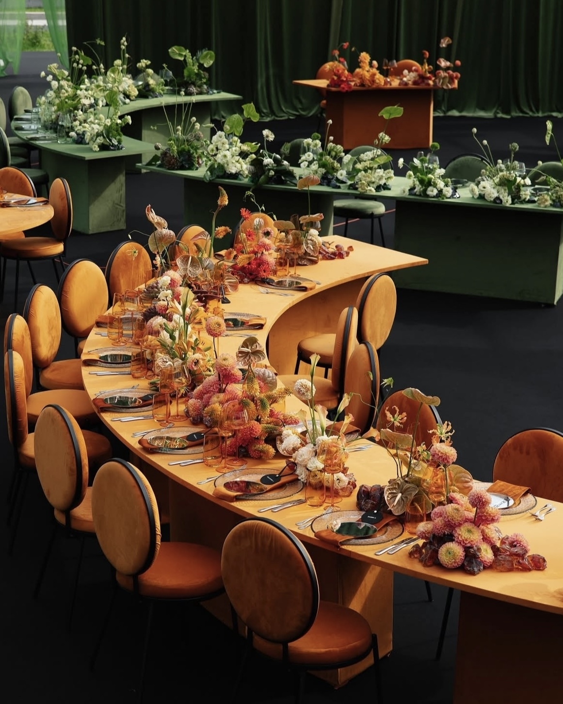 Полукруглые столы, драпировки, полная тьма и свечи — все в лучших традициях генераций, которые обычно создают нейросети по запросу «ужин при свечах в дворцовой эстетике». Но проект агентства Vzaimno реален, как и оформление от RDecor. Классика здесь звучит по-новому благодаря форме. Именно очертания столов в зоне ужина добавляли традиционной дворцовой эстетике нотку футуризма, а световые акценты в виде свечей и драпировки помогали соединить пространство и конструкции воедино.