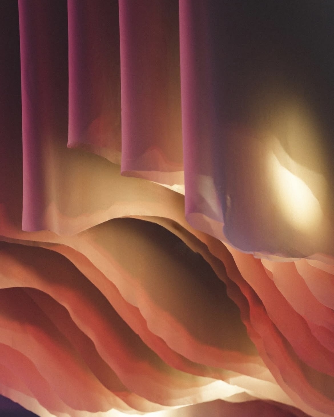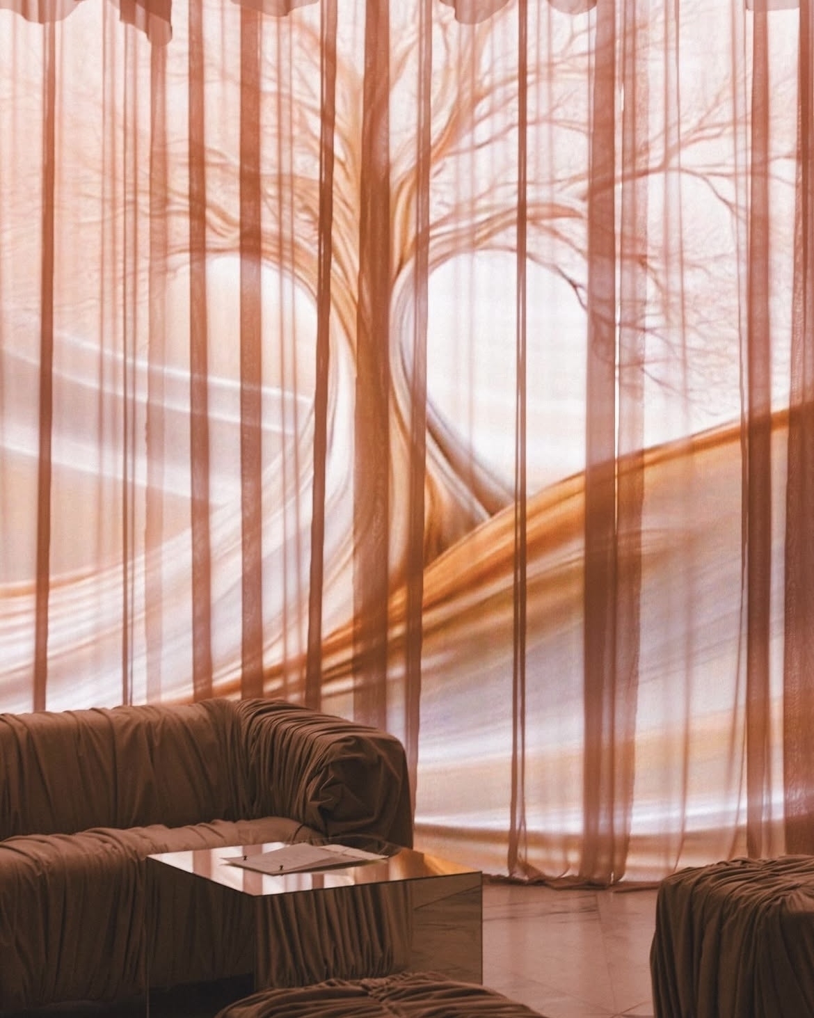 Проект декоратора Марии Герман в коллаборации с M2 Agency — симбиоз мягкой архитектуры и иллюзии движения. Эффект достигнут за счет многослойности, сочетания форм, тканевых сборок, сглаживающих углы, и световых акцентов. В основе оформления — теплая коричнево-оранжевая палитра, а редкие холодные градиенты добавляют объема и создают ту самую глубину, благодаря которой пространство выглядит живым и многогранным.