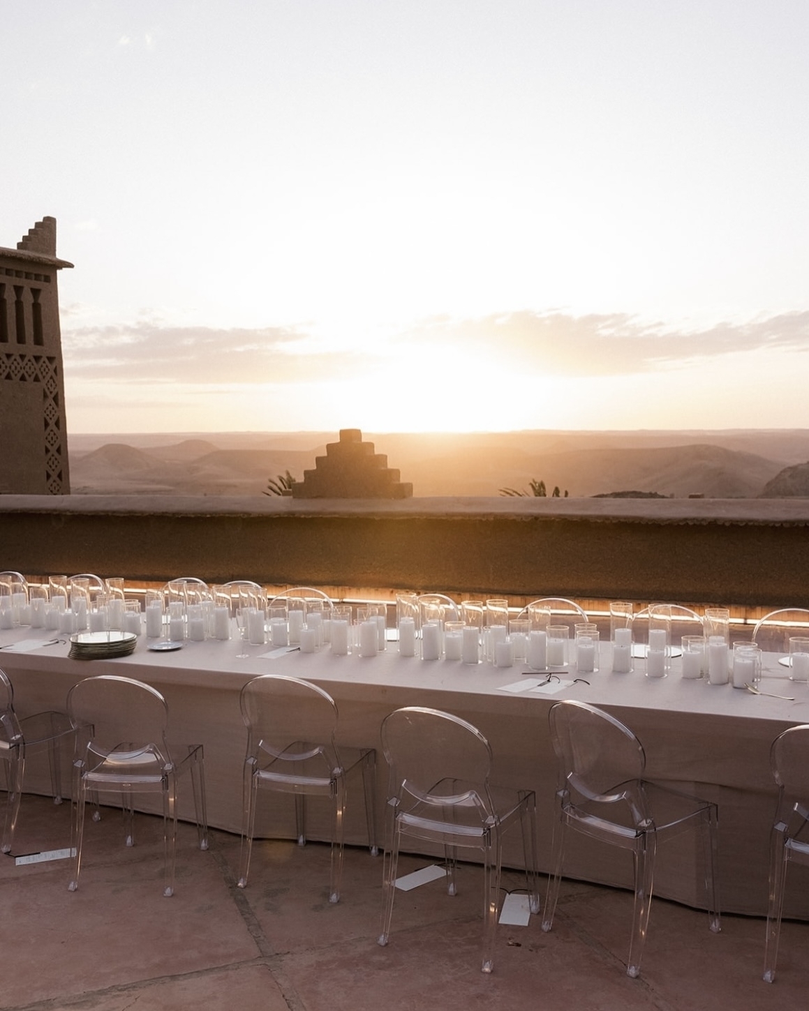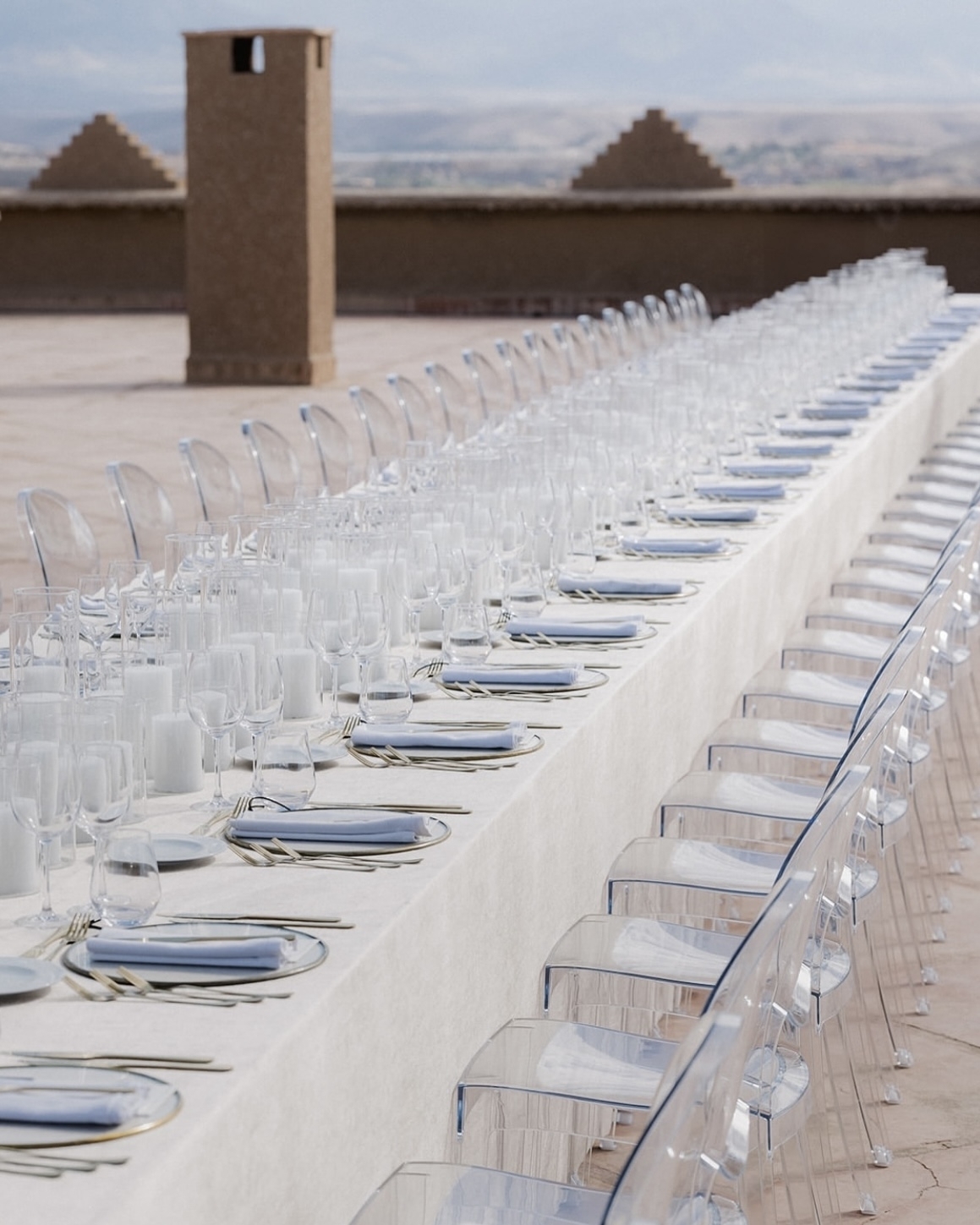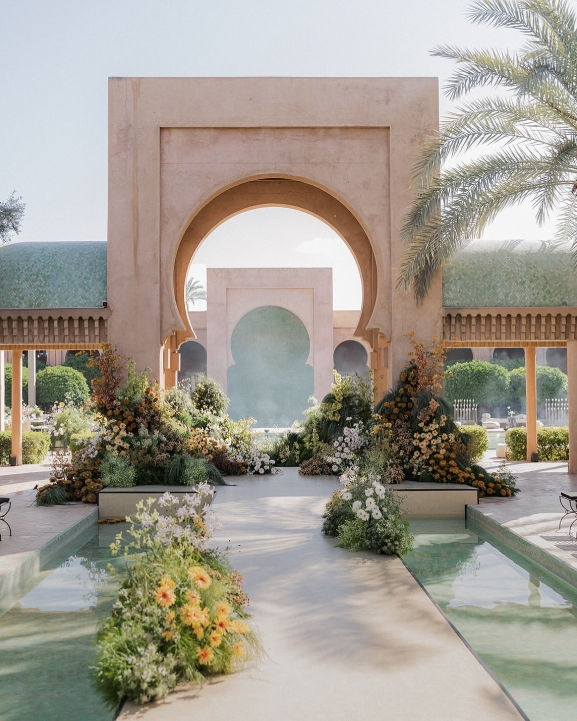 Бесконечно длинный стол с видом на бескрайнюю пустыню, монументальная архитектура и нарочито дикая флористика — виртуальная реальность наяву, которая стала возможна благодаря симбиозу агентства WeDoAgency и декораторов About You Decor. В основе концепции — современный марокканский стиль, концептуально обыгранный четкой геометрией в зоне ужина и асимметричными цветочными инсталляциями на церемонии. Но особенно нереальной общую картинку помогла сделать игра на контрастах. Здесь яркая свежая зелень противопоставляется безжизненной пустыне, а белый цвет, прозрачные стулья и легкая, искусственно созданная дымка, — аскетичным и одновременно величественным интерьерам отеля.
