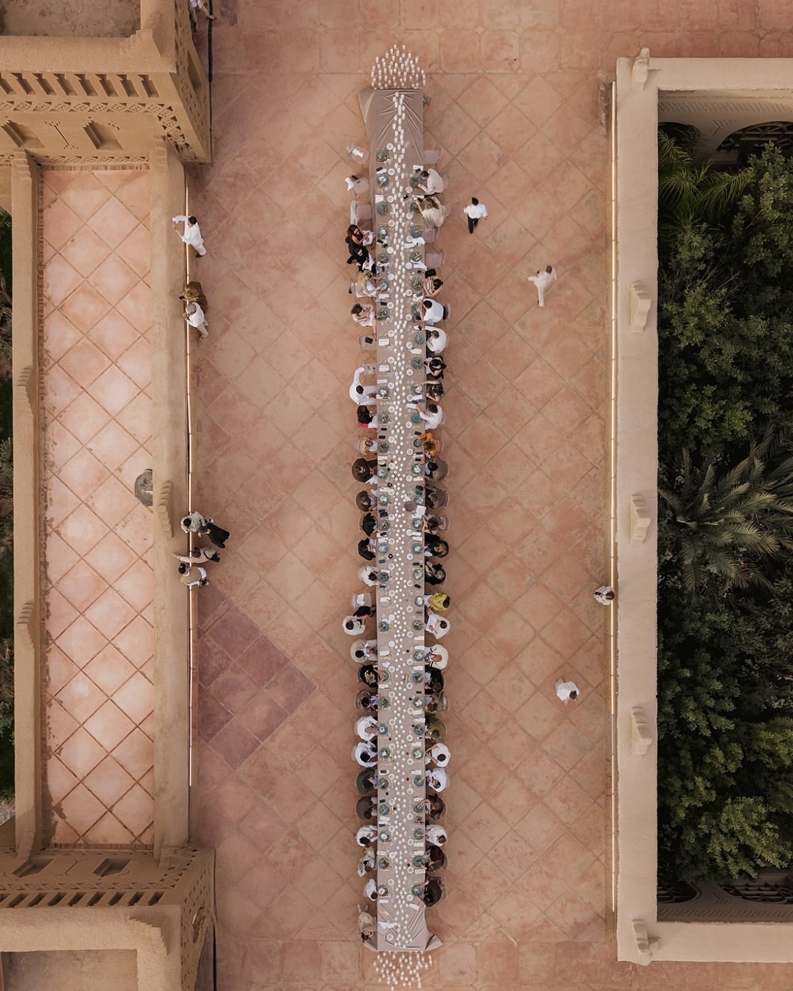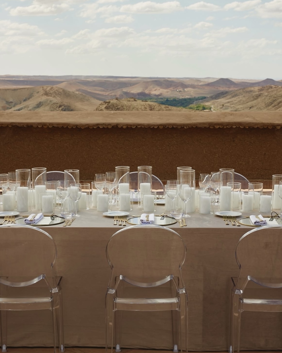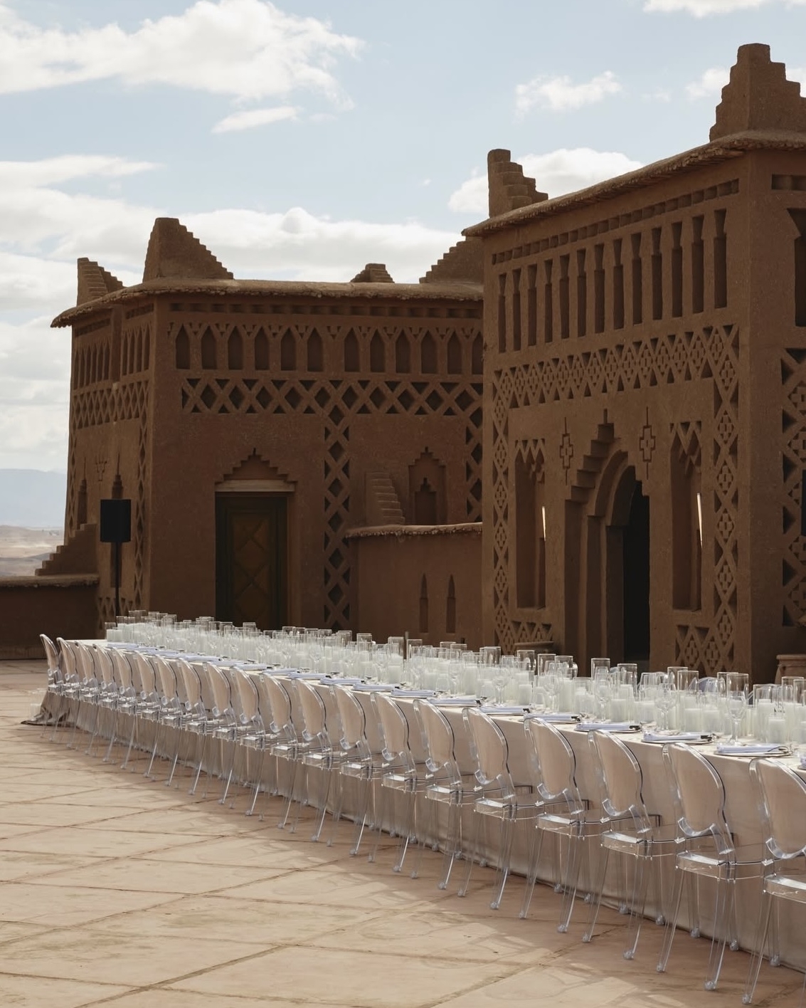 Бесконечно длинный стол с видом на бескрайнюю пустыню, монументальная архитектура и нарочито дикая флористика — виртуальная реальность наяву, которая стала возможна благодаря симбиозу агентства WeDoAgency и декораторов About You Decor. В основе концепции — современный марокканский стиль, концептуально обыгранный четкой геометрией в зоне ужина и асимметричными цветочными инсталляциями на церемонии. Но особенно нереальной общую картинку помогла сделать игра на контрастах. Здесь яркая свежая зелень противопоставляется безжизненной пустыне, а белый цвет, прозрачные стулья и легкая, искусственно созданная дымка, — аскетичным и одновременно величественным интерьерам отеля.