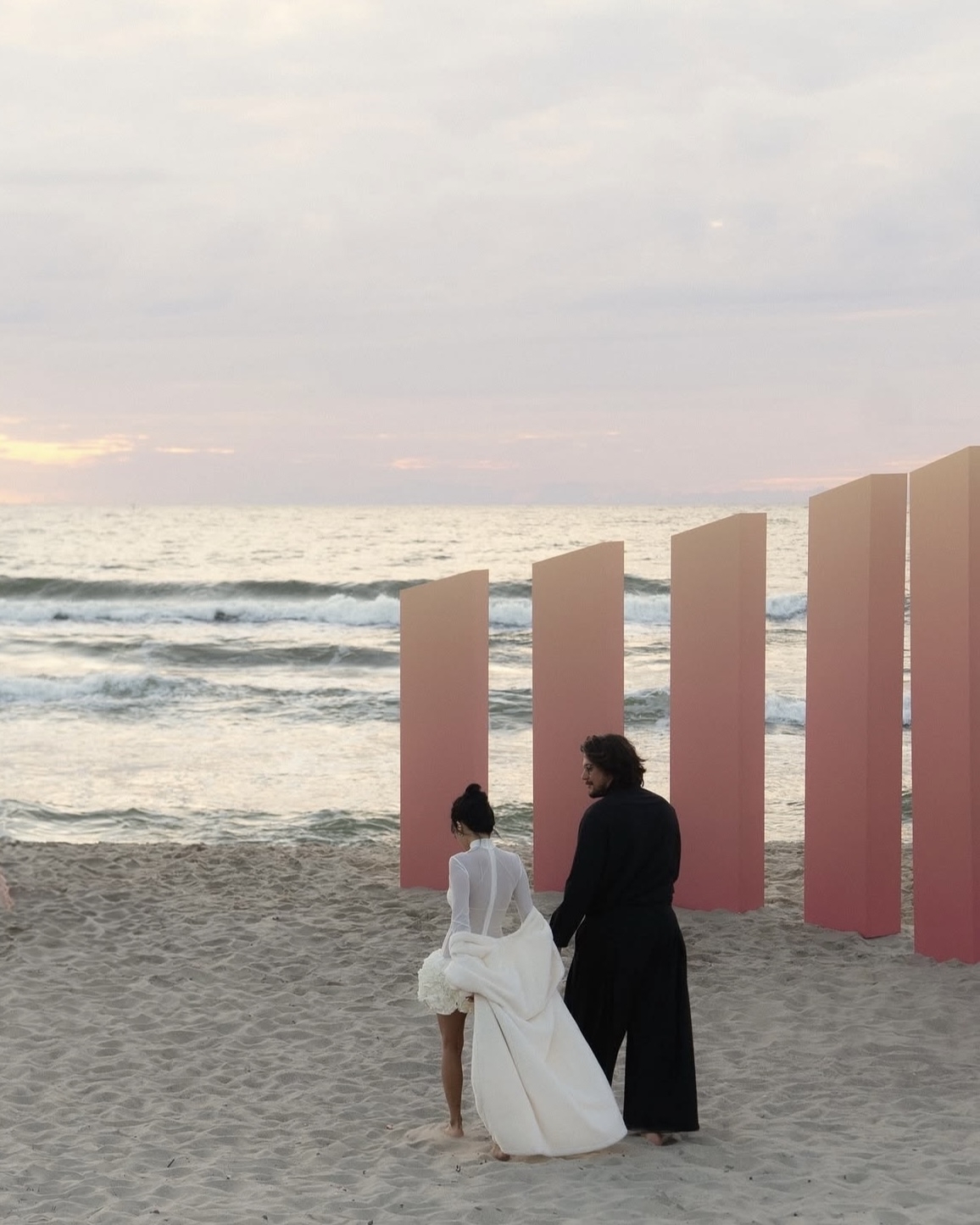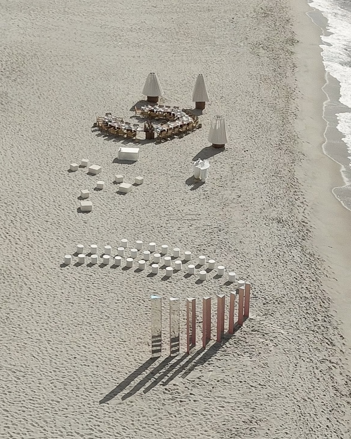 На свадьбе Serebro Wedding декораторы «Союз Декор» во главе с Татьяной Бугаевой не гнались за трендами, а следовали запросу пары: сделать что-то честное, чистое и по-настоящему «свое». Вместо закрытой площадки — безлюдный пляж с белоснежным песком. Для церемонии возвели зеркальные элементы, в которых отражалось закатное солнце, а для ужина выбрали деревянные столы и стулья, выстроенные полукольцом и дополненные гигантскими светильниками — отсылка к домашней, уютной атмосфере.