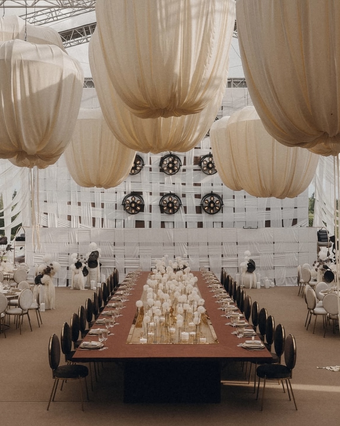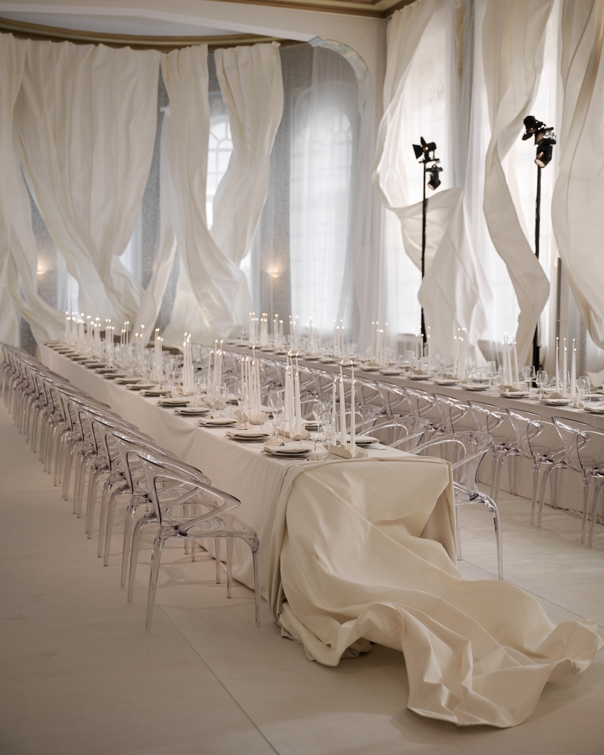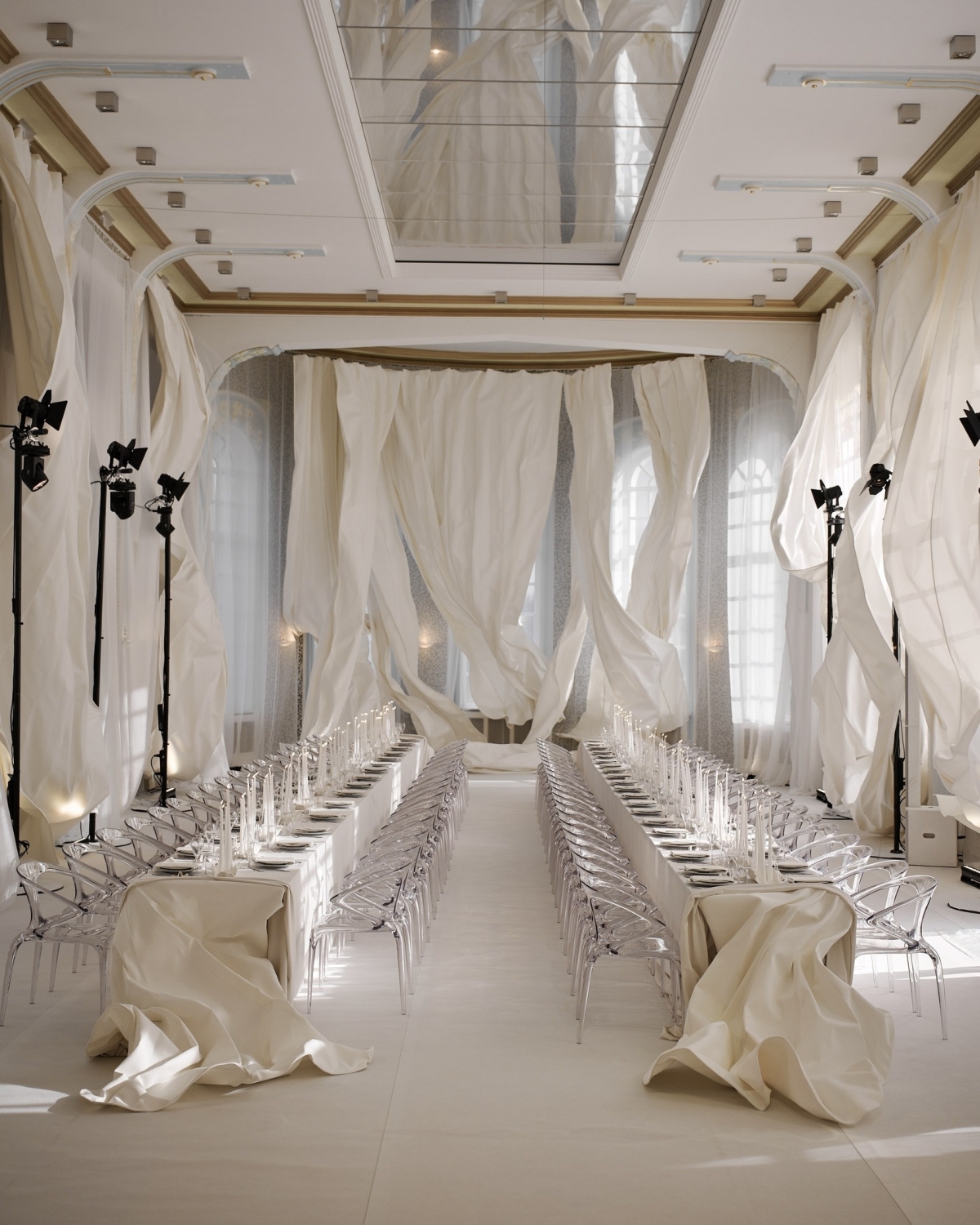 Идею «остановившегося времени» продолжили скатерти — они повторяли линии драпировок на стенах и будто развевались в воздухе. Эфемерности добавляли прозрачные стулья, вуаль на окнах и зеркальный потолок. А профессиональные прожекторы стали тем контрастным акцентом, который подчеркнул театральность момента.