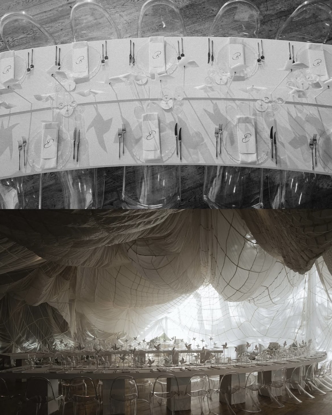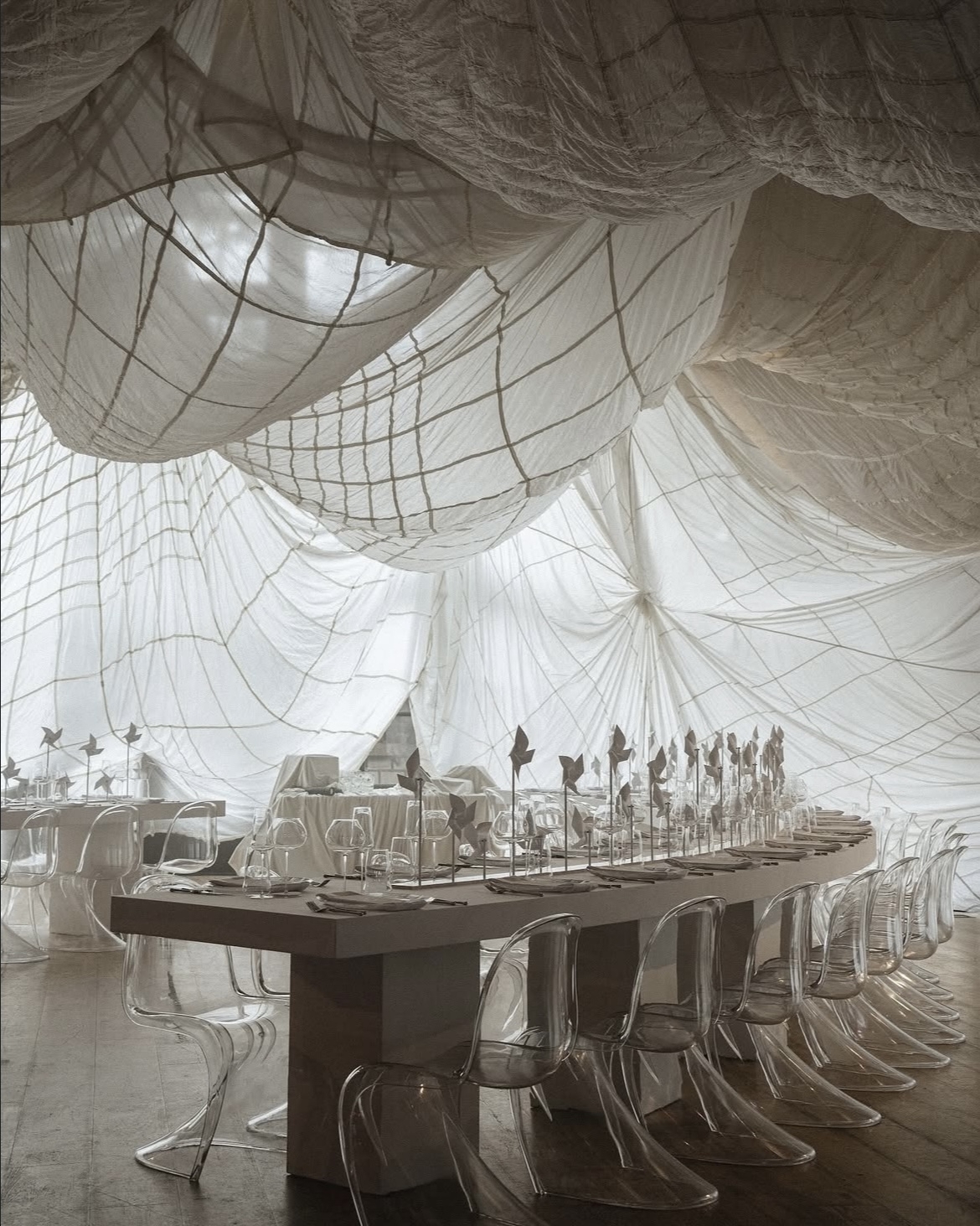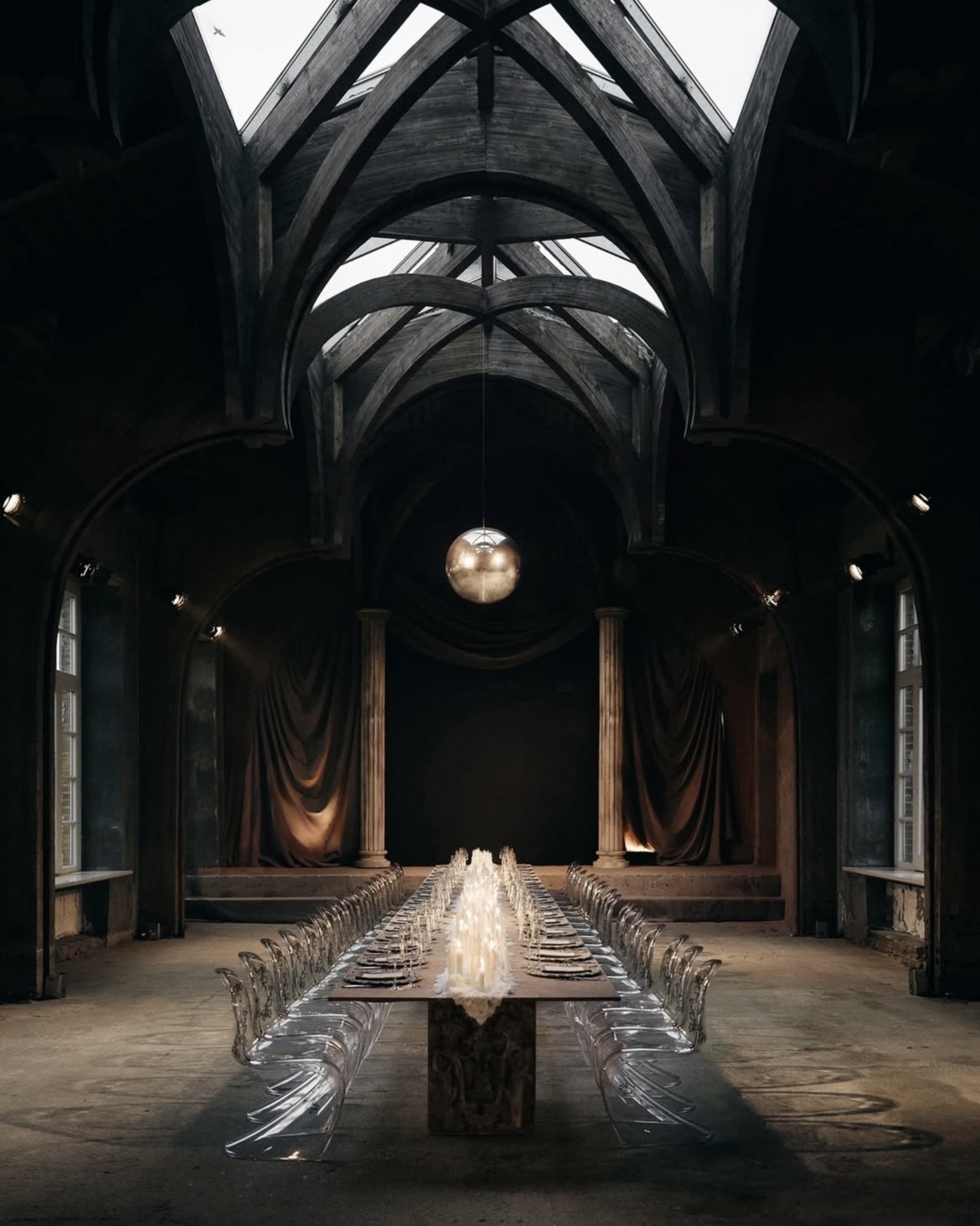 Идею «остановившегося времени» продолжили скатерти — они повторяли линии драпировок на стенах и будто развевались в воздухе. Эфемерности добавляли прозрачные стулья, вуаль на окнах и зеркальный потолок. А профессиональные прожекторы стали тем контрастным акцентом, который подчеркнул театральность момента.