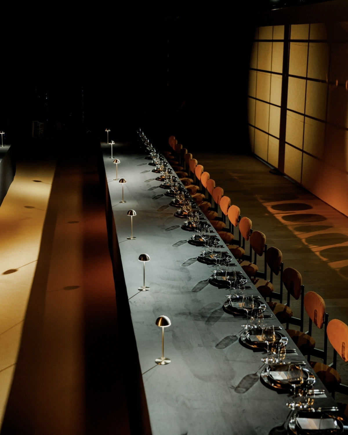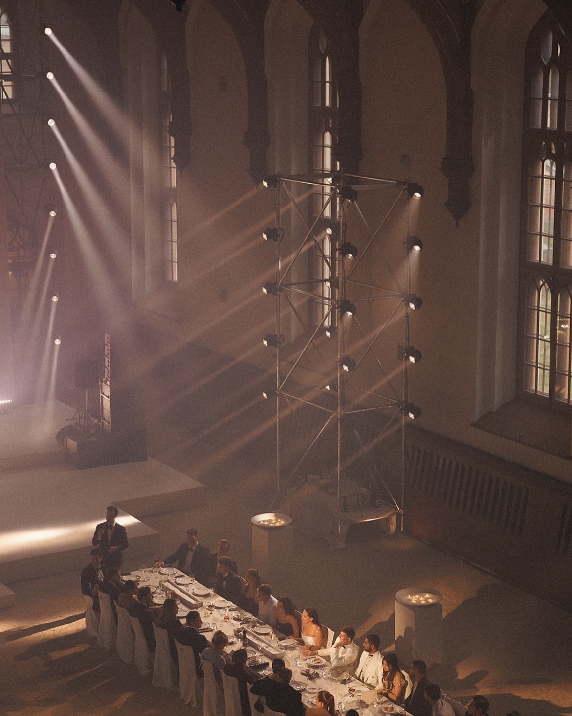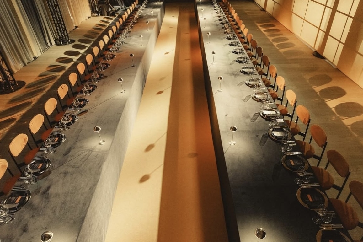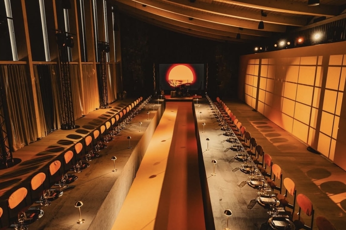 Концепция вечеринки в стиле мафии строилась на переосмыслении философии, форм и традиций. В основе — игра четких линий и теплая цветовая палитра. Закатное солнце внутри зала появилось благодаря проекции, а профессиональный свет создал иллюзию естественной тени. Настолько точную, что кадры выглядят словно сгенерированные — но за этой «идеальностью» стоит тонкая работа со светом и пространством.