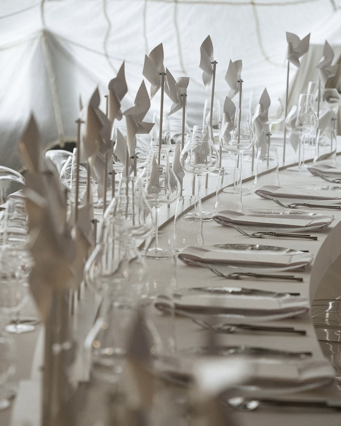 Изначально ужин планировался на улице, но погода внесла свои коррективы. Прозрачная крыша шатра стала частью замысла — и люстры-парашюты действительно «падали» с ясного неба, будто так и было задумано.