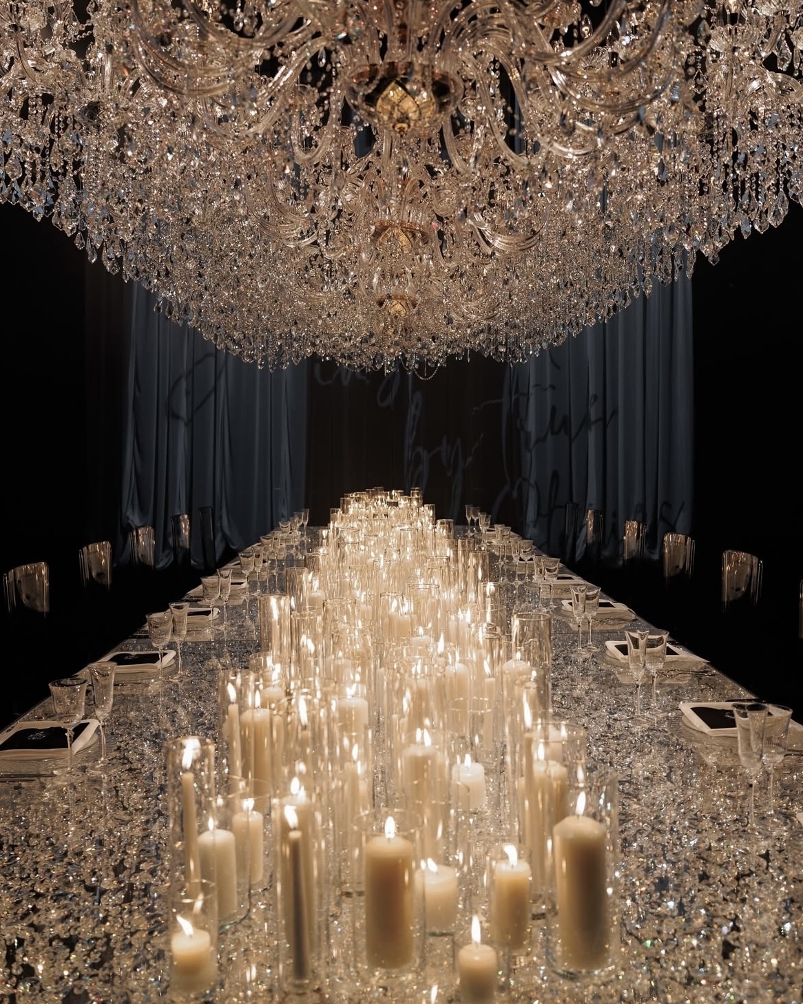 Переосмысленный ужин при свечах агентства We Show и студии декора Lid’s Eventhouse раскрыл традиционный формат буквально тысячей новых граней. Зеркальные поверхности многократно усилили свет и объем, наполнив темное пространство сиянием. В оформлении использовали 600 живых свечей, тысячи хрустальных деталей, стеклянный стол и теплое освещение. Все вместе создало эффект гипнотического светового шоу — настолько совершенного, что кажется, будто его просчитал искусственный интеллект. Но за этим сиянием стояла тонкая ручная работа и точное чувство света.