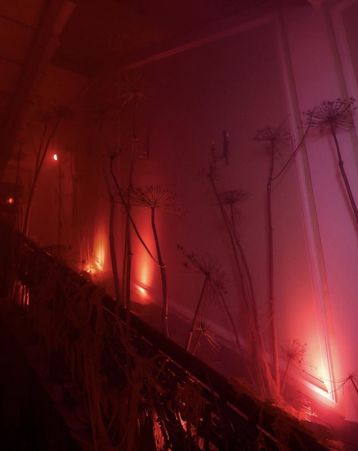 Здесь арт-инсталляция — портал в другой зал, пупырчатая пленка для релакса, сухой борщевик как отсылка к истории здания и красные нити, соединяющие все зоны и перекликающиеся с оттенком света.