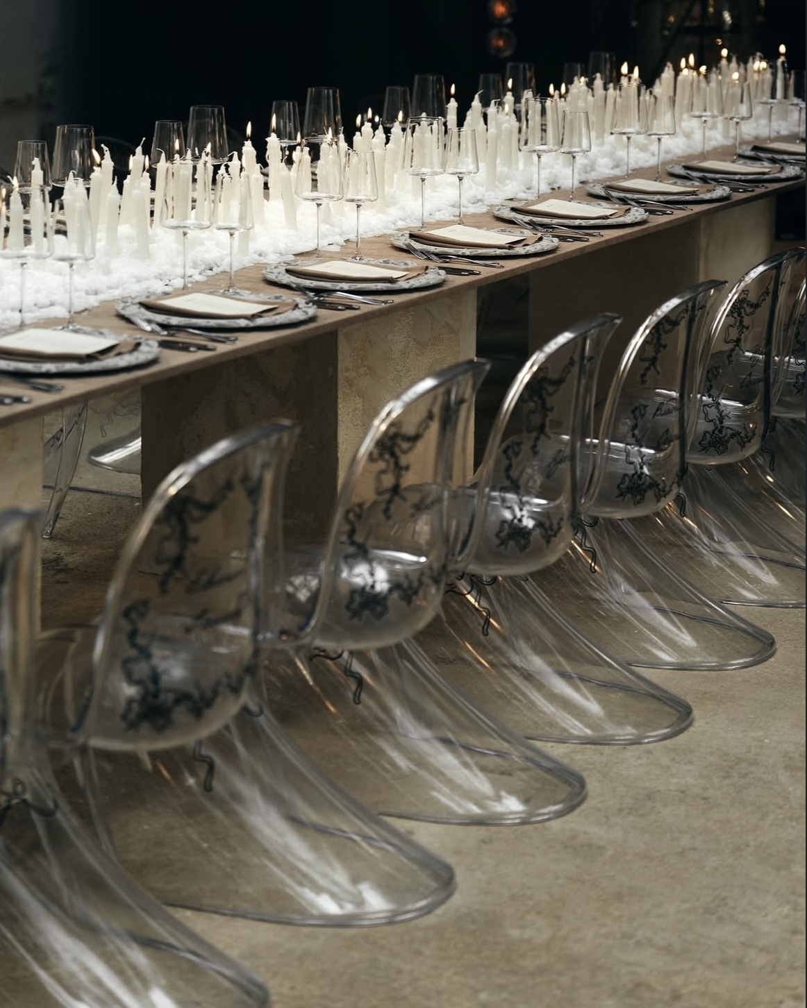 Основой концепции декора стала зона ужина. Стол продолжал «незаконченность» пространства, а за уют и легкость отвечали драпированные ткани на стенах, прозрачные, почти невесомые стулья, десятки белоснежных свечей как отсылка к свадебной истории (они также присутствовали и в общей зоне у лестниц) и большой металлический шар, в котором отражались огни. Снаружи здание тоже проапгрейдили: в течение недели художники расписывали фасад, а затем обрамили изображение трех голубков — символ жениха, невесты и их сына — драпированной тканью в цвет той, что украшала пространство внутри.